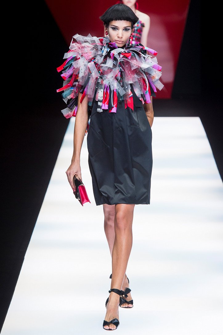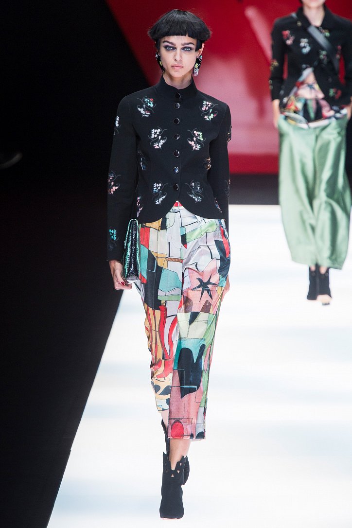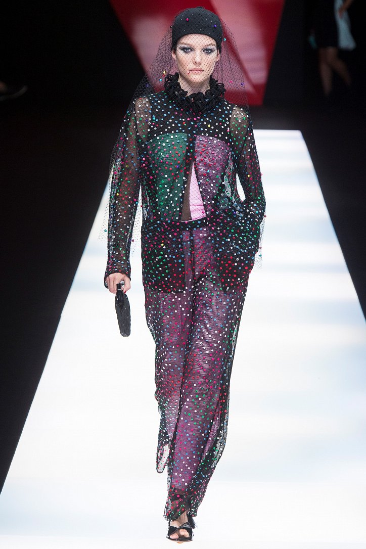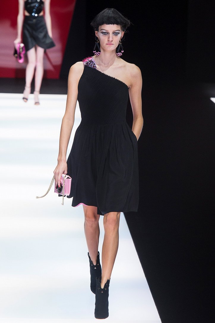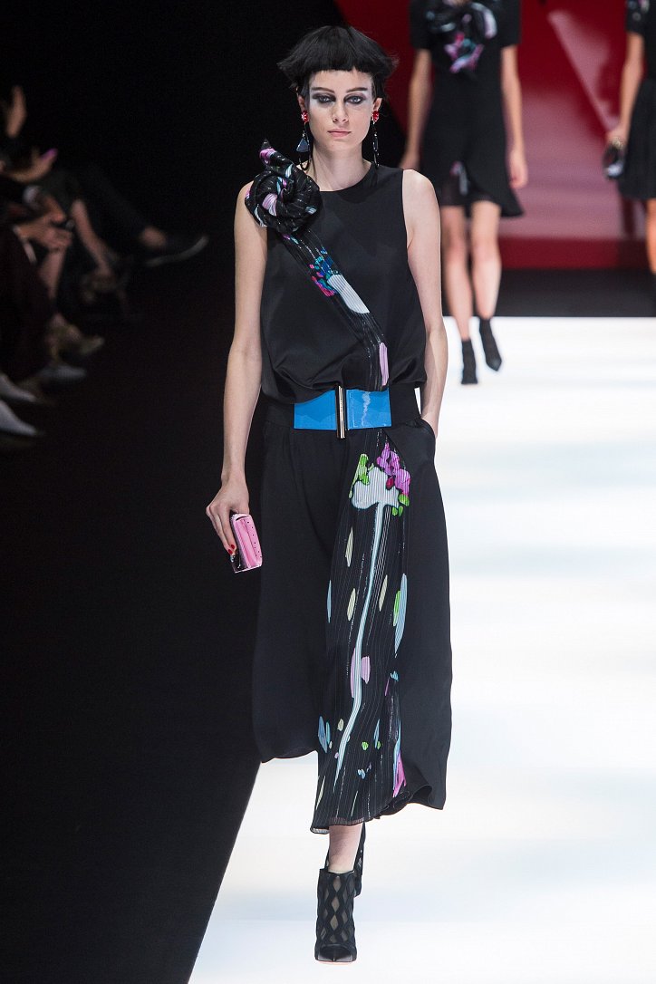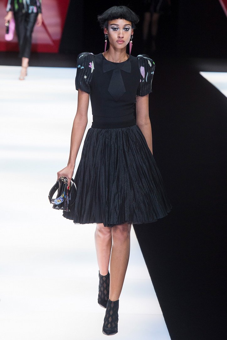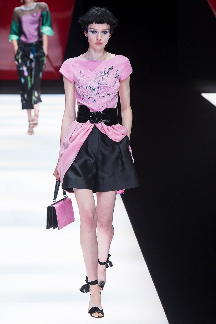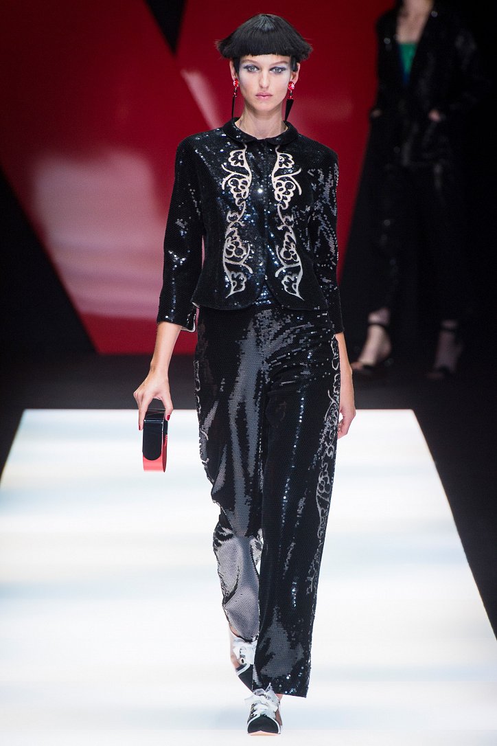 Наиболее эффектно яркие цветы смотрятся на черном фоне. Об этом еще раз напомнил нам маэстро Джорджио Армани. Впрочем, вся коллекция Giorgio Armani весна-лето 2018 – это игра на контрастах. Строгий крой перемежается с легкомысленными рюшиками, полупрозрачные модели из шифона – с плотными жакетами с асимметричной застежкой. Объединяло коллекцию одно – ощущение праздника. Яркая цветочная палитра в сочетании с черным цветом напоминала фейерверк в ночном небе. Мерцающий атлас и металлизированные ткани, усыпанные блесками брюки, топы и удивительной красоты черные брючные костюмы, шарфики и боа, похожие на новогодние гирлянды, и берет с помпонами-конфетти – все в лучших традициях Армани!