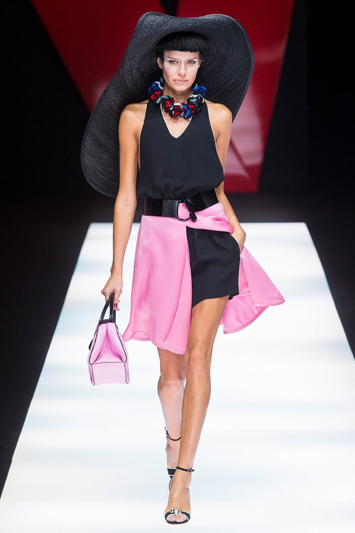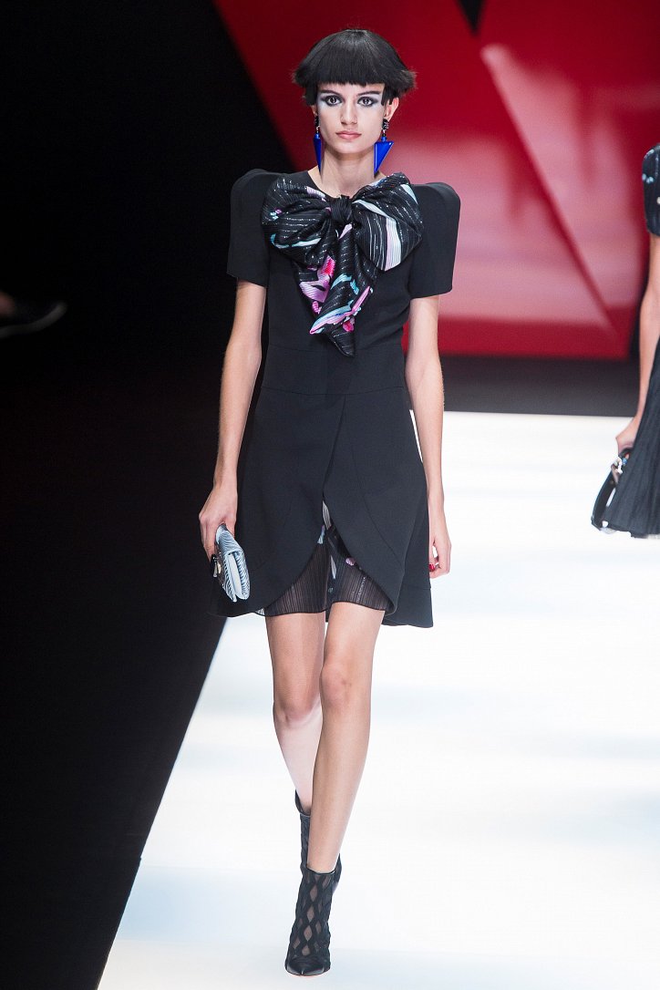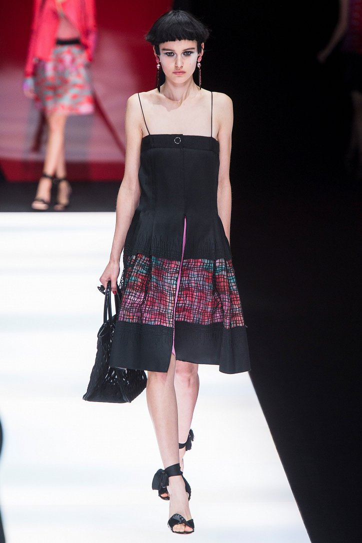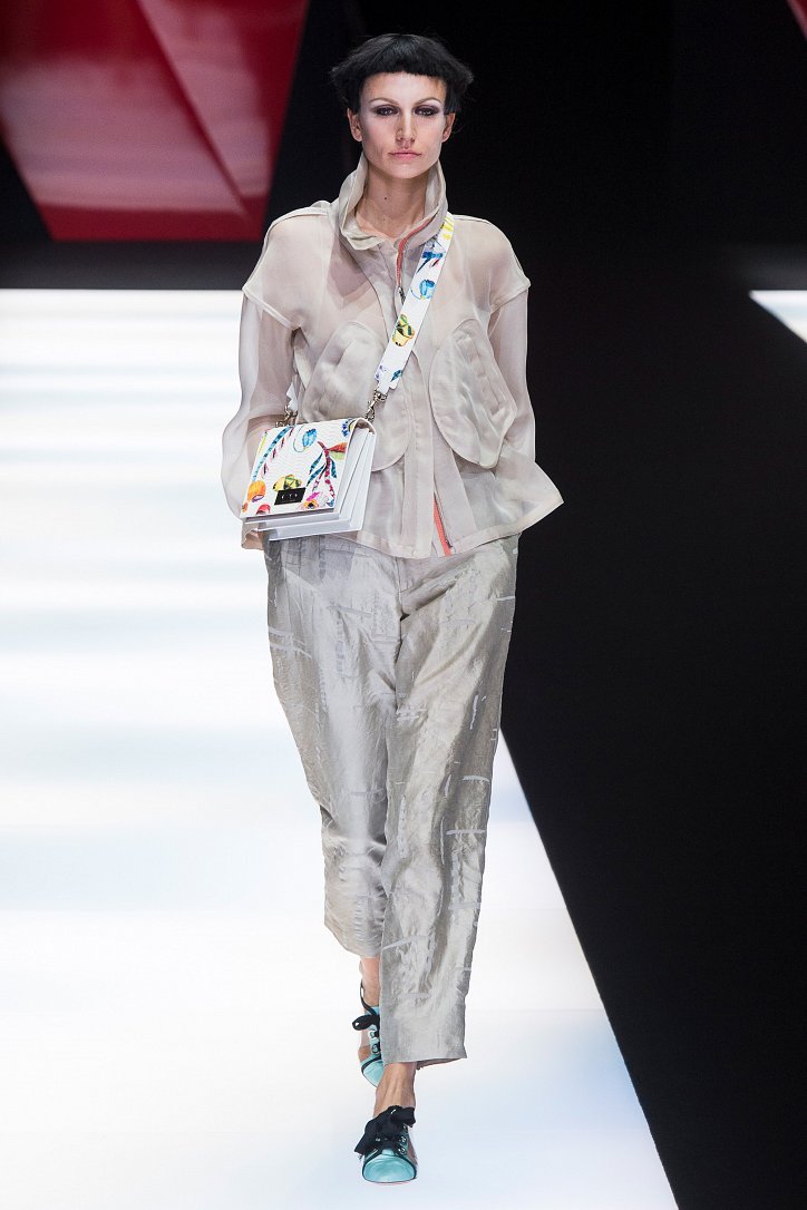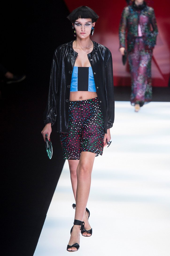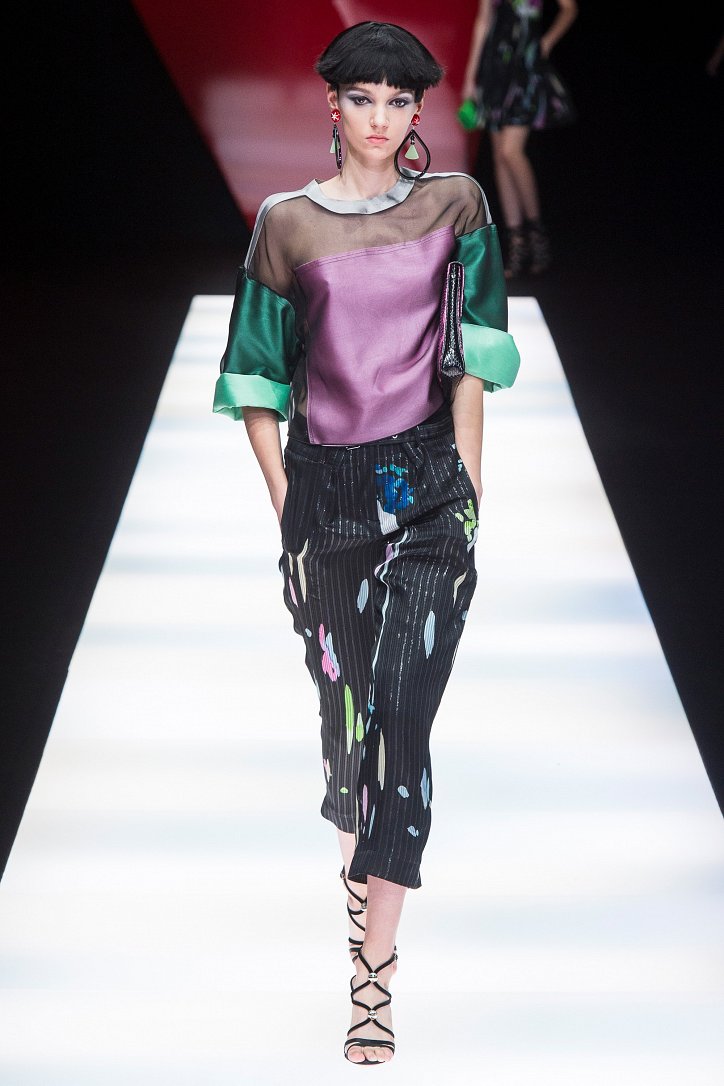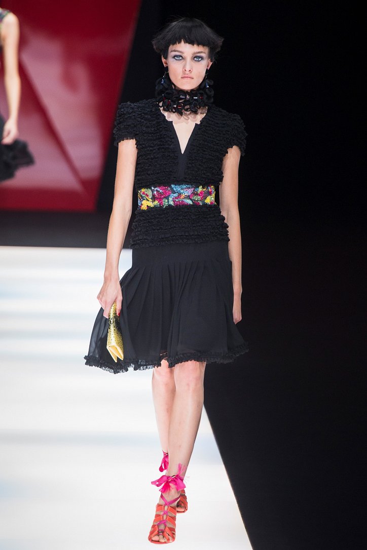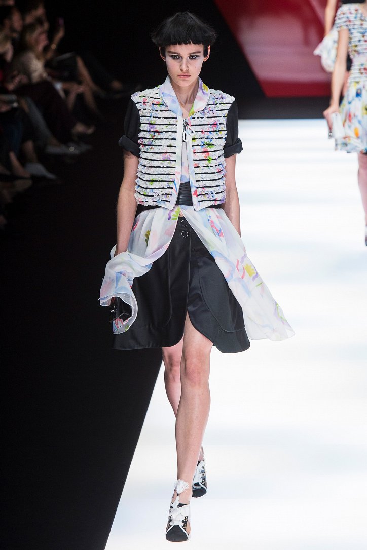 Наиболее эффектно яркие цветы смотрятся на черном фоне. Об этом еще раз напомнил нам маэстро Джорджио Армани. Впрочем, вся коллекция Giorgio Armani весна-лето 2018 – это игра на контрастах. Строгий крой перемежается с легкомысленными рюшиками, полупрозрачные модели из шифона – с плотными жакетами с асимметричной застежкой. Объединяло коллекцию одно – ощущение праздника. Яркая цветочная палитра в сочетании с черным цветом напоминала фейерверк в ночном небе. Мерцающий атлас и металлизированные ткани, усыпанные блесками брюки, топы и удивительной красоты черные брючные костюмы, шарфики и боа, похожие на новогодние гирлянды, и берет с помпонами-конфетти – все в лучших традициях Армани!