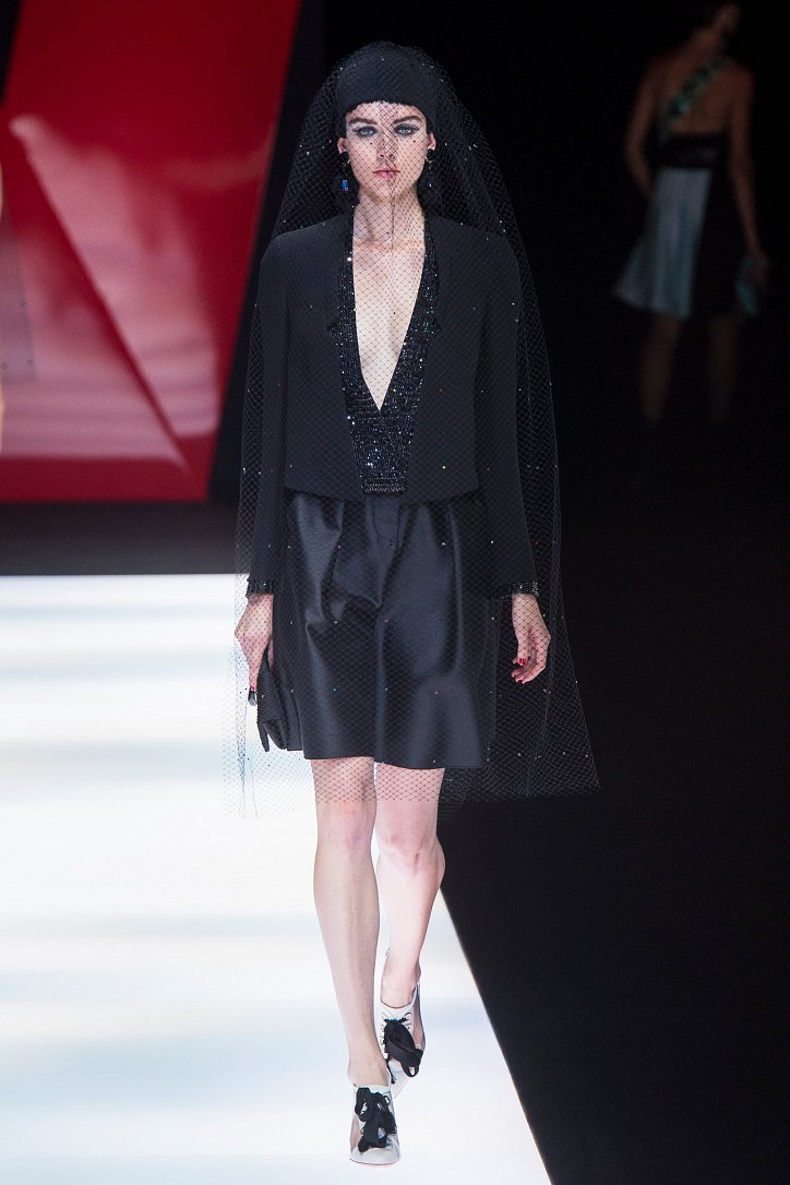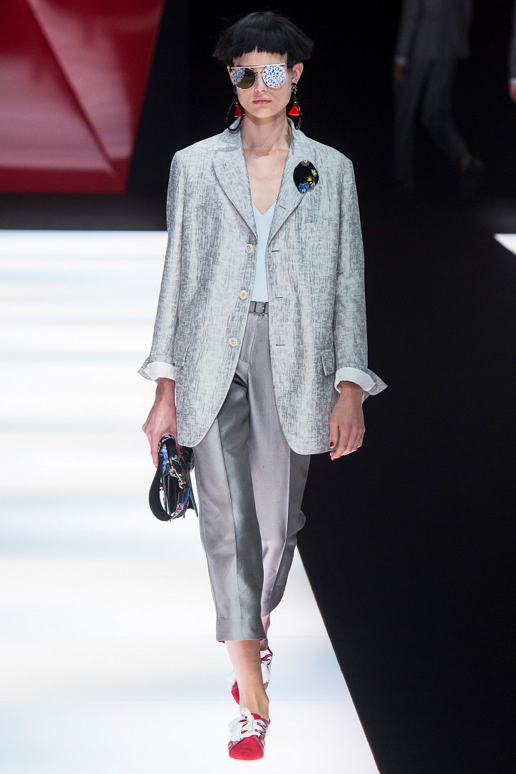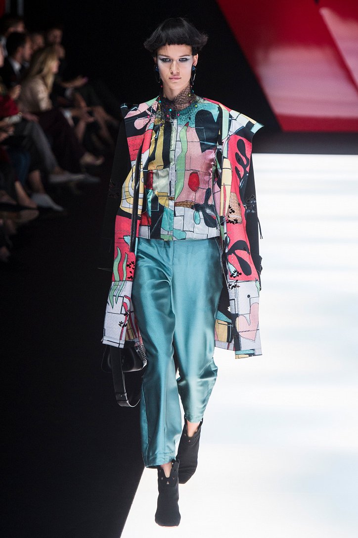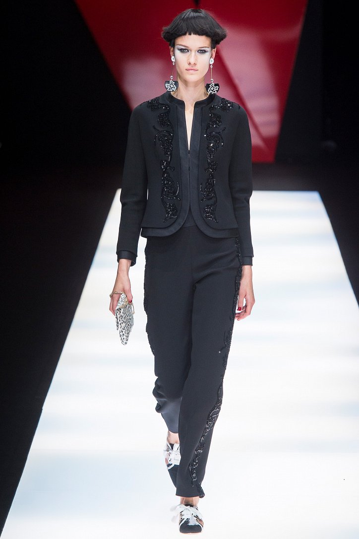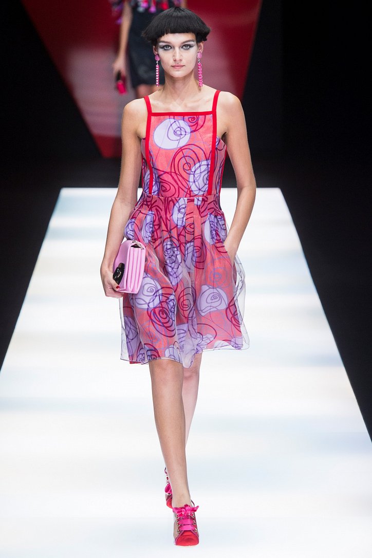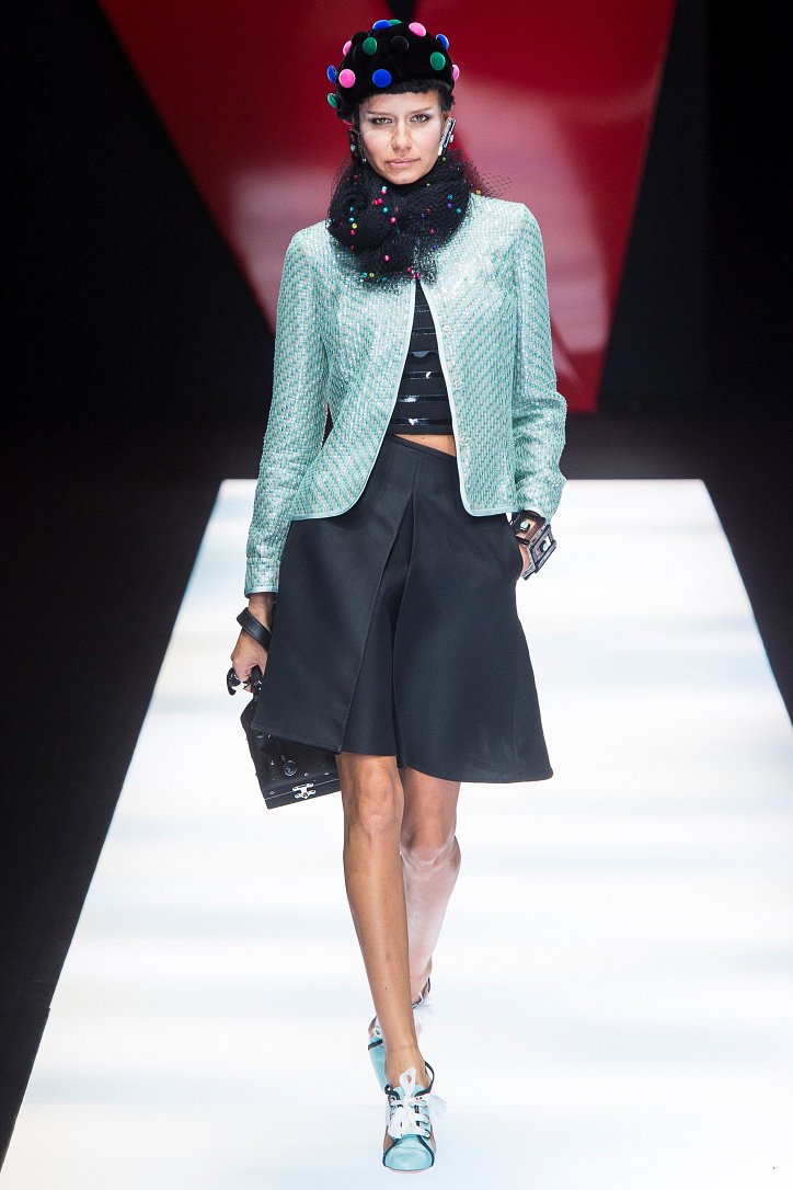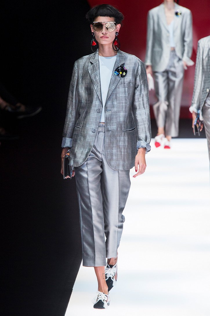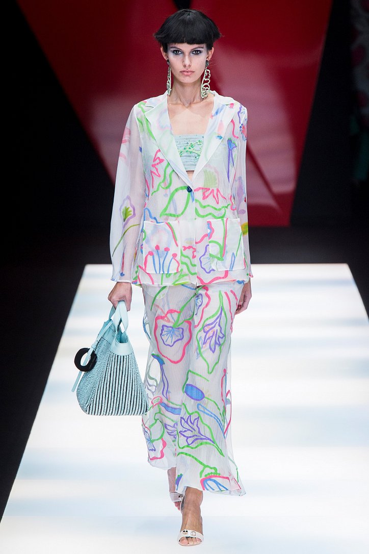 Наиболее эффектно яркие цветы смотрятся на черном фоне. Об этом еще раз напомнил нам маэстро Джорджио Армани. Впрочем, вся коллекция Giorgio Armani весна-лето 2018 – это игра на контрастах. Строгий крой перемежается с легкомысленными рюшиками, полупрозрачные модели из шифона – с плотными жакетами с асимметричной застежкой. Объединяло коллекцию одно – ощущение праздника. Яркая цветочная палитра в сочетании с черным цветом напоминала фейерверк в ночном небе. Мерцающий атлас и металлизированные ткани, усыпанные блесками брюки, топы и удивительной красоты черные брючные костюмы, шарфики и боа, похожие на новогодние гирлянды, и берет с помпонами-конфетти – все в лучших традициях Армани!