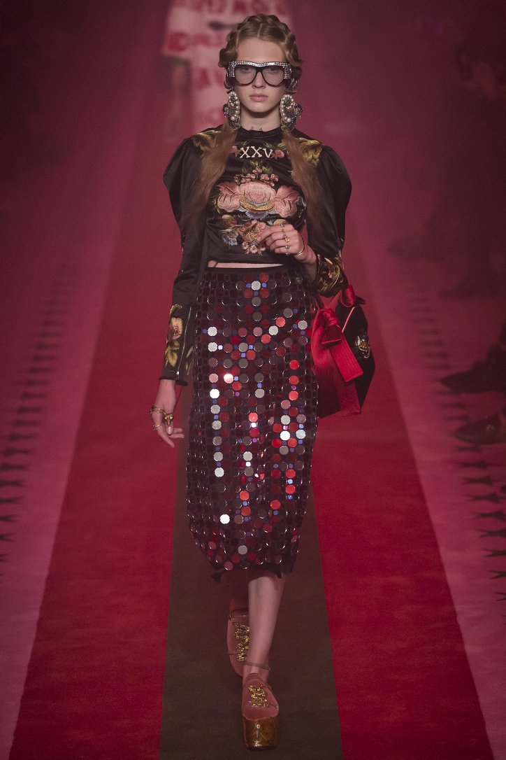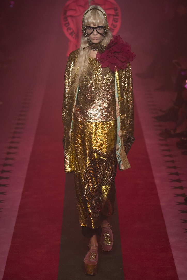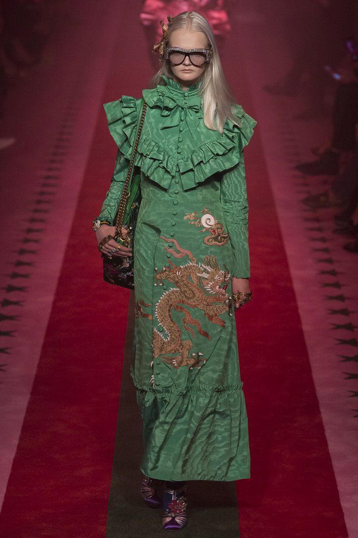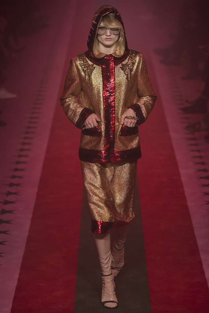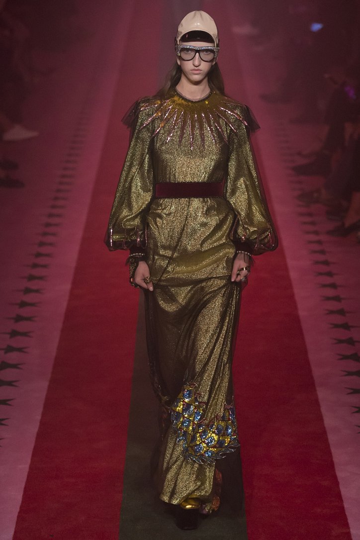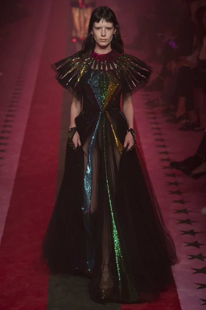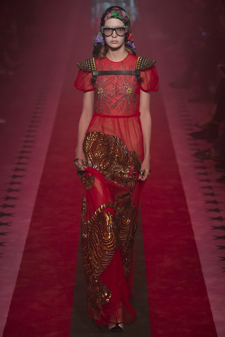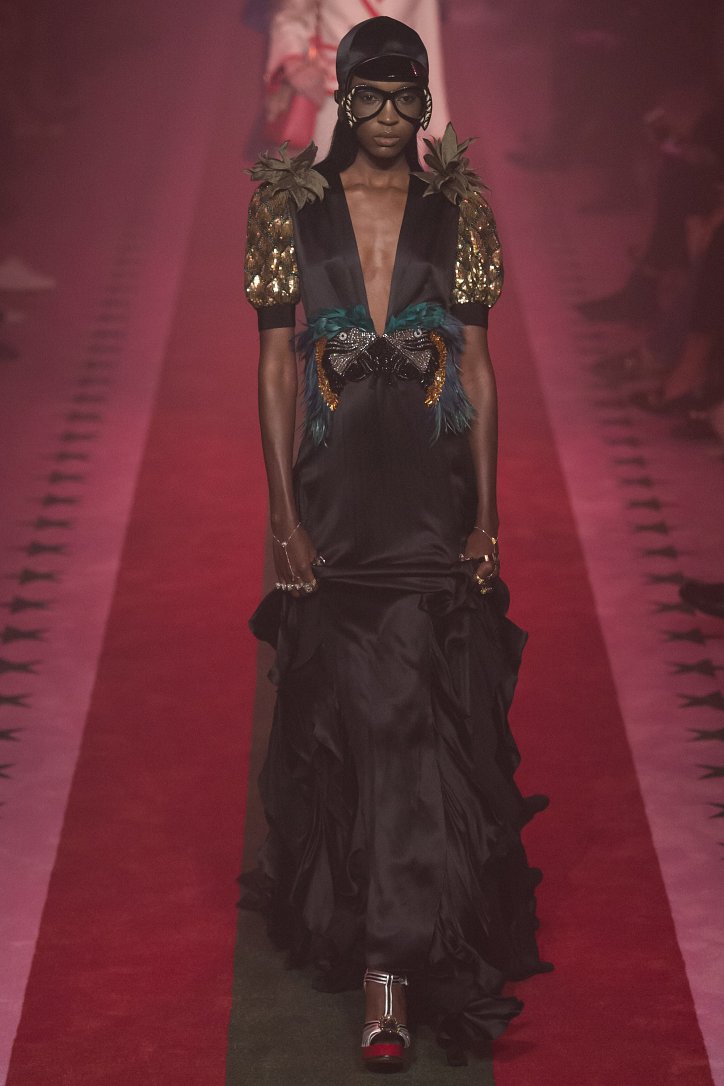 По уже сложившейся традиции, Алессандро Микеле удивлял гостей показа собственной трактовкой концепции дома моды Gucci. На этот раз дизайнер, словно змей-искуситель, красовавшийся на приглашениях, соблазнял гостей роскошными фатиновыми платьями, мерцанием тканей и пайеток, принтами и аппликациями с изображением королевских гербов, львов, драконов и зебр, «пижамными» костюмами, атласными кюлотами, принтованными шубами, вышитыми цветами, множеством оборок и рюшей и, конечно же, любимыми дизайнером огромными цветными очками.