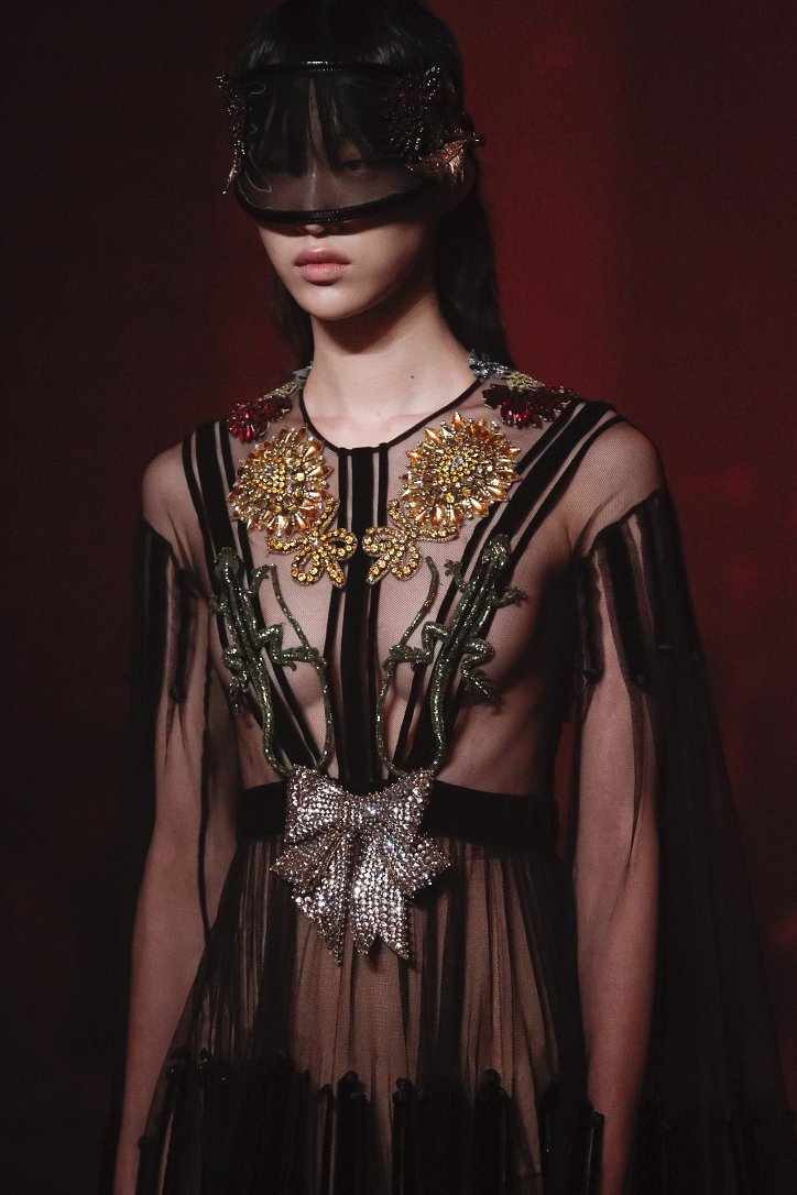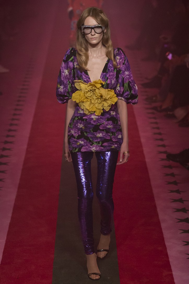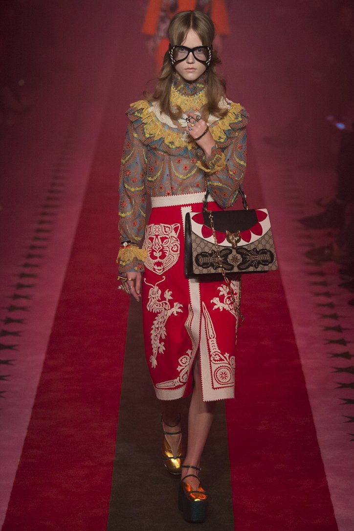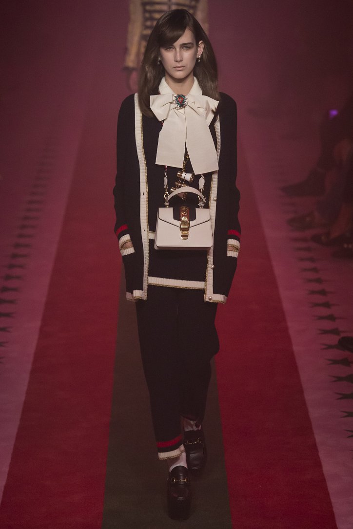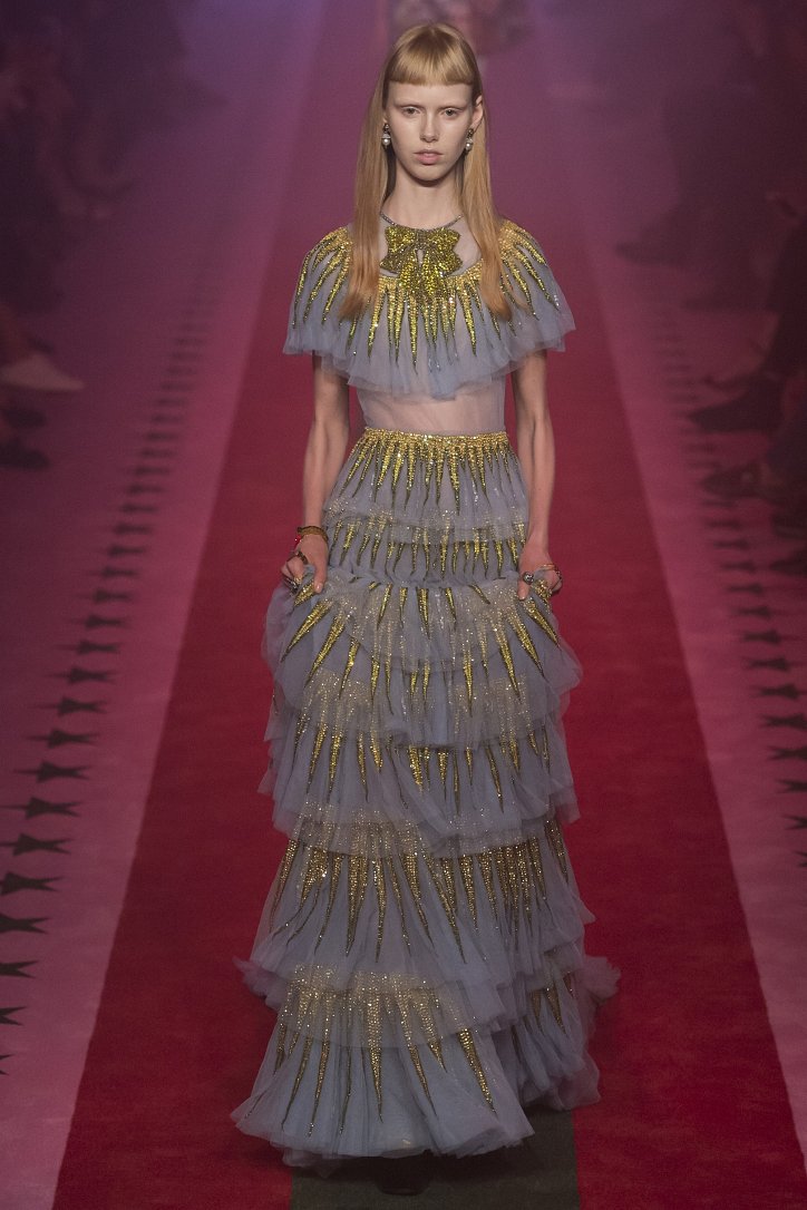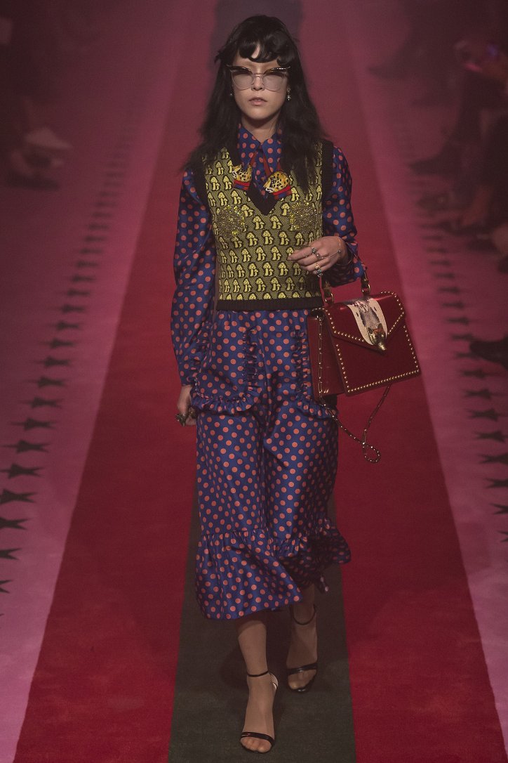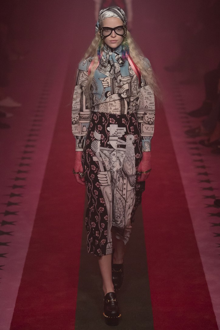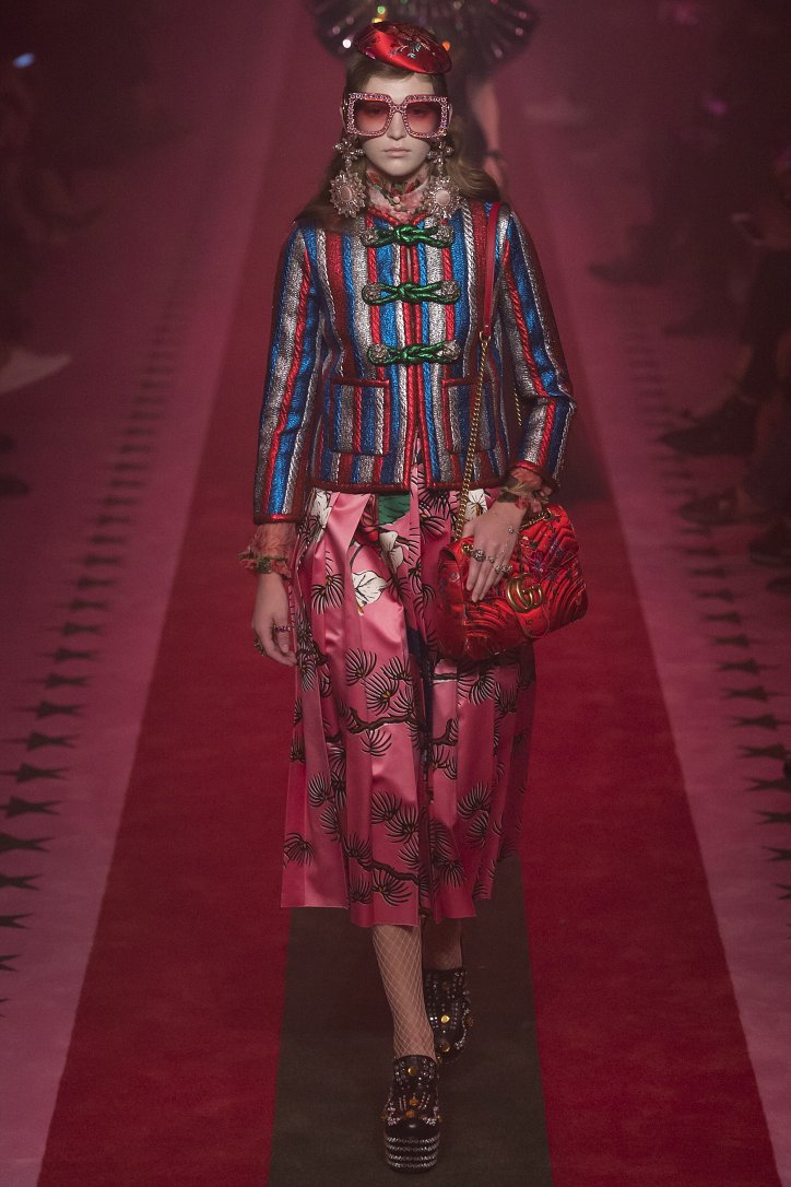 По уже сложившейся традиции, Алессандро Микеле удивлял гостей показа собственной трактовкой концепции дома моды Gucci. На этот раз дизайнер, словно змей-искуситель, красовавшийся на приглашениях, соблазнял гостей роскошными фатиновыми платьями, мерцанием тканей и пайеток, принтами и аппликациями с изображением королевских гербов, львов, драконов и зебр, «пижамными» костюмами, атласными кюлотами, принтованными шубами, вышитыми цветами, множеством оборок и рюшей и, конечно же, любимыми дизайнером огромными цветными очками.