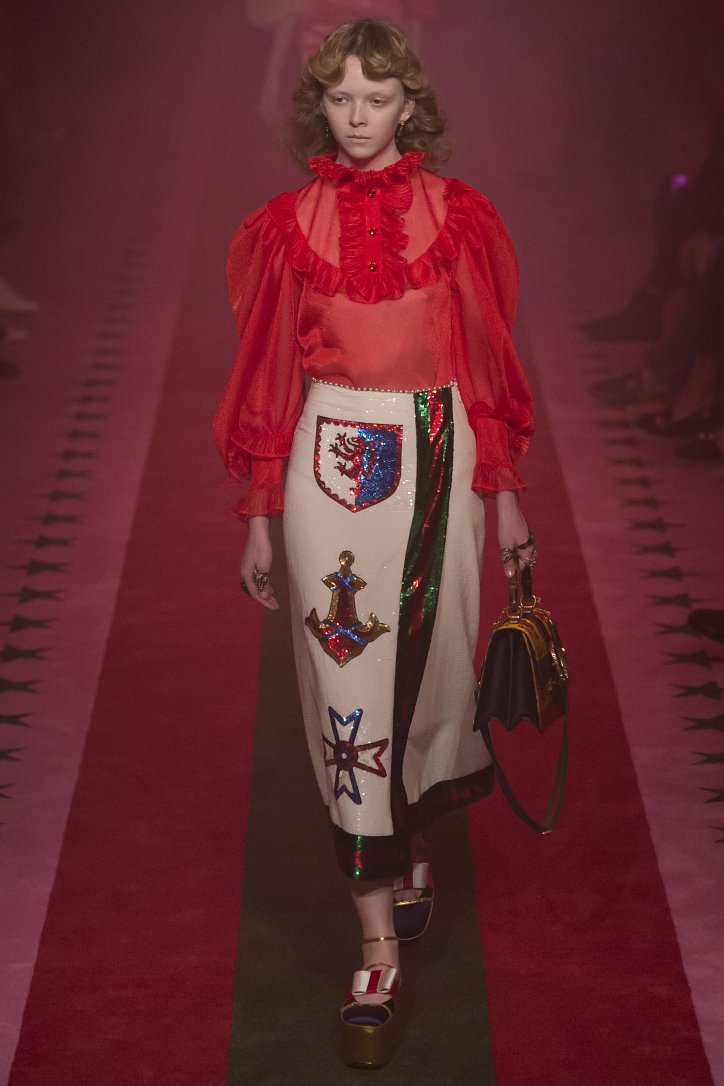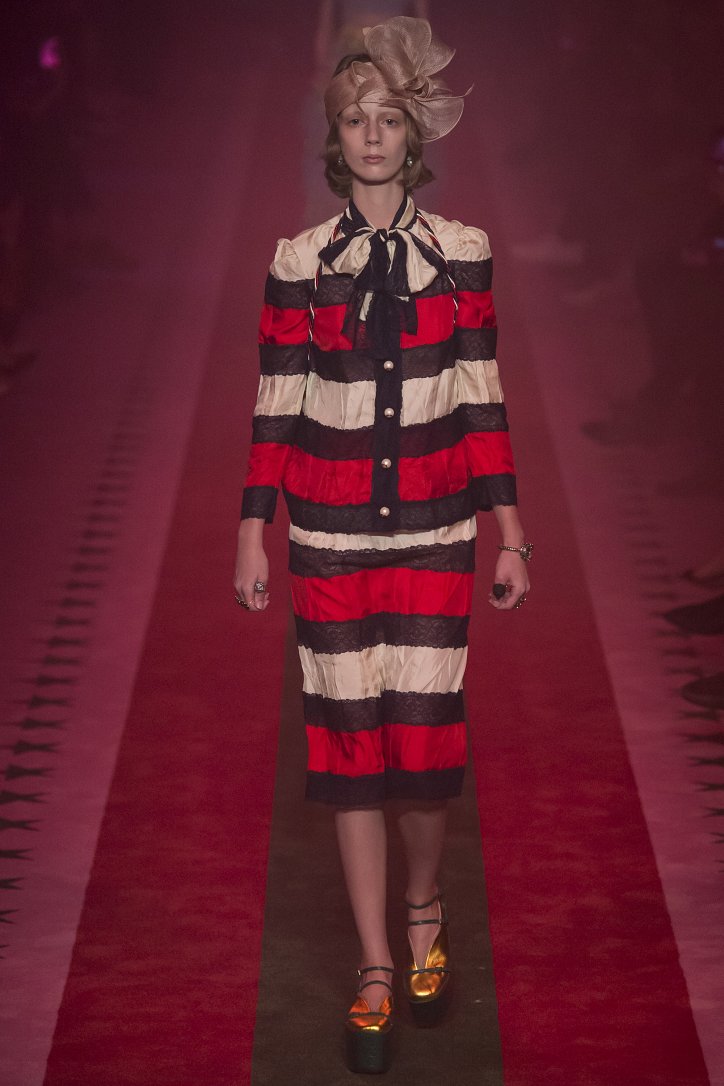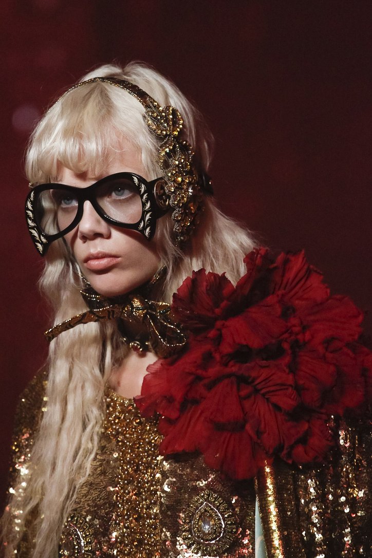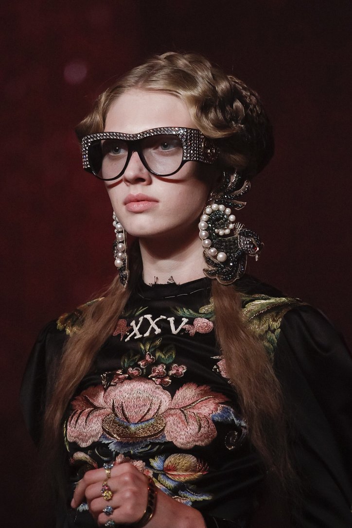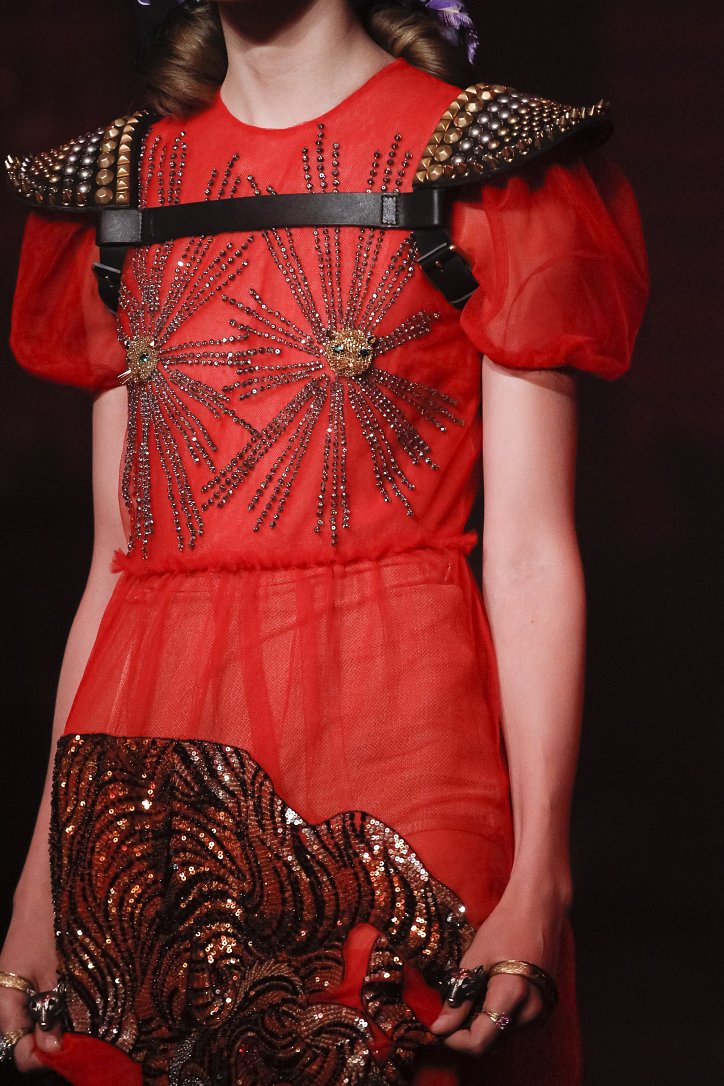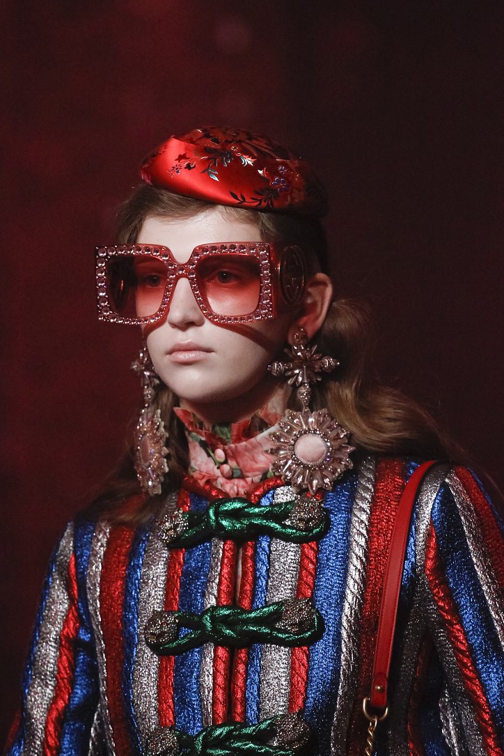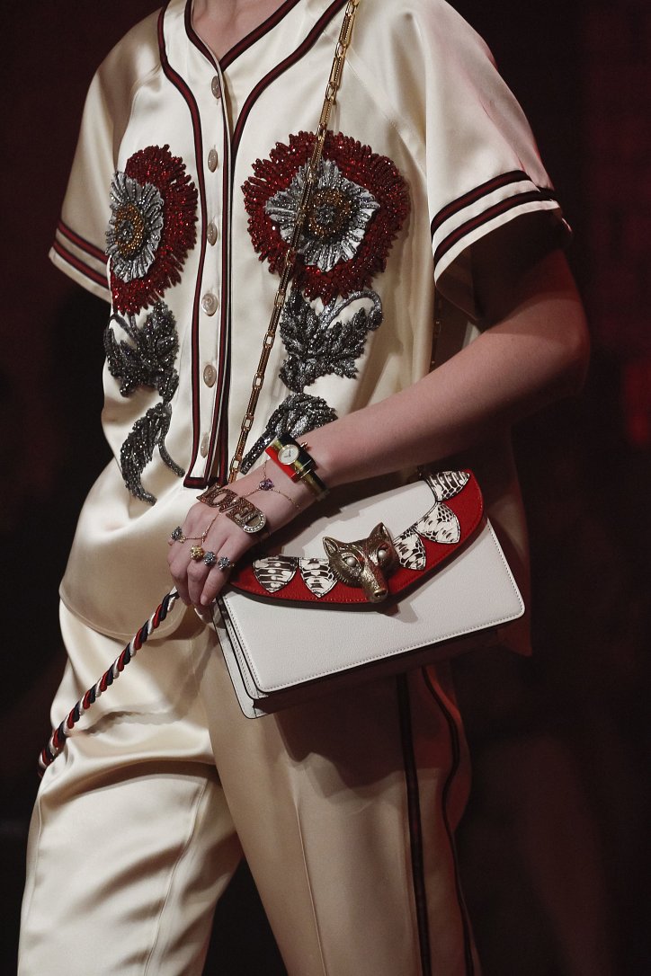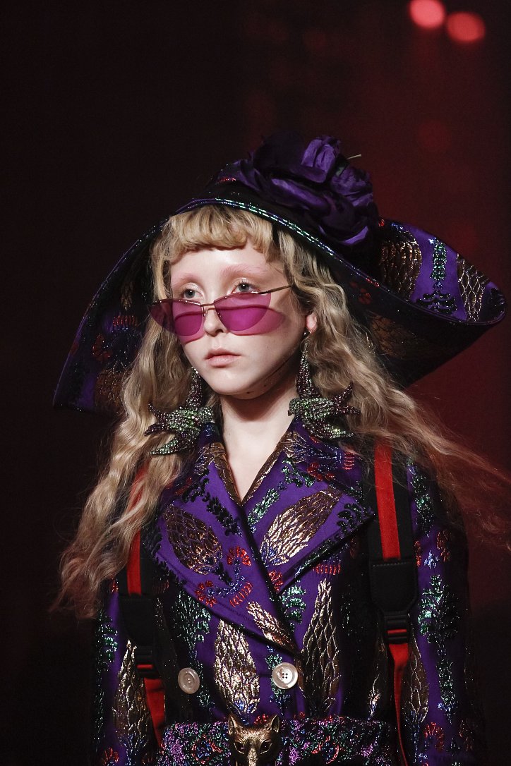 По уже сложившейся традиции, Алессандро Микеле удивлял гостей показа собственной трактовкой концепции дома моды Gucci. На этот раз дизайнер, словно змей-искуситель, красовавшийся на приглашениях, соблазнял гостей роскошными фатиновыми платьями, мерцанием тканей и пайеток, принтами и аппликациями с изображением королевских гербов, львов, драконов и зебр, «пижамными» костюмами, атласными кюлотами, принтованными шубами, вышитыми цветами, множеством оборок и рюшей и, конечно же, любимыми дизайнером огромными цветными очками.