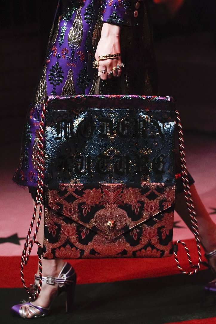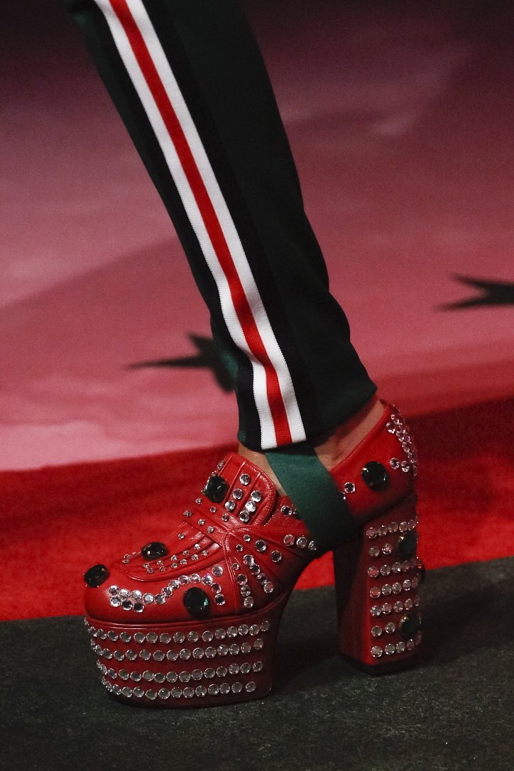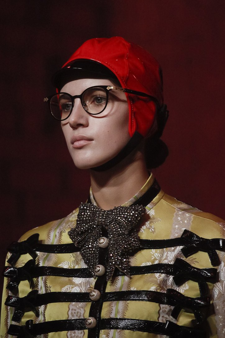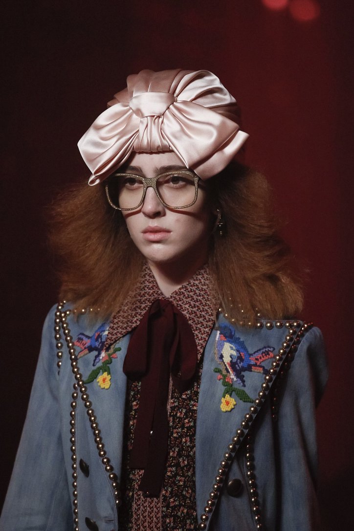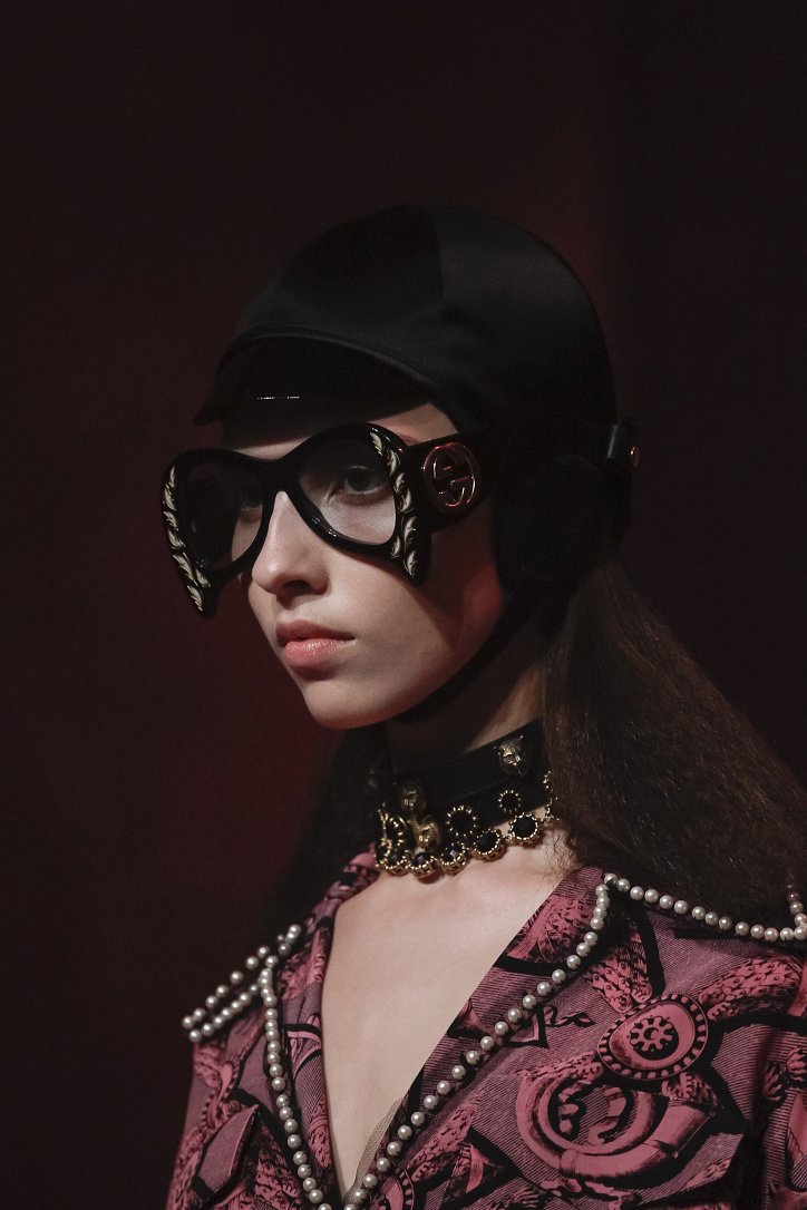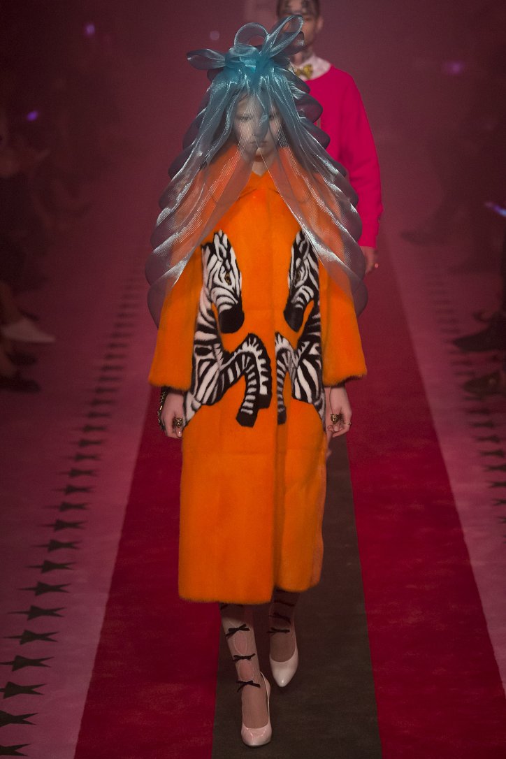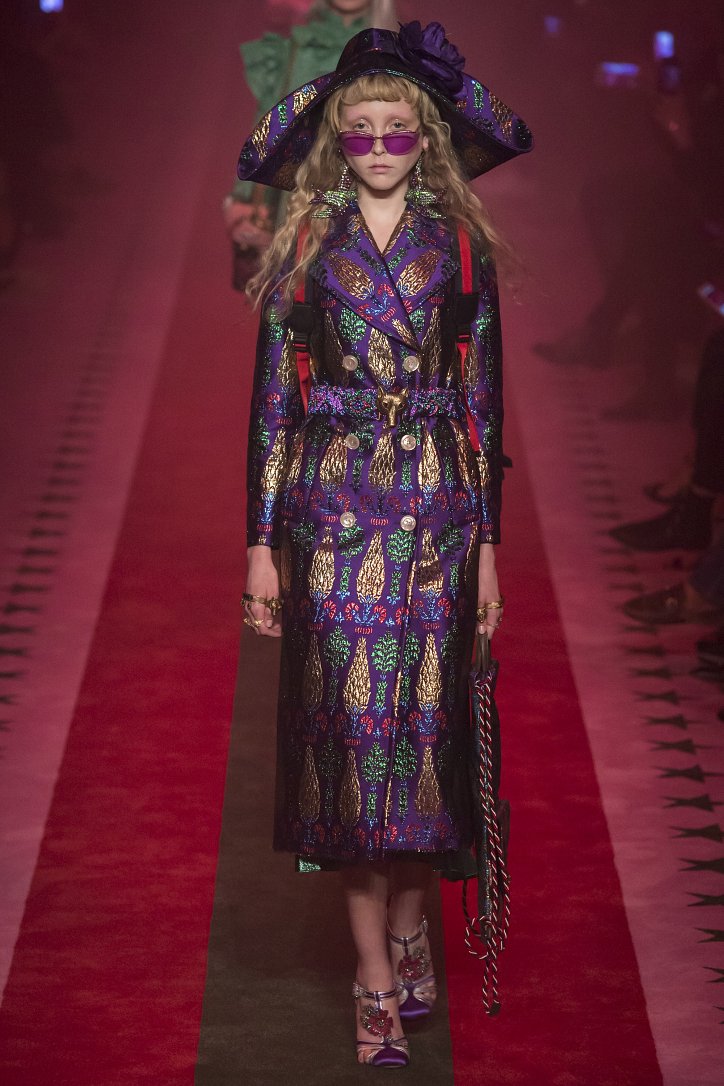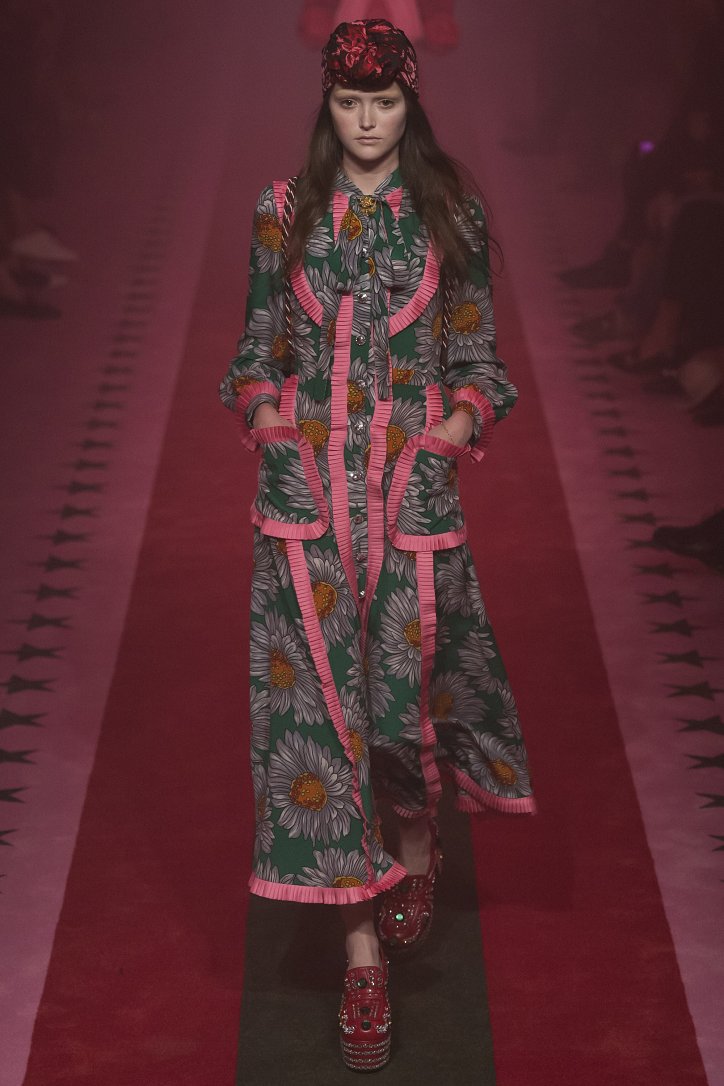 По уже сложившейся традиции, Алессандро Микеле удивлял гостей показа собственной трактовкой концепции дома моды Gucci. На этот раз дизайнер, словно змей-искуситель, красовавшийся на приглашениях, соблазнял гостей роскошными фатиновыми платьями, мерцанием тканей и пайеток, принтами и аппликациями с изображением королевских гербов, львов, драконов и зебр, «пижамными» костюмами, атласными кюлотами, принтованными шубами, вышитыми цветами, множеством оборок и рюшей и, конечно же, любимыми дизайнером огромными цветными очками.