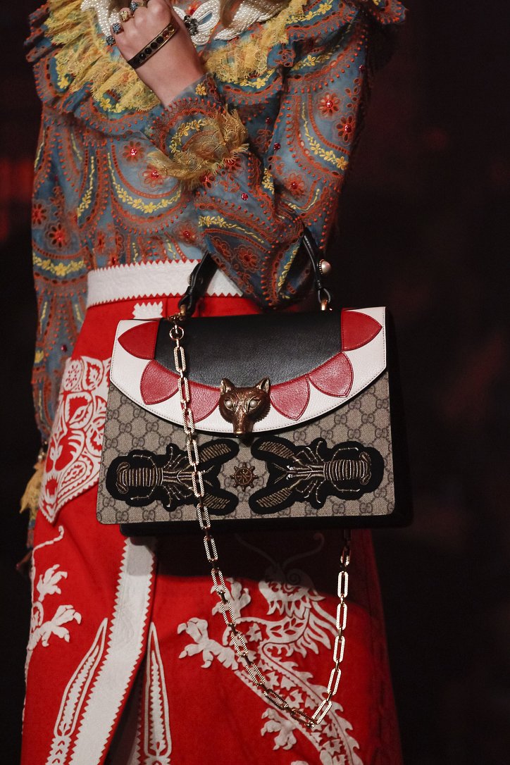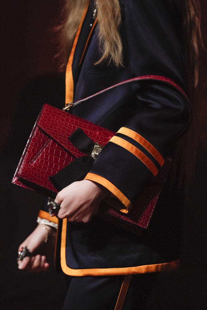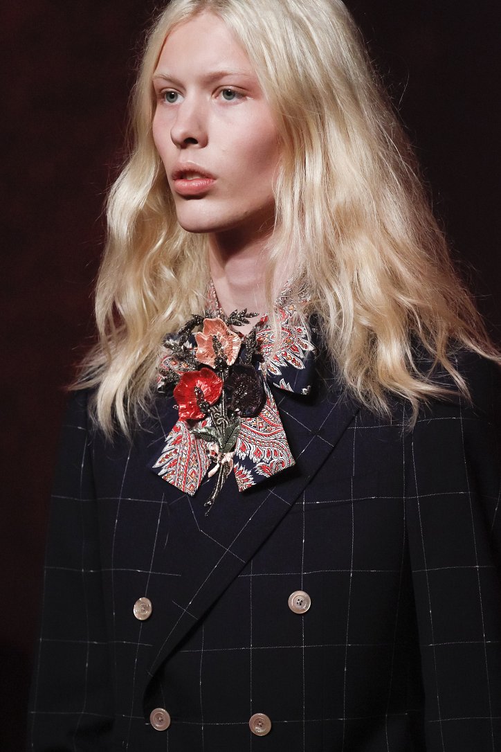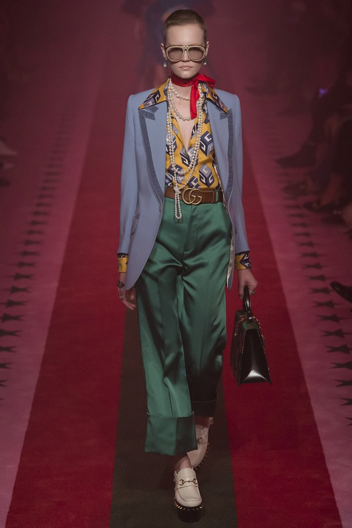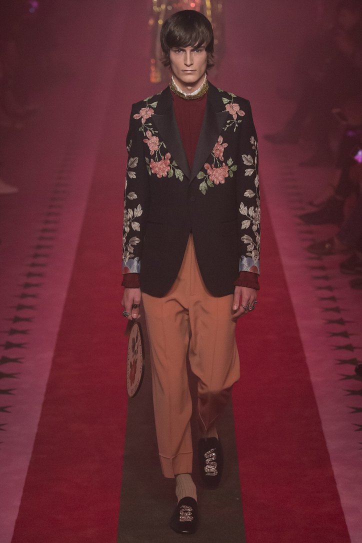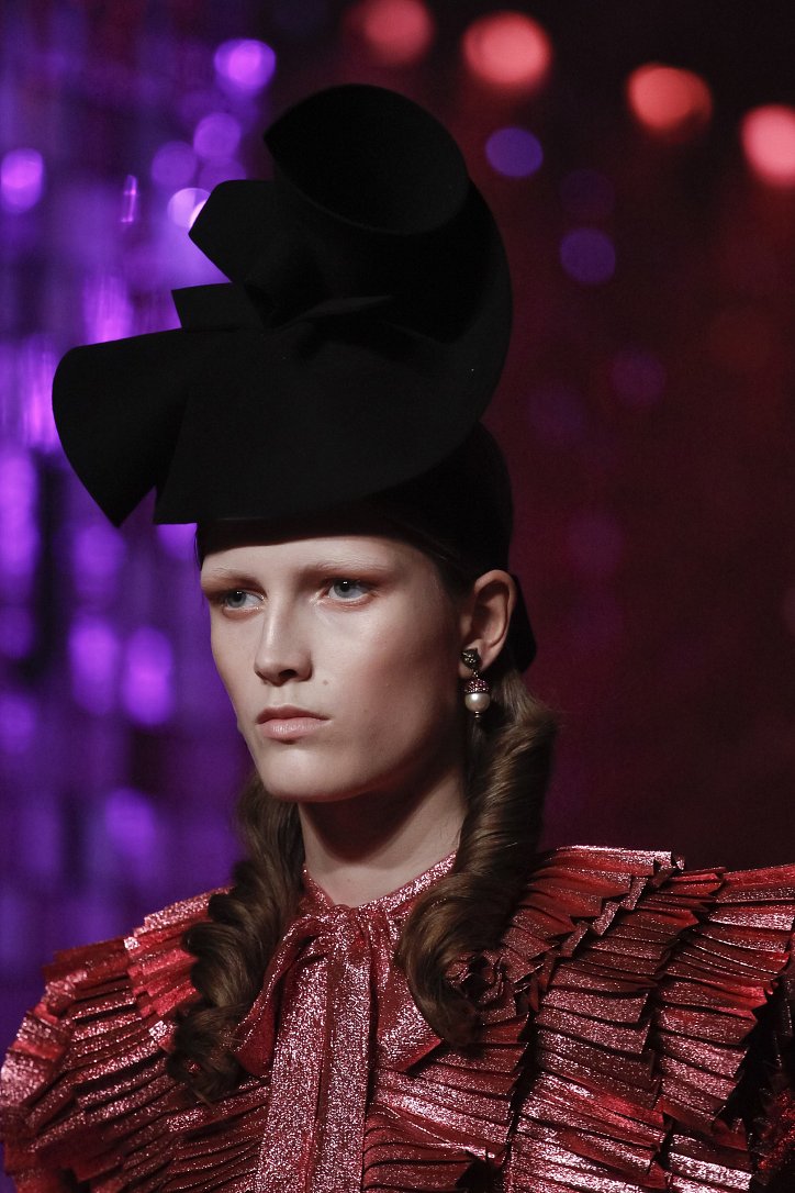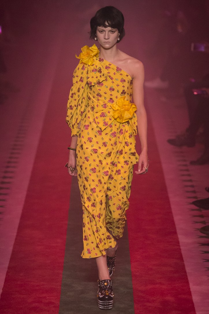 По уже сложившейся традиции, Алессандро Микеле удивлял гостей показа собственной трактовкой концепции дома моды Gucci. На этот раз дизайнер, словно змей-искуситель, красовавшийся на приглашениях, соблазнял гостей роскошными фатиновыми платьями, мерцанием тканей и пайеток, принтами и аппликациями с изображением королевских гербов, львов, драконов и зебр, «пижамными» костюмами, атласными кюлотами, принтованными шубами, вышитыми цветами, множеством оборок и рюшей и, конечно же, любимыми дизайнером огромными цветными очками.