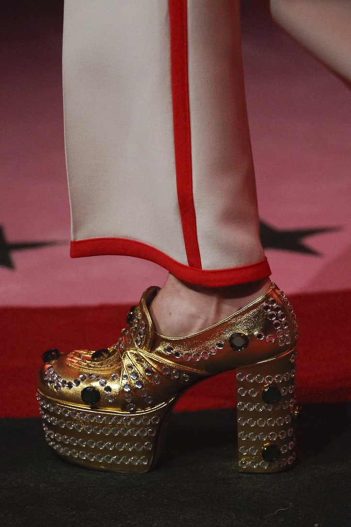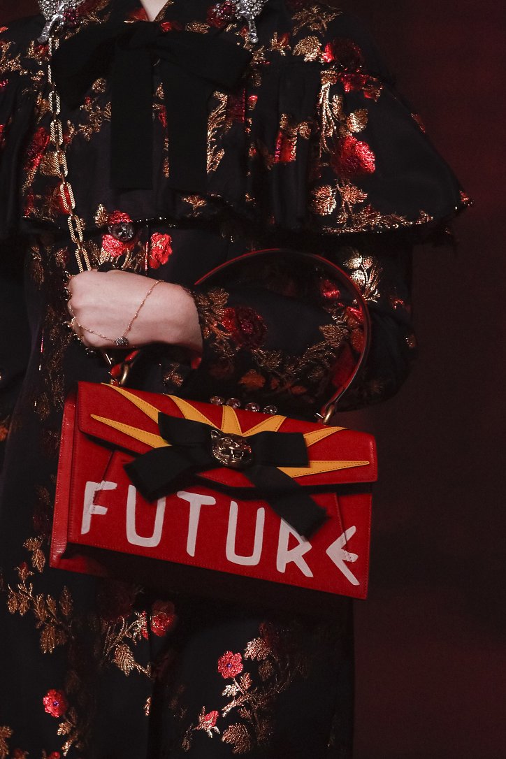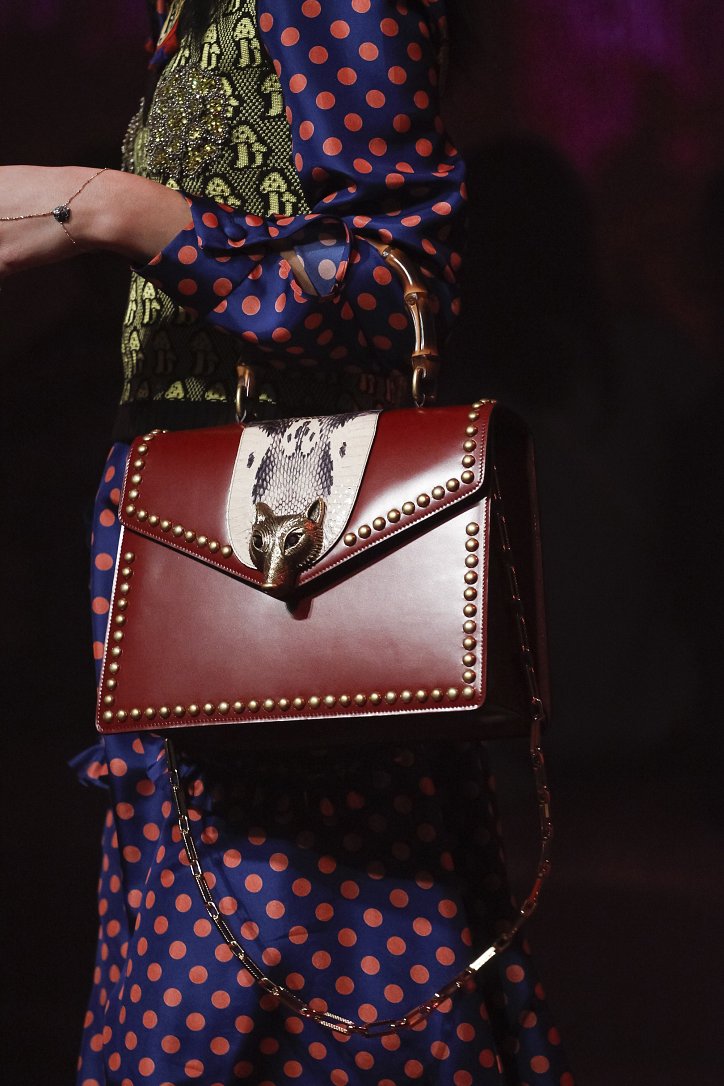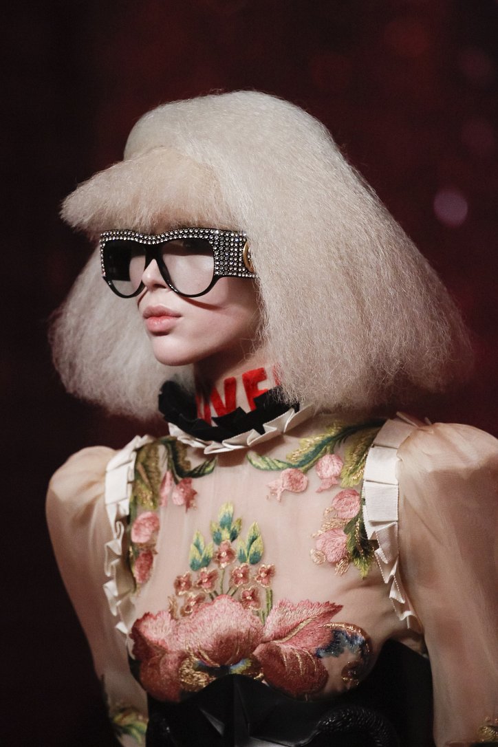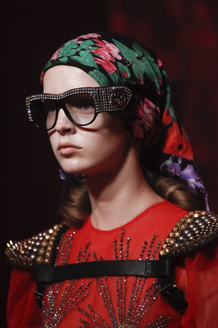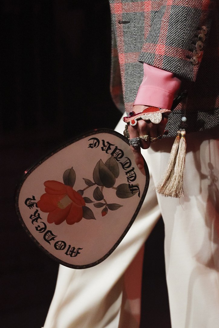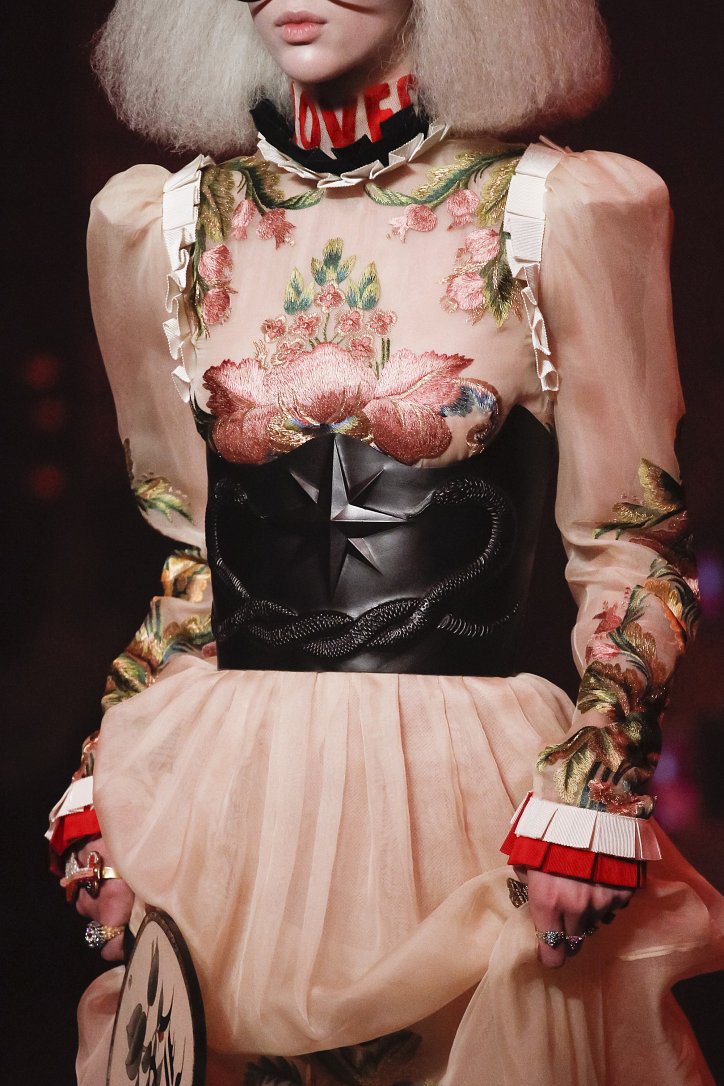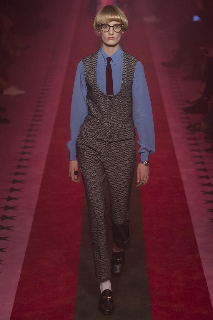 По уже сложившейся традиции, Алессандро Микеле удивлял гостей показа собственной трактовкой концепции дома моды Gucci. На этот раз дизайнер, словно змей-искуситель, красовавшийся на приглашениях, соблазнял гостей роскошными фатиновыми платьями, мерцанием тканей и пайеток, принтами и аппликациями с изображением королевских гербов, львов, драконов и зебр, «пижамными» костюмами, атласными кюлотами, принтованными шубами, вышитыми цветами, множеством оборок и рюшей и, конечно же, любимыми дизайнером огромными цветными очками.