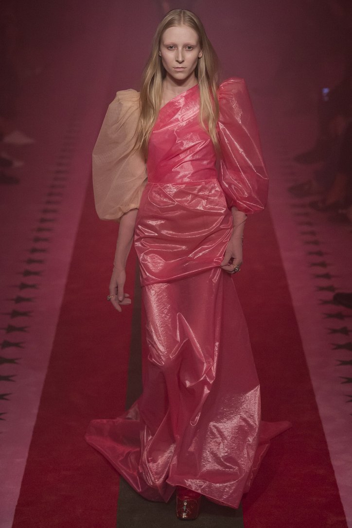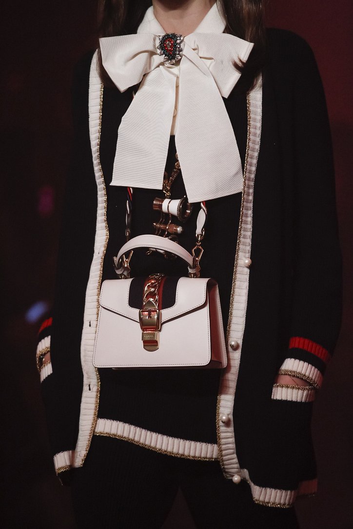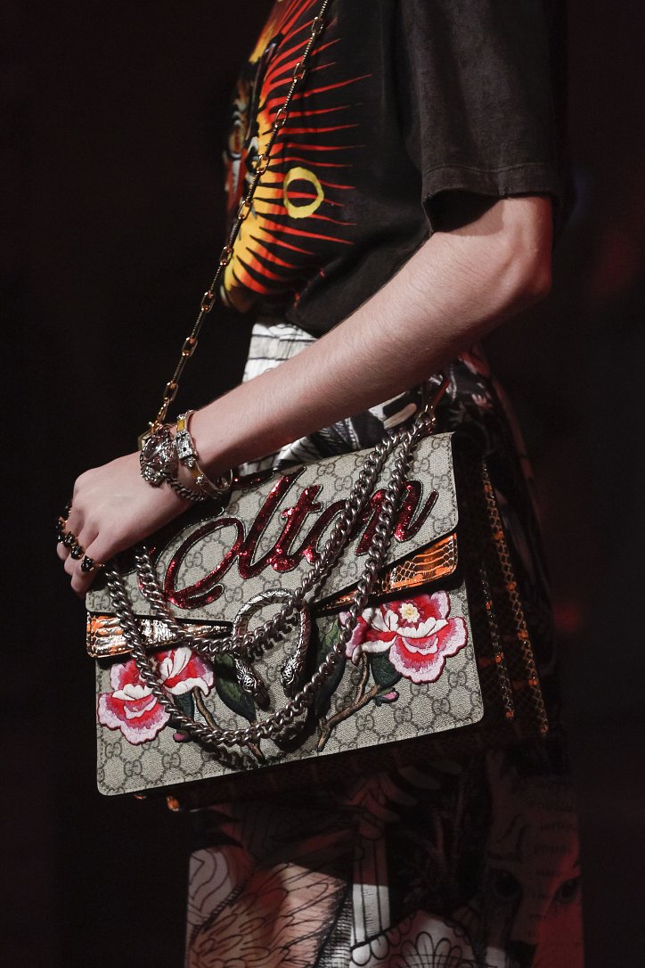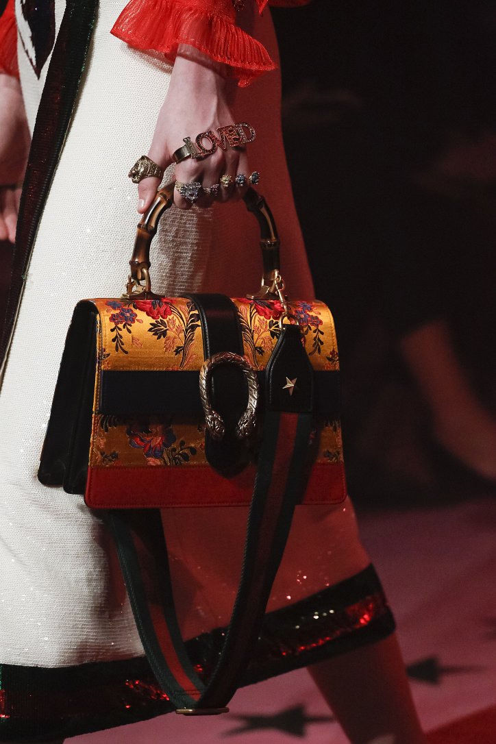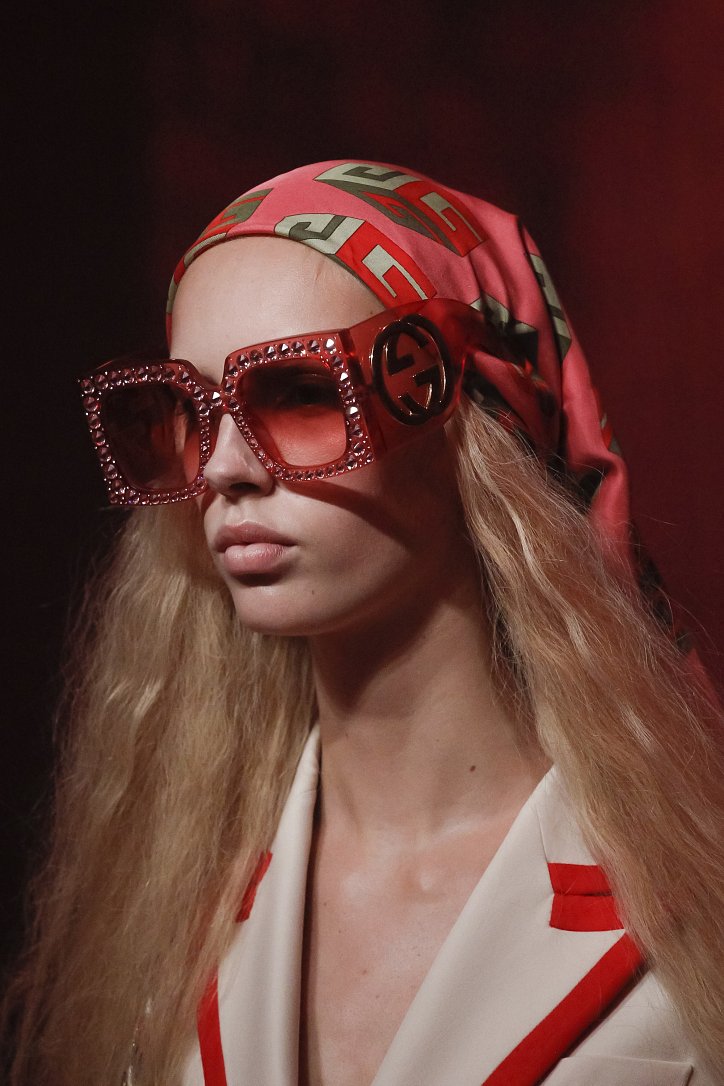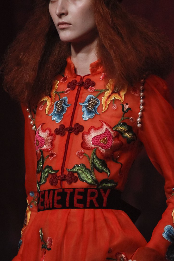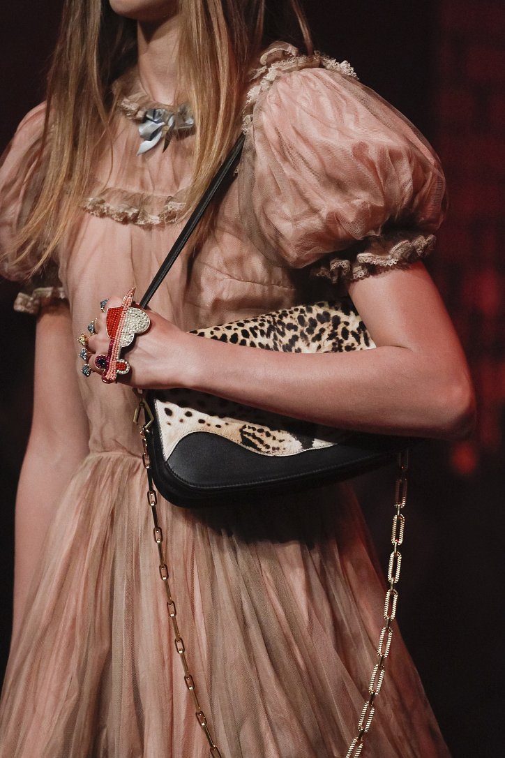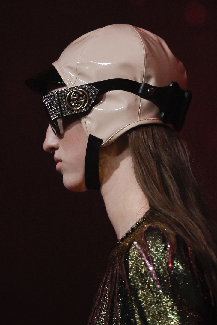 По уже сложившейся традиции, Алессандро Микеле удивлял гостей показа собственной трактовкой концепции дома моды Gucci. На этот раз дизайнер, словно змей-искуситель, красовавшийся на приглашениях, соблазнял гостей роскошными фатиновыми платьями, мерцанием тканей и пайеток, принтами и аппликациями с изображением королевских гербов, львов, драконов и зебр, «пижамными» костюмами, атласными кюлотами, принтованными шубами, вышитыми цветами, множеством оборок и рюшей и, конечно же, любимыми дизайнером огромными цветными очками.