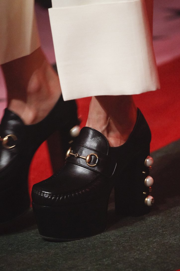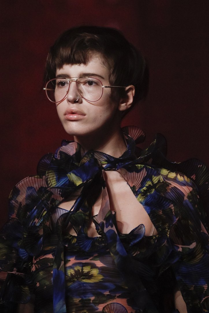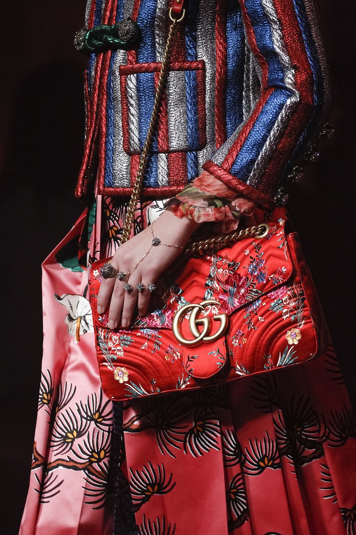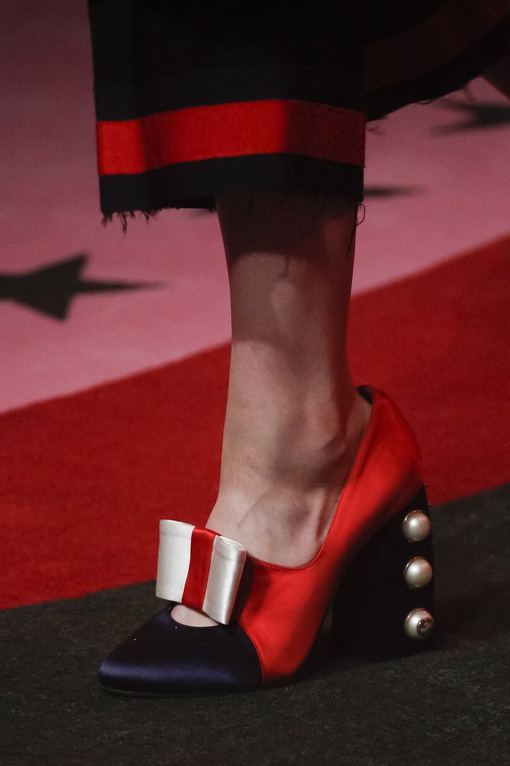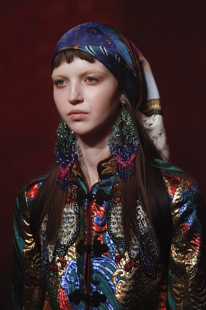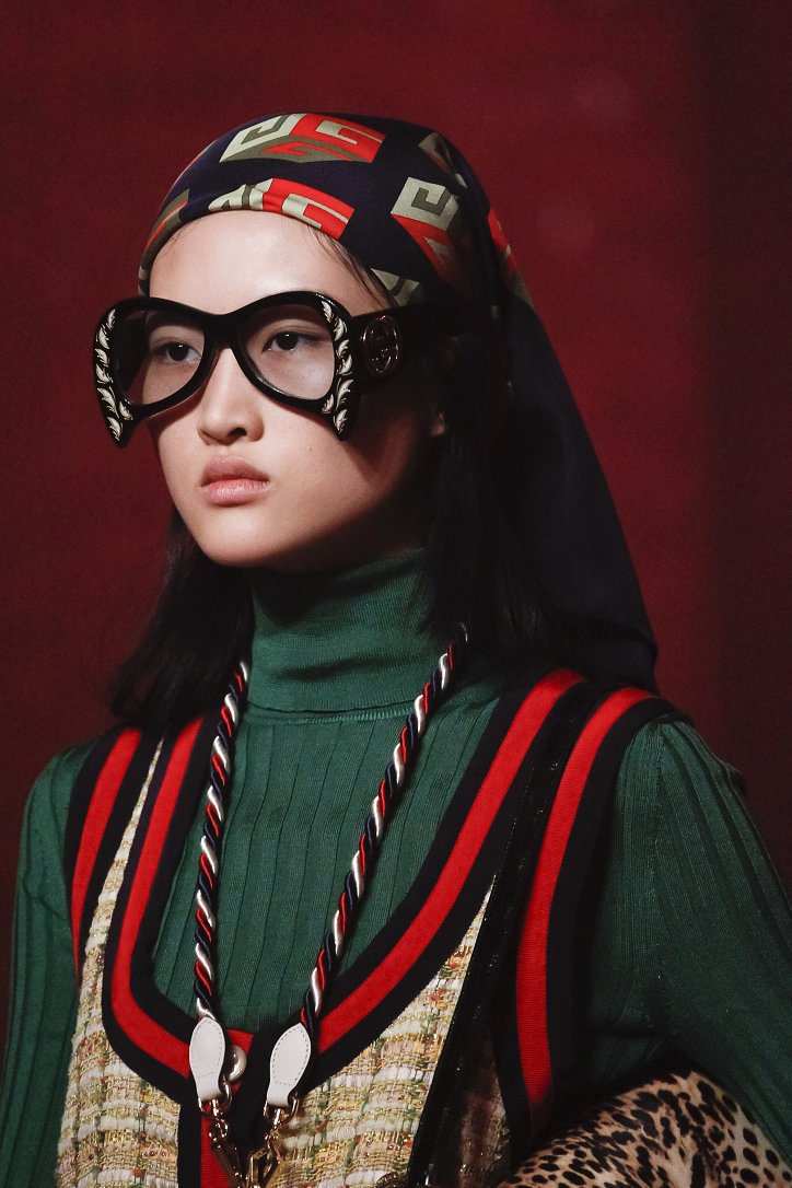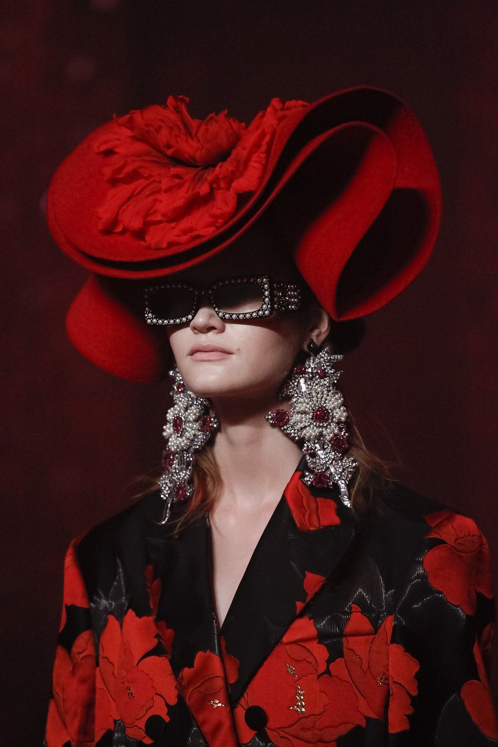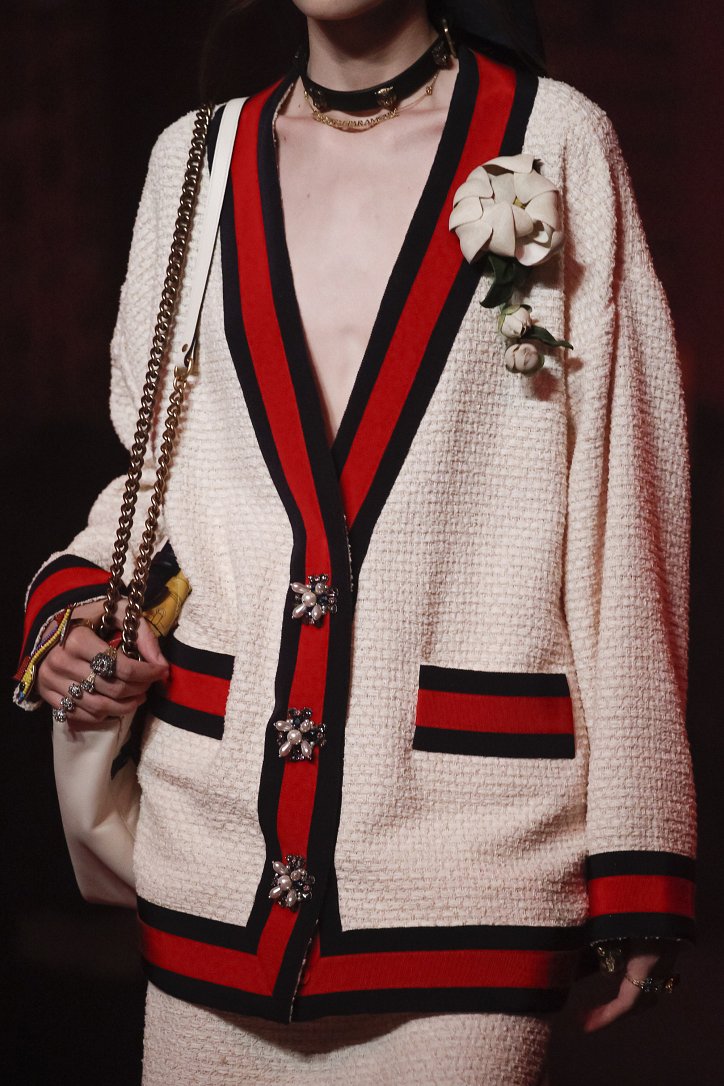 По уже сложившейся традиции, Алессандро Микеле удивлял гостей показа собственной трактовкой концепции дома моды Gucci. На этот раз дизайнер, словно змей-искуситель, красовавшийся на приглашениях, соблазнял гостей роскошными фатиновыми платьями, мерцанием тканей и пайеток, принтами и аппликациями с изображением королевских гербов, львов, драконов и зебр, «пижамными» костюмами, атласными кюлотами, принтованными шубами, вышитыми цветами, множеством оборок и рюшей и, конечно же, любимыми дизайнером огромными цветными очками.