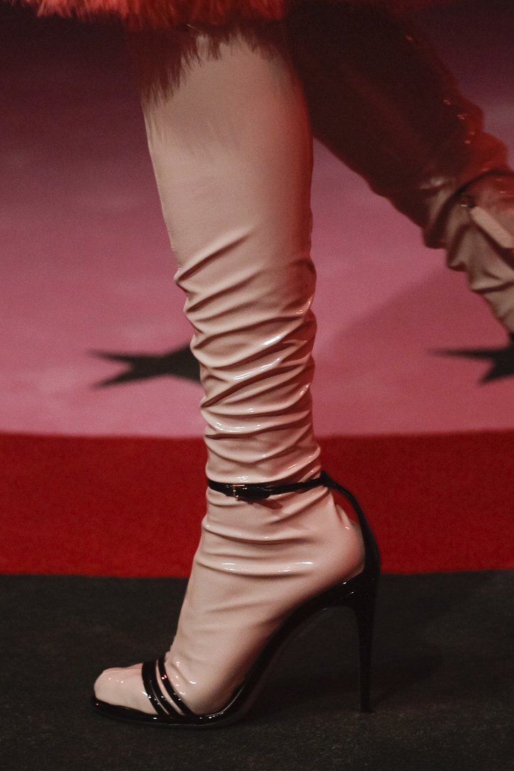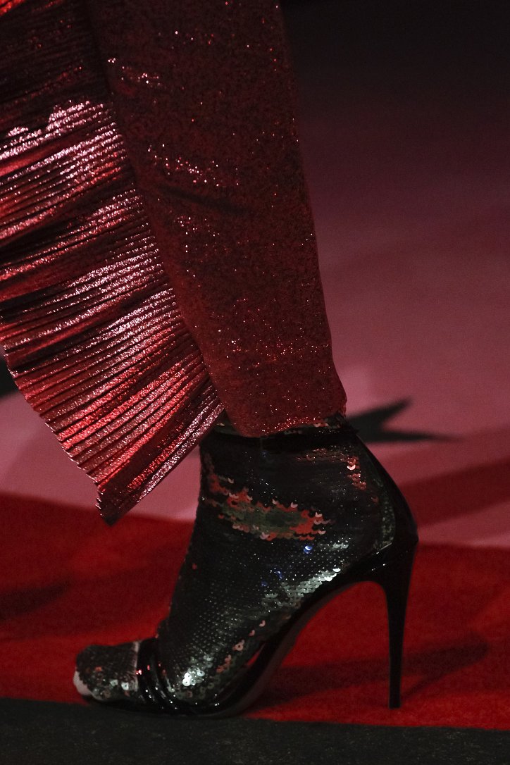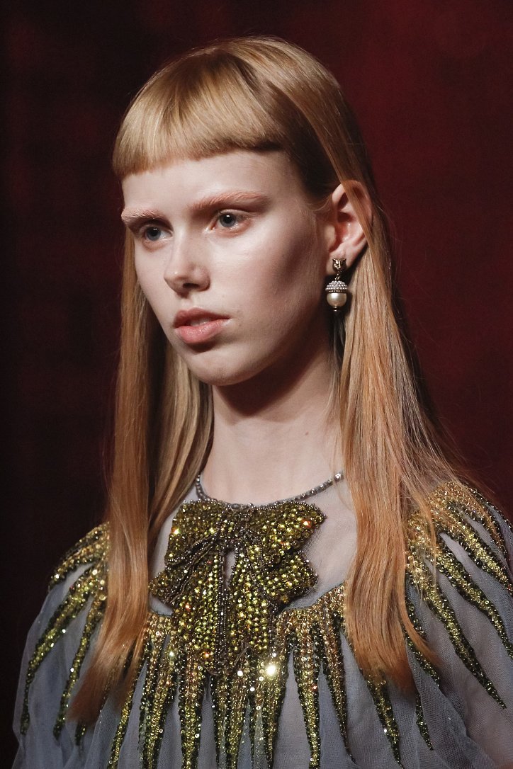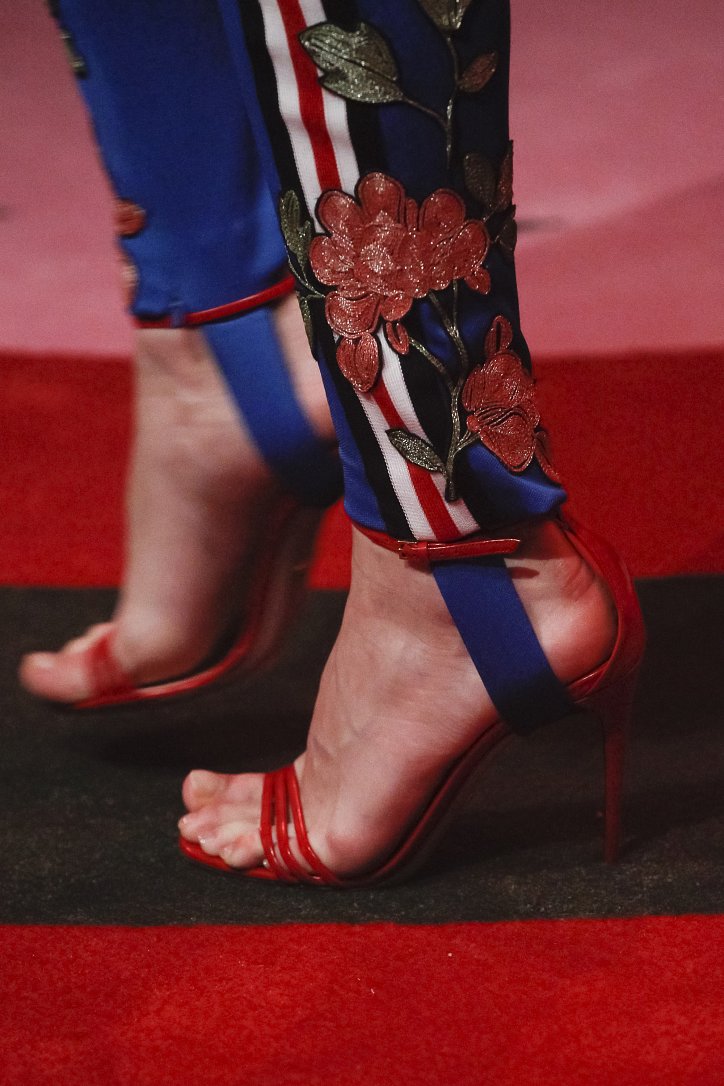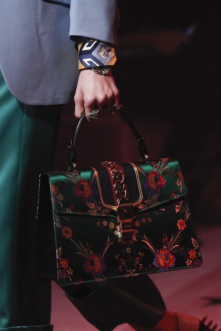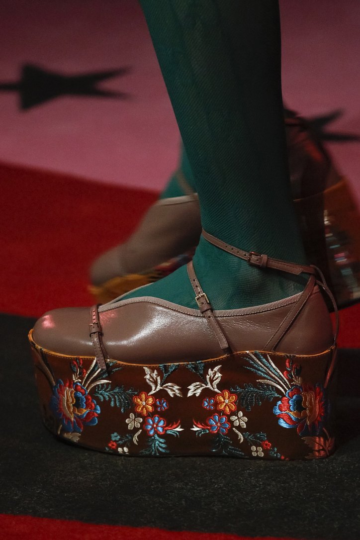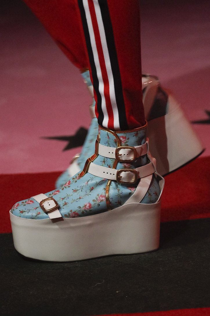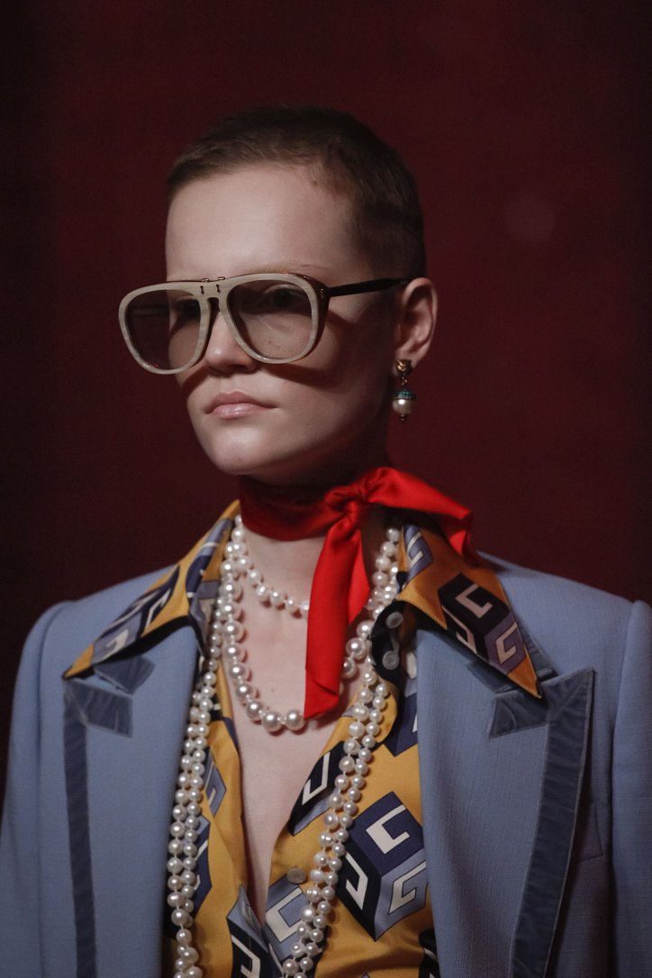 По уже сложившейся традиции, Алессандро Микеле удивлял гостей показа собственной трактовкой концепции дома моды Gucci. На этот раз дизайнер, словно змей-искуситель, красовавшийся на приглашениях, соблазнял гостей роскошными фатиновыми платьями, мерцанием тканей и пайеток, принтами и аппликациями с изображением королевских гербов, львов, драконов и зебр, «пижамными» костюмами, атласными кюлотами, принтованными шубами, вышитыми цветами, множеством оборок и рюшей и, конечно же, любимыми дизайнером огромными цветными очками.