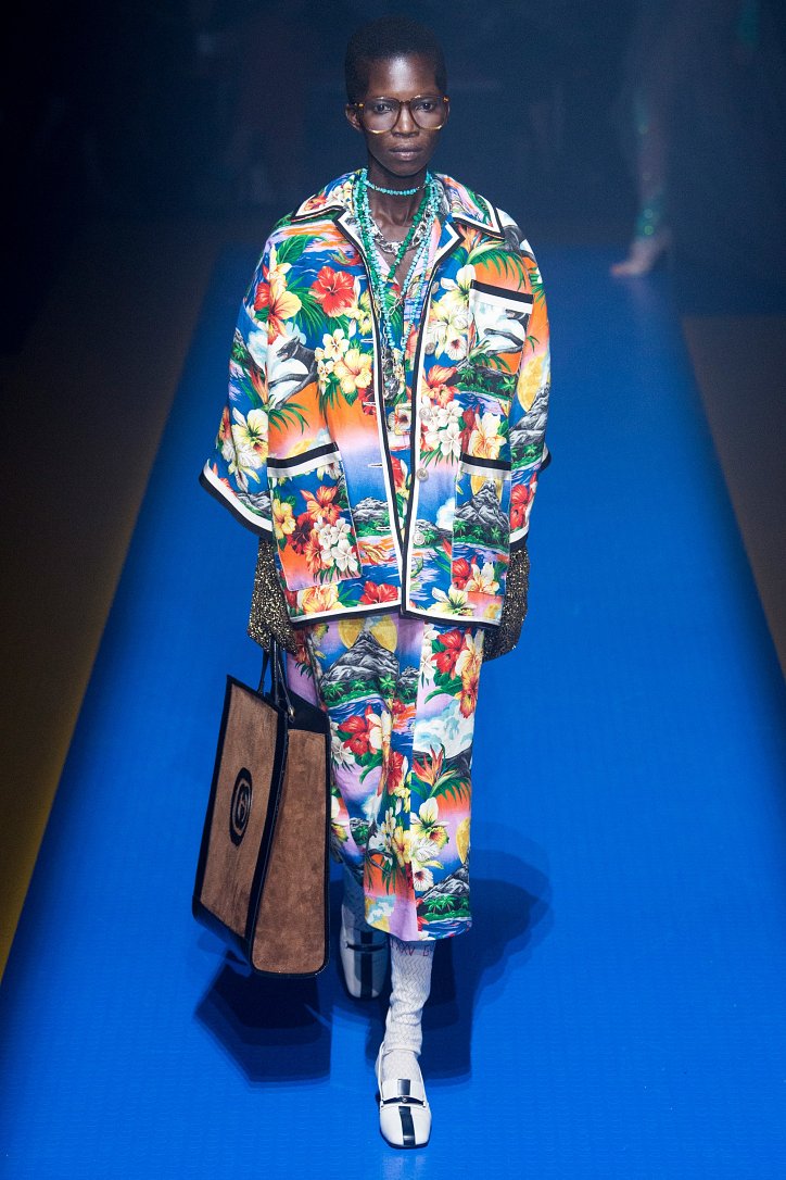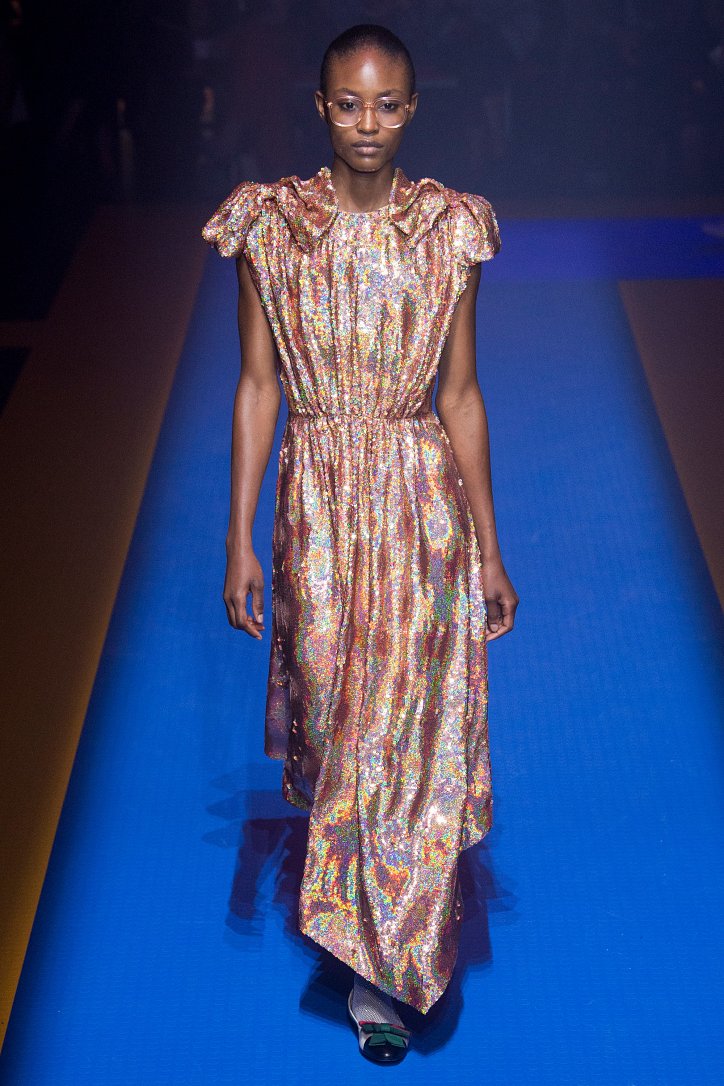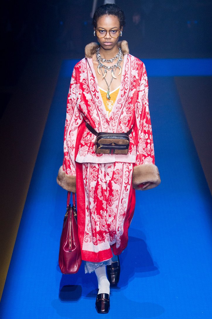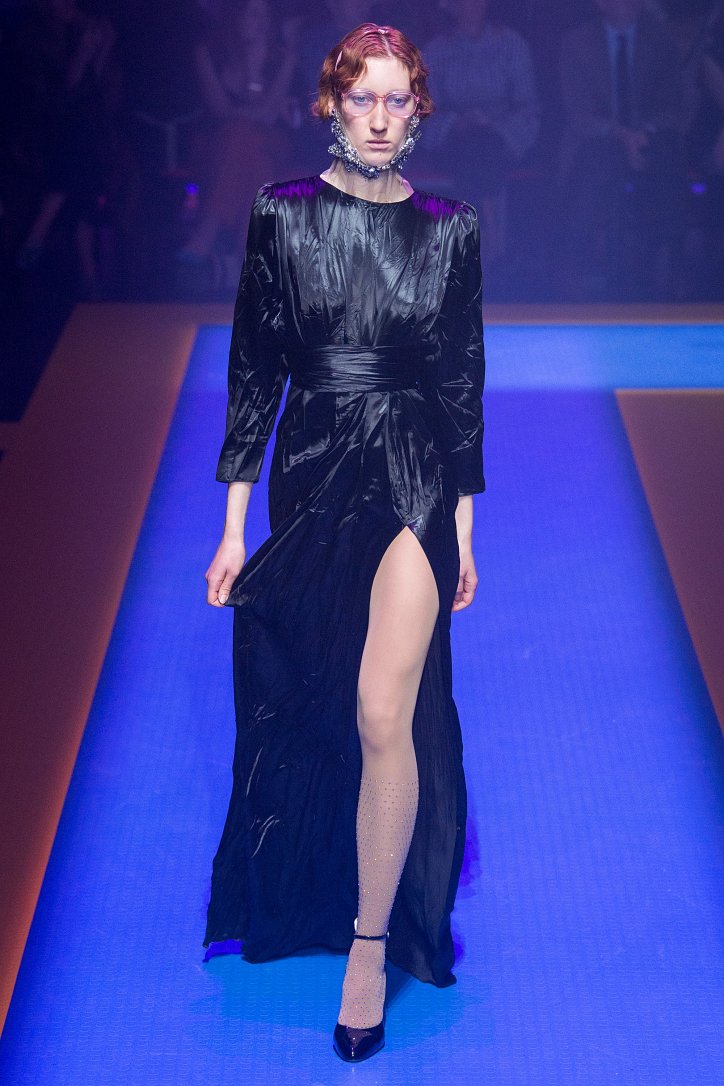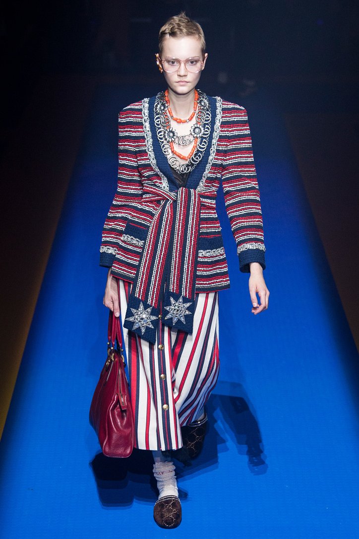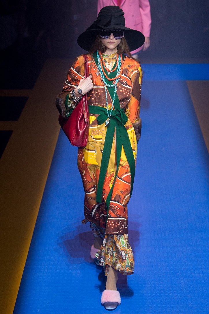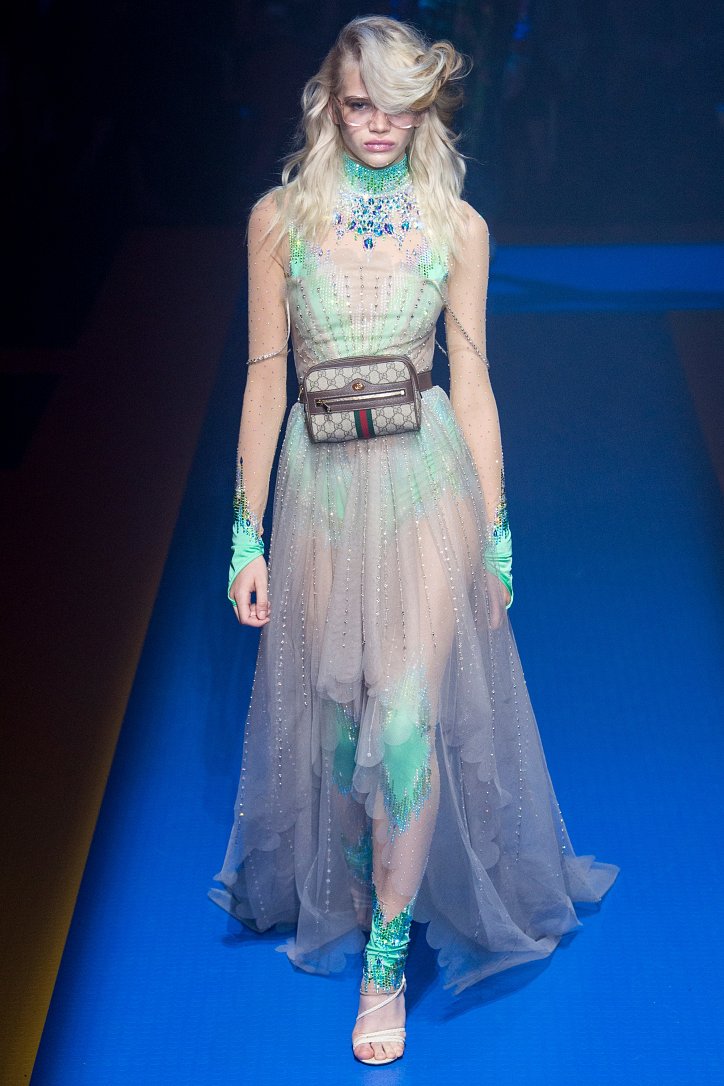 И вновь коллекция Gucci весна-лето 2018 стала гимном эклектике – Алессандро Микеле продолжил заданный в прошлых коллекция тон. На этот раз по подиуму, который должен был символизировать реку Тибр, дефилировали модели, одетые в платья с капюшонами и блестящие купальники, «леопардовое» пальто с меховой отделкой и шелковый комбинезон со звездами, пуританский костюм с юбкой в складочку и гламурный спортивные костюм, носить который полагается не иначе как с бусами. Завершали образ уже ставшие ультапопулярными поясные сумки, броские очки со стразами и крупные украшения. Бохо и спорт, гипертрофированные плечи родом из 80-ых и романтика 70-ых, диснеевские принты и цитаты из восточных культур – все смешалось в доме Гуччи! Но можно даже не сомневаться - и этот модный винегрет будет съеден с удовольствием.