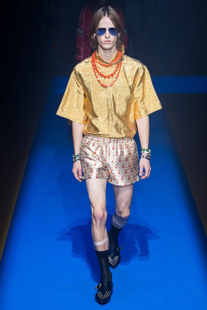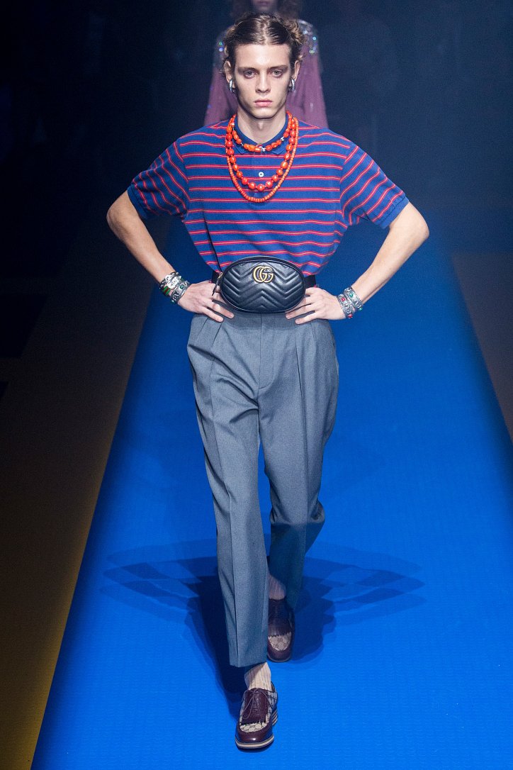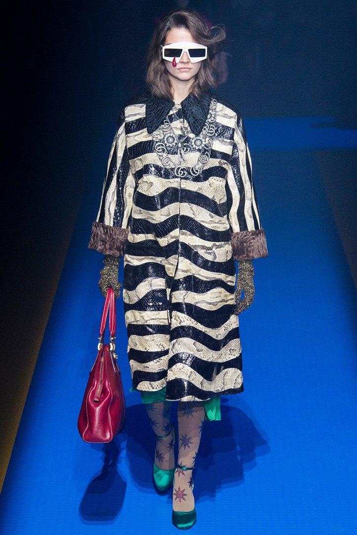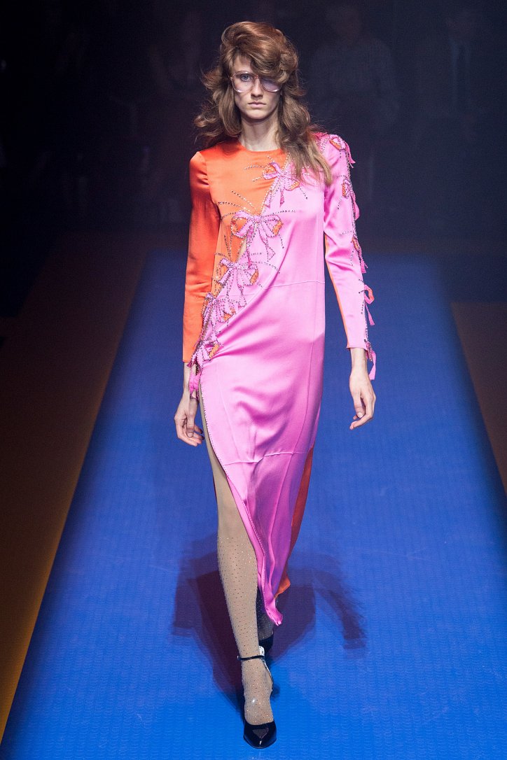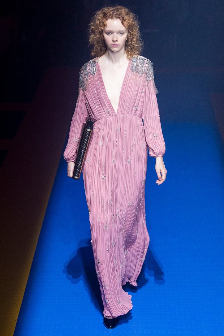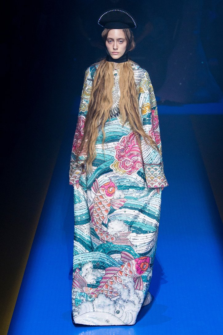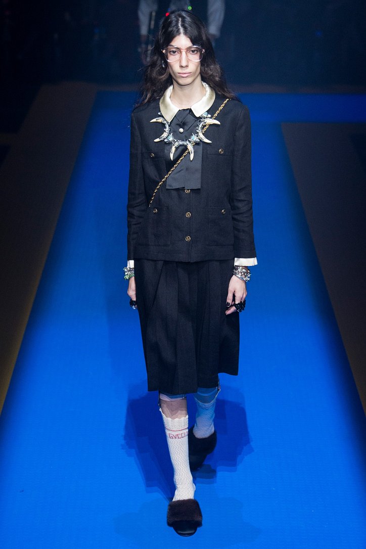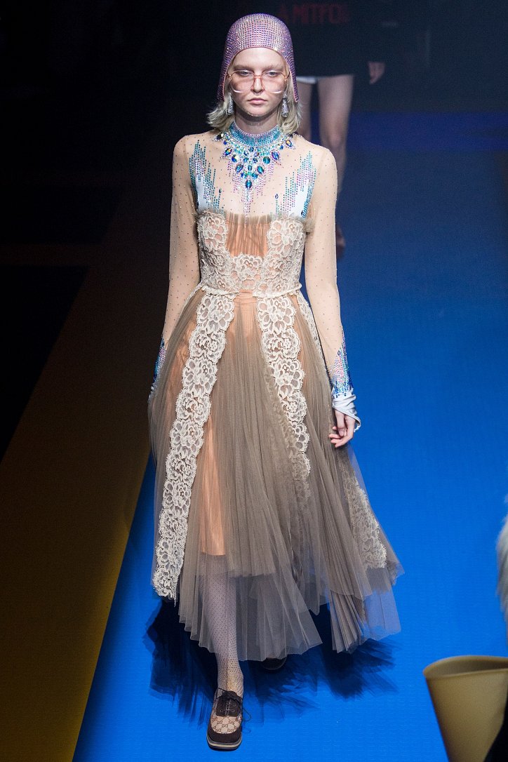 И вновь коллекция Gucci весна-лето 2018 стала гимном эклектике – Алессандро Микеле продолжил заданный в прошлых коллекция тон. На этот раз по подиуму, который должен был символизировать реку Тибр, дефилировали модели, одетые в платья с капюшонами и блестящие купальники, «леопардовое» пальто с меховой отделкой и шелковый комбинезон со звездами, пуританский костюм с юбкой в складочку и гламурный спортивные костюм, носить который полагается не иначе как с бусами. Завершали образ уже ставшие ультапопулярными поясные сумки, броские очки со стразами и крупные украшения. Бохо и спорт, гипертрофированные плечи родом из 80-ых и романтика 70-ых, диснеевские принты и цитаты из восточных культур – все смешалось в доме Гуччи! Но можно даже не сомневаться - и этот модный винегрет будет съеден с удовольствием.