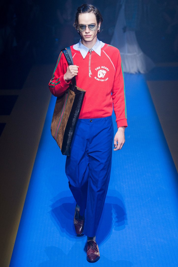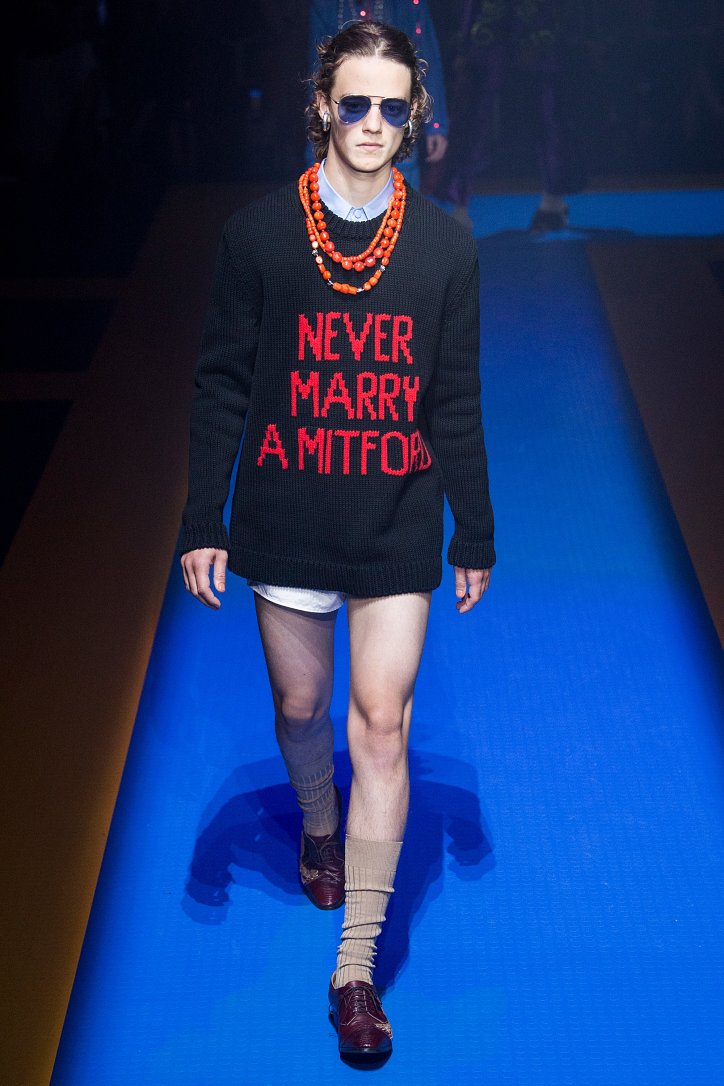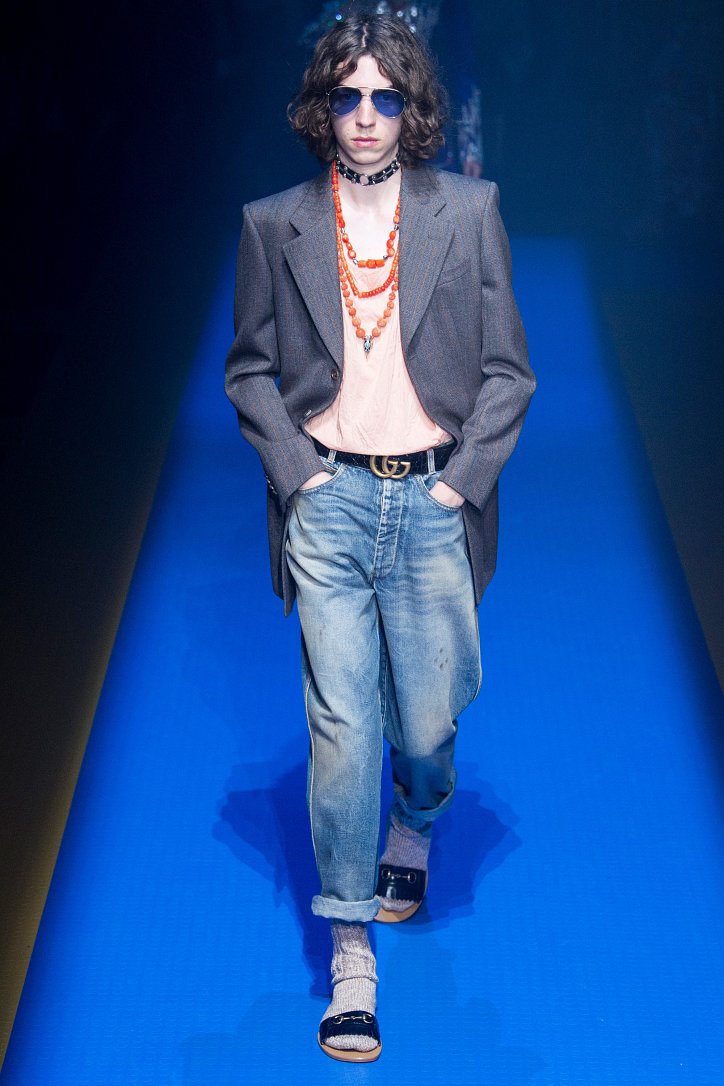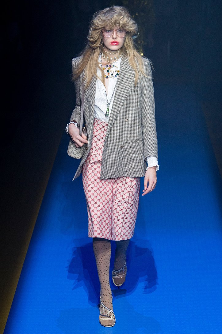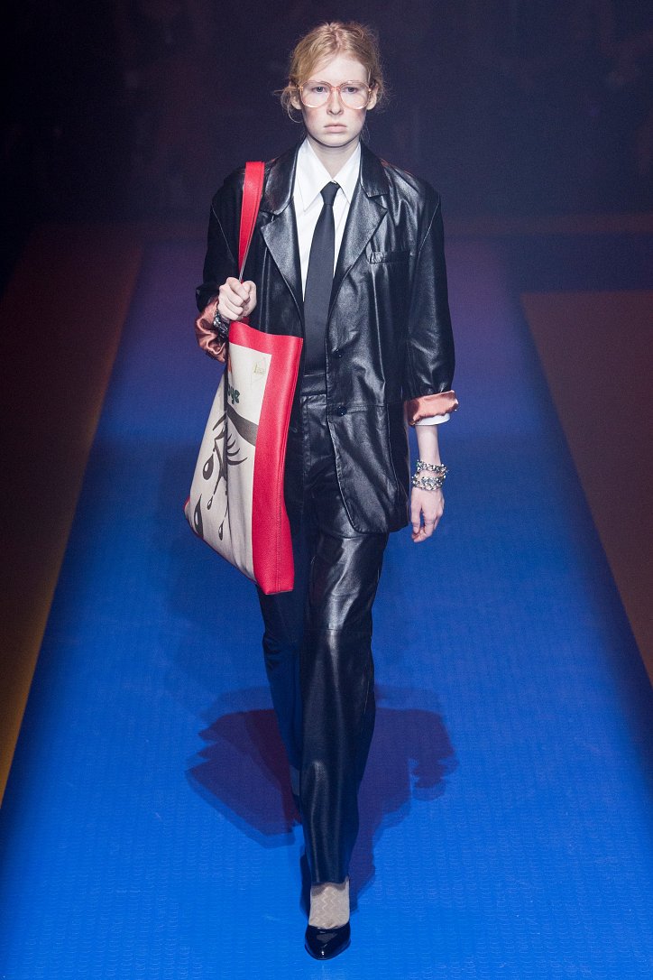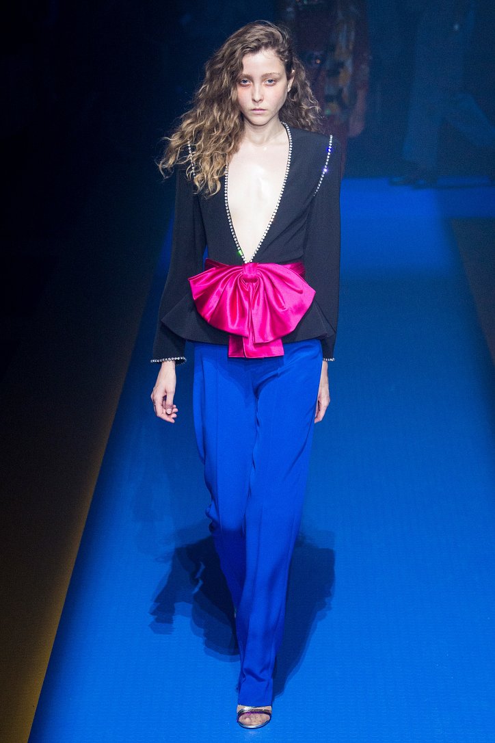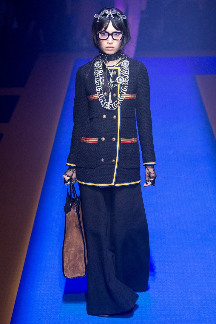 И вновь коллекция Gucci весна-лето 2018 стала гимном эклектике – Алессандро Микеле продолжил заданный в прошлых коллекция тон. На этот раз по подиуму, который должен был символизировать реку Тибр, дефилировали модели, одетые в платья с капюшонами и блестящие купальники, «леопардовое» пальто с меховой отделкой и шелковый комбинезон со звездами, пуританский костюм с юбкой в складочку и гламурный спортивные костюм, носить который полагается не иначе как с бусами. Завершали образ уже ставшие ультапопулярными поясные сумки, броские очки со стразами и крупные украшения. Бохо и спорт, гипертрофированные плечи родом из 80-ых и романтика 70-ых, диснеевские принты и цитаты из восточных культур – все смешалось в доме Гуччи! Но можно даже не сомневаться - и этот модный винегрет будет съеден с удовольствием.