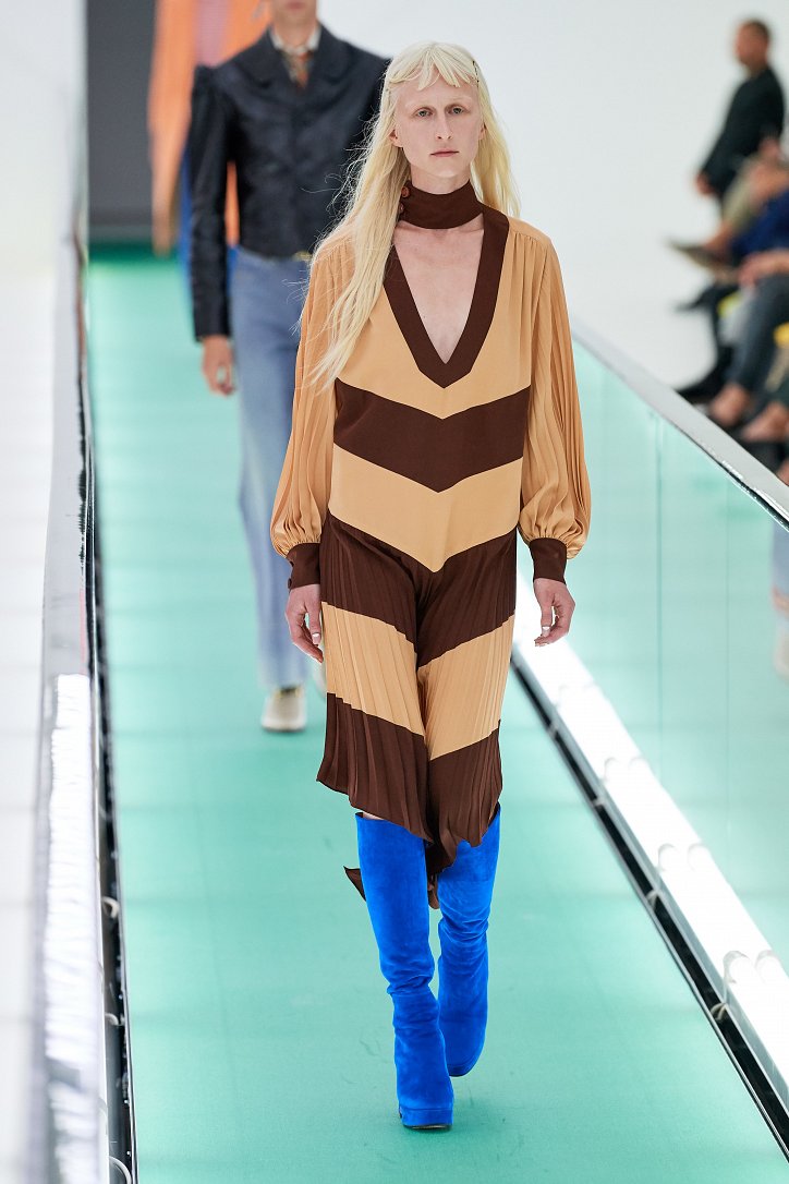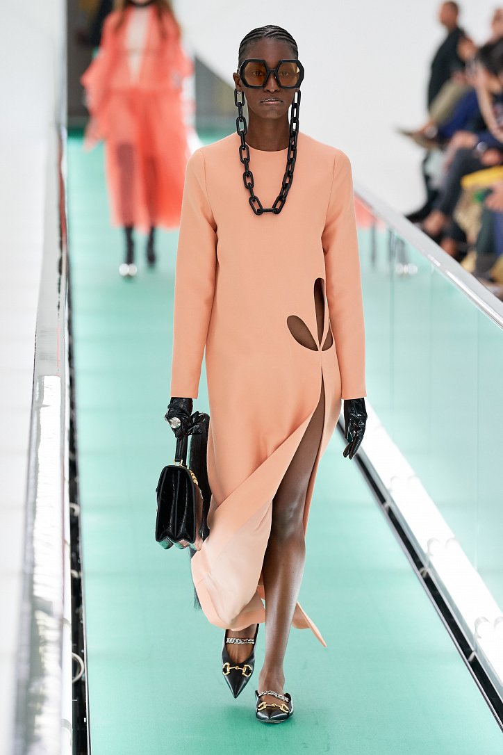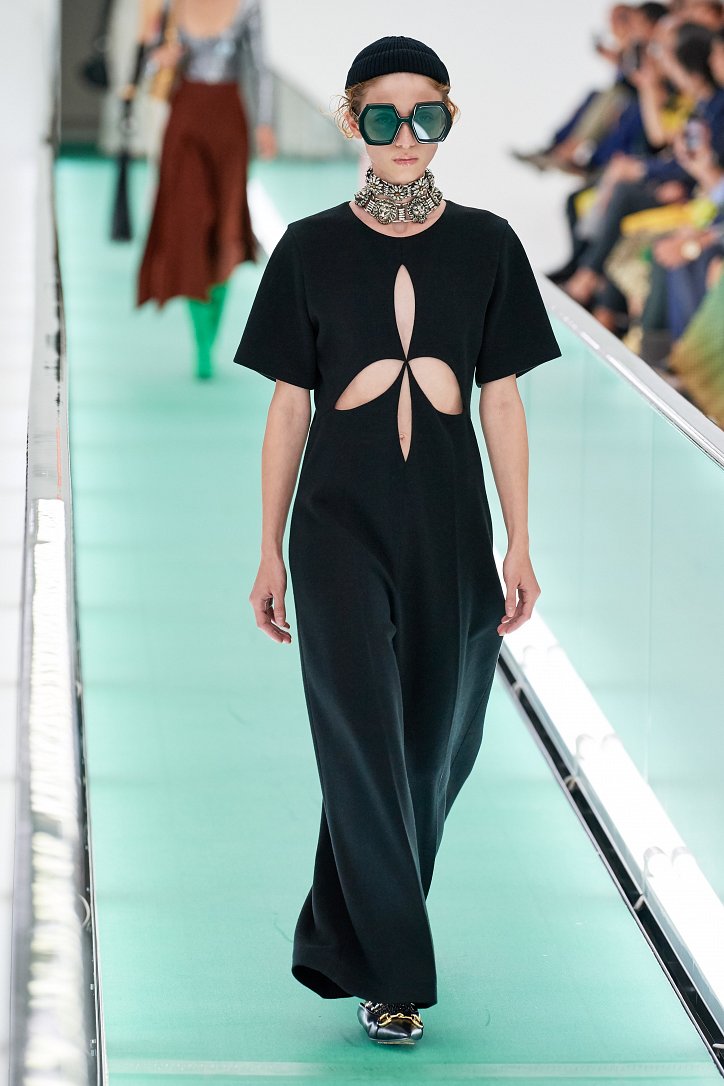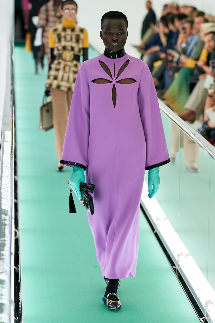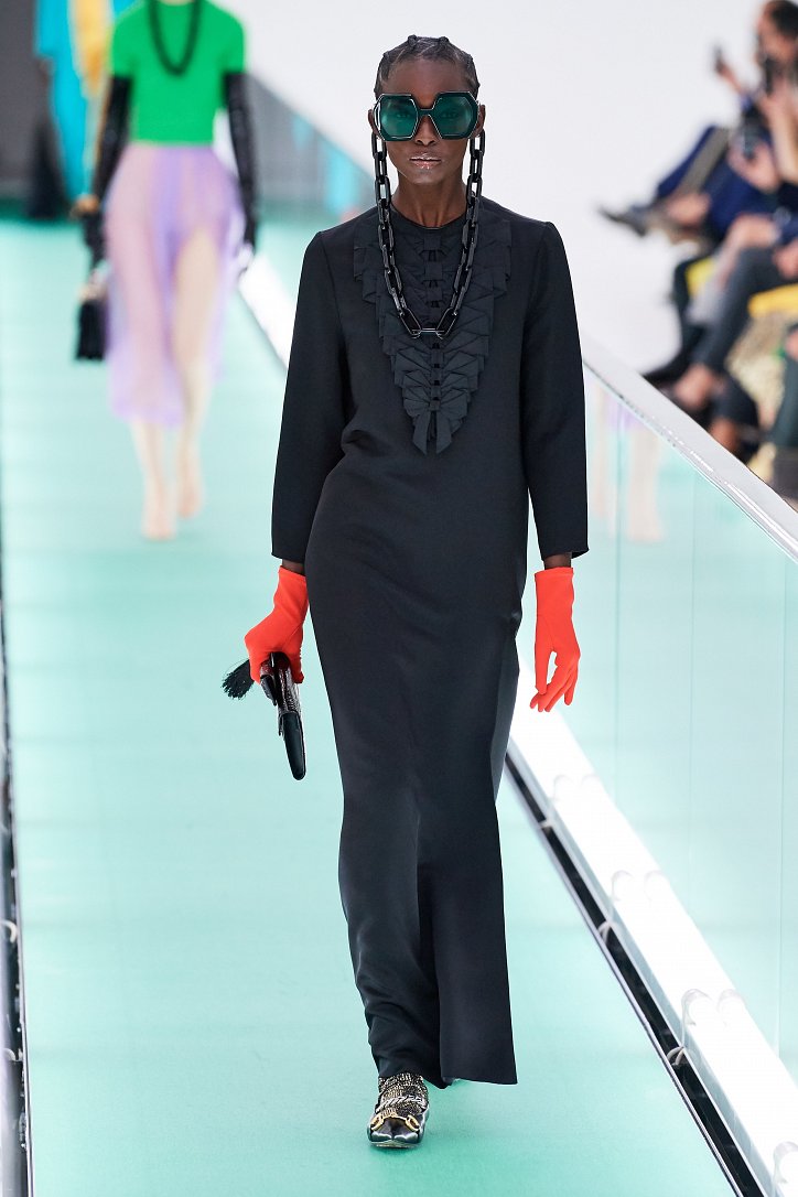 Затем свет в зале внезапно погас. Все погрузилось в темноту. А потом он вновь зажегся – и на уже неподвижной дорожке стали появляться бодро шагающие манекенщицы в цветных брючных ансамблях, собранных из цветовых блоков, юбках миди с высокими разрезами и длинных платьях с неожиданными деталями кроя.