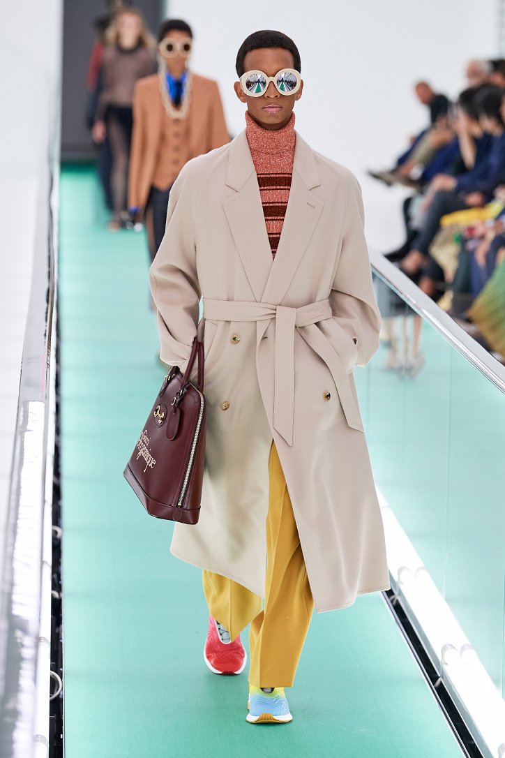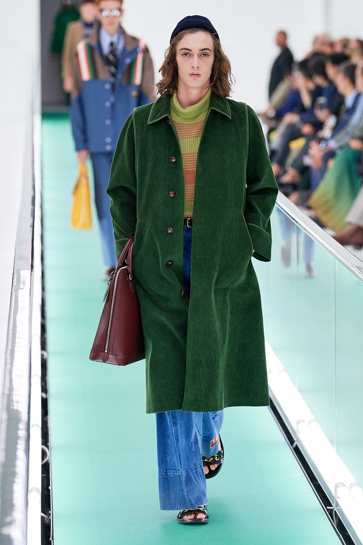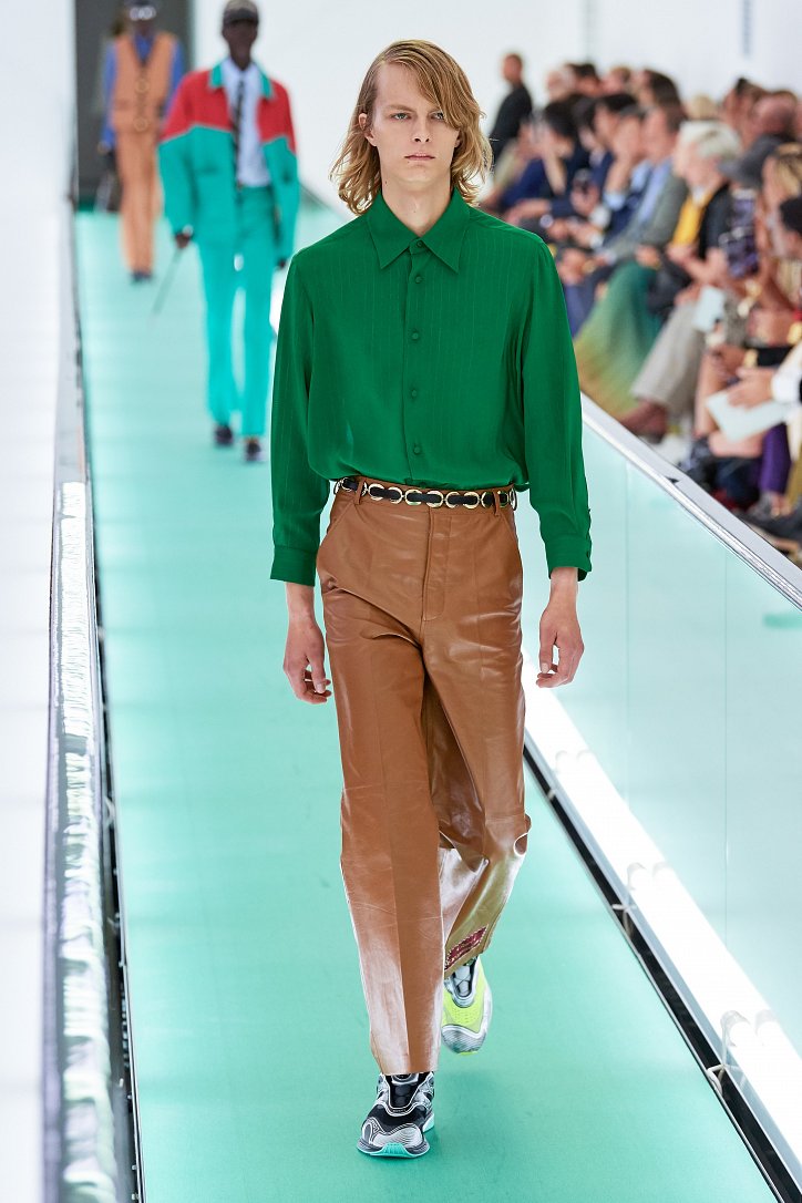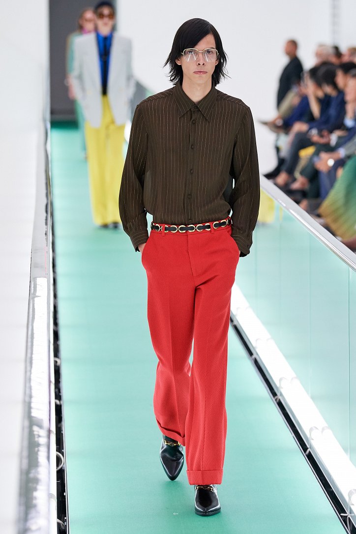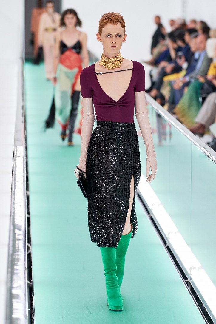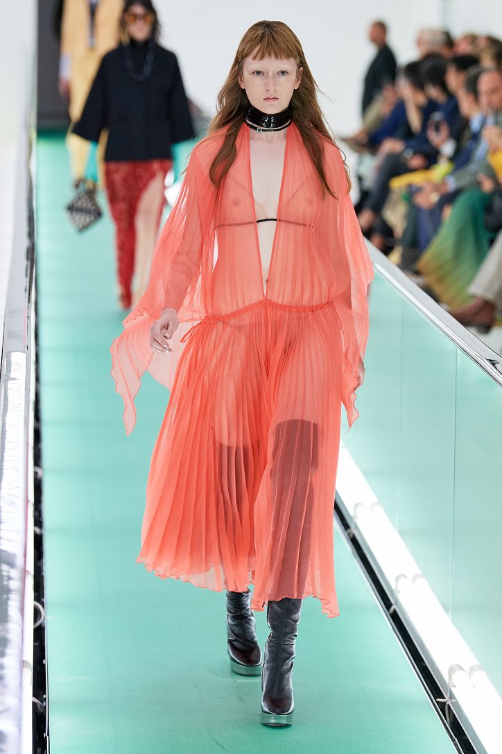 Затем свет в зале внезапно погас. Все погрузилось в темноту. А потом он вновь зажегся – и на уже неподвижной дорожке стали появляться бодро шагающие манекенщицы в цветных брючных ансамблях, собранных из цветовых блоков, юбках миди с высокими разрезами и длинных платьях с неожиданными деталями кроя.