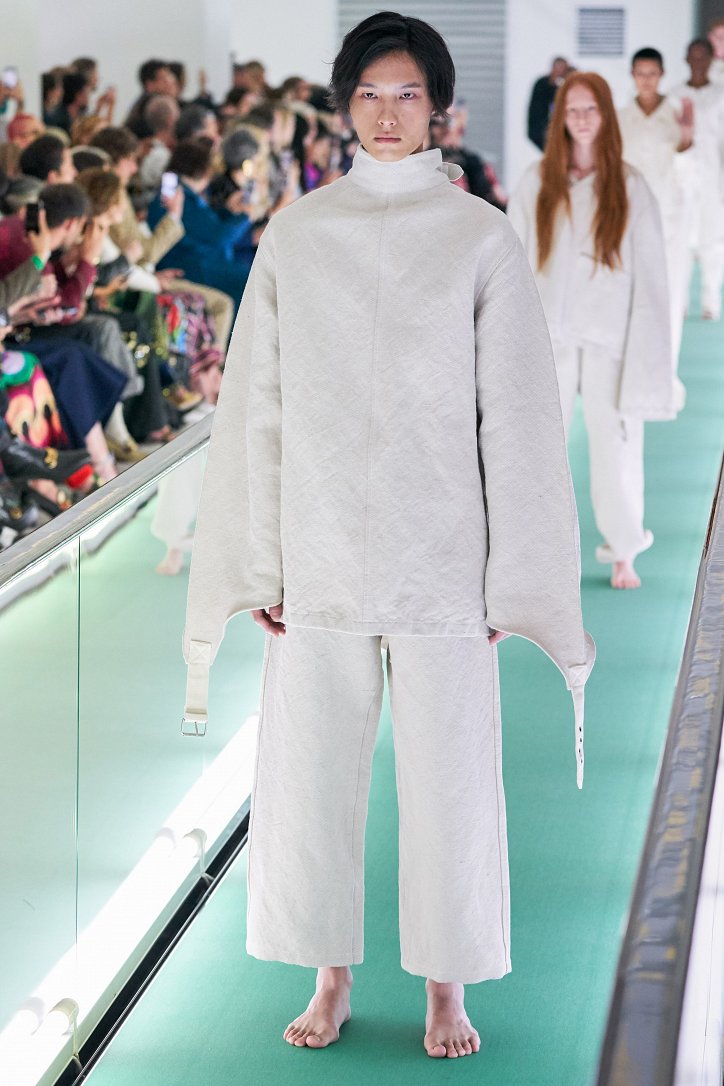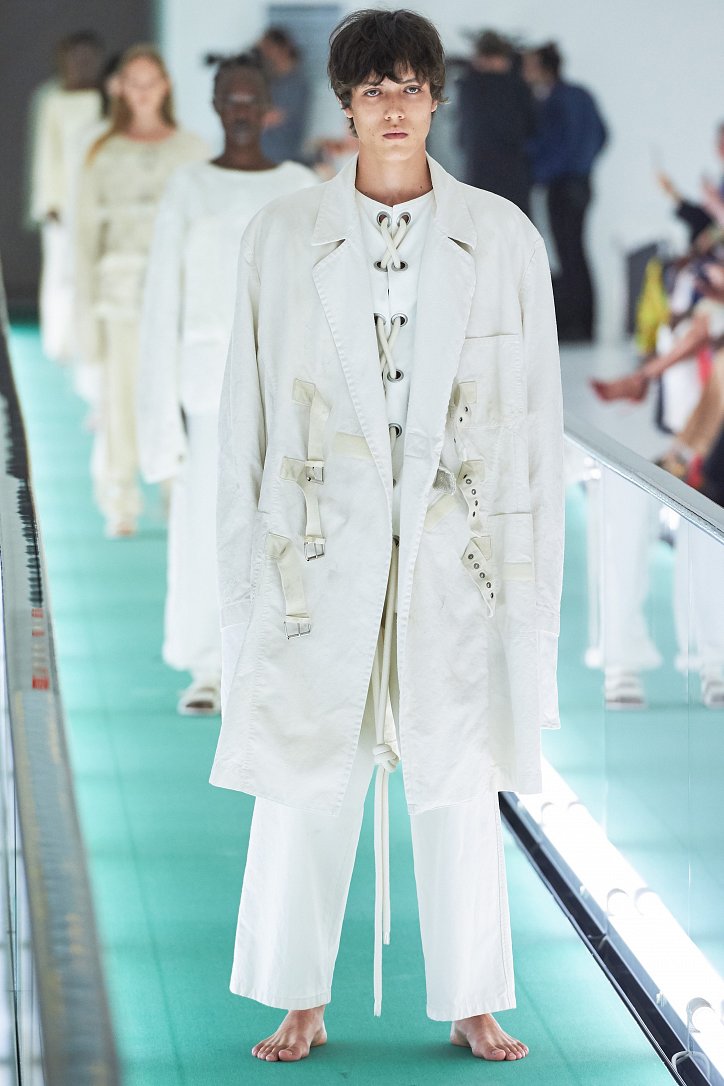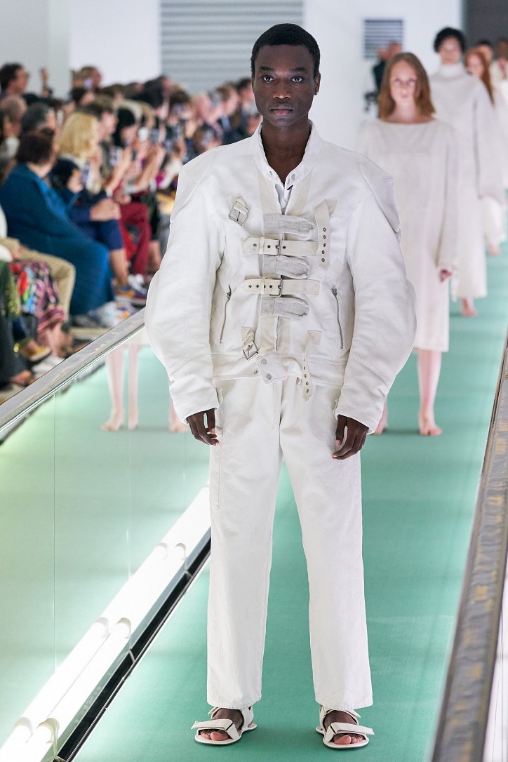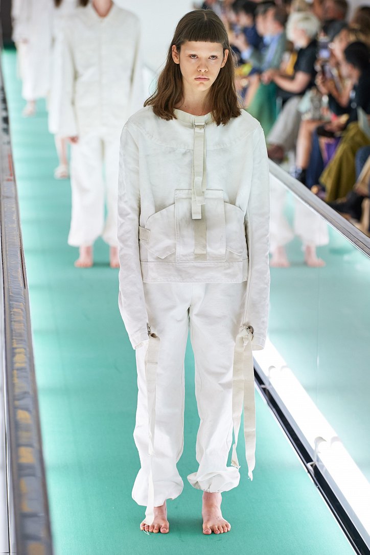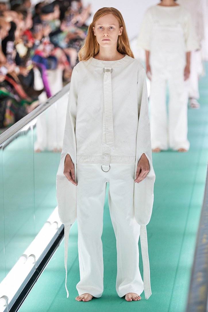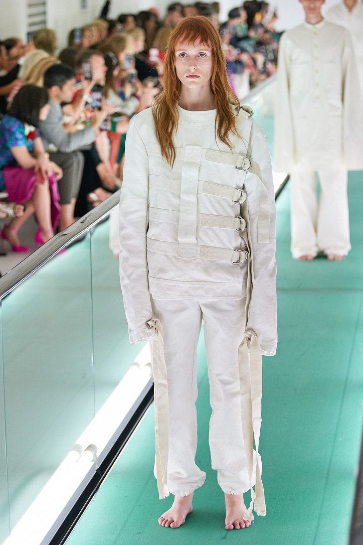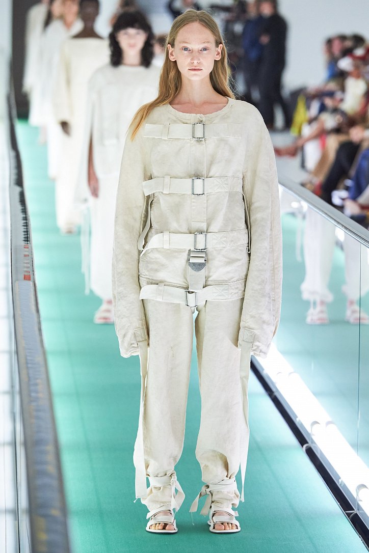 Сюрпризы начались с самого начала: на подиуме появились модели … в смирительных рубашках. Одна за другой появлялись они на подиуме, выезжая на движущейся дорожке «из-за кулис». Те, кто удосужился посчитать, насчитали 21 белоснежный образ: мешковатые платья с ультрадлинными рукавами, комбинезоны и брючная «униформа». Это был пролог.