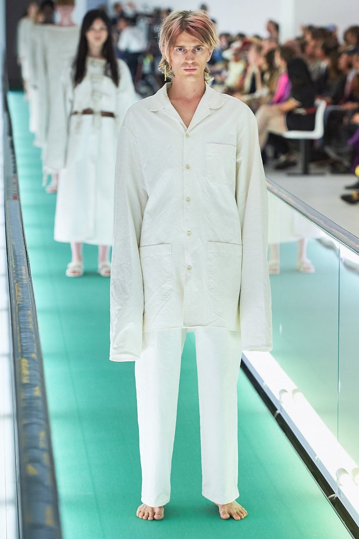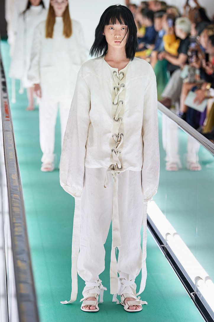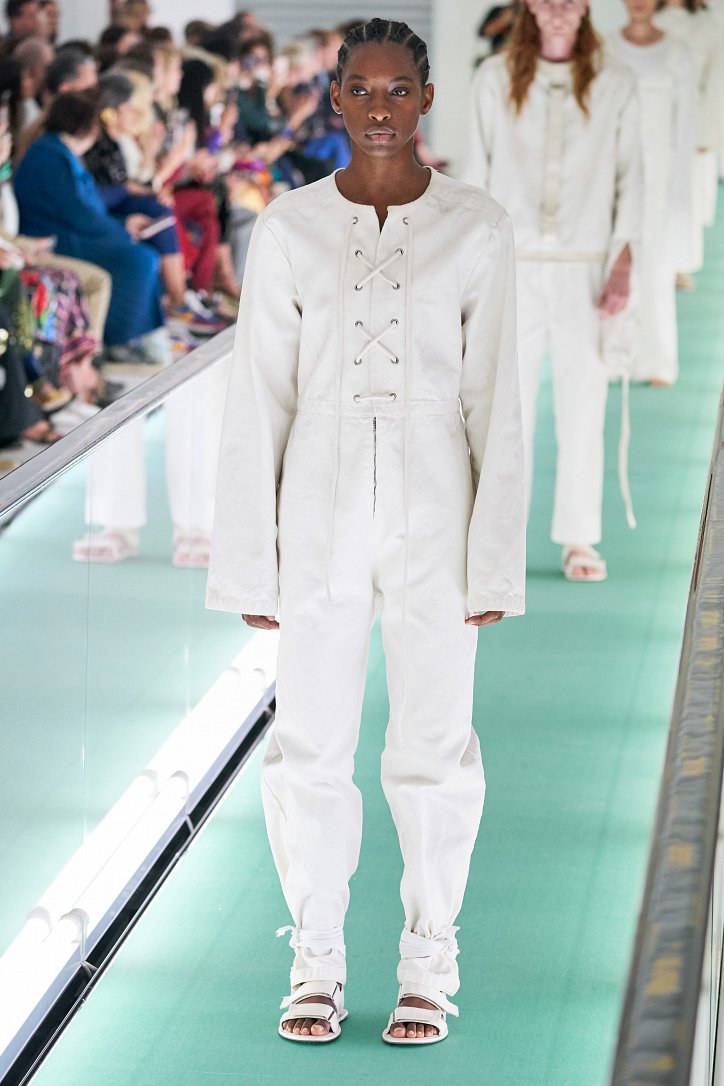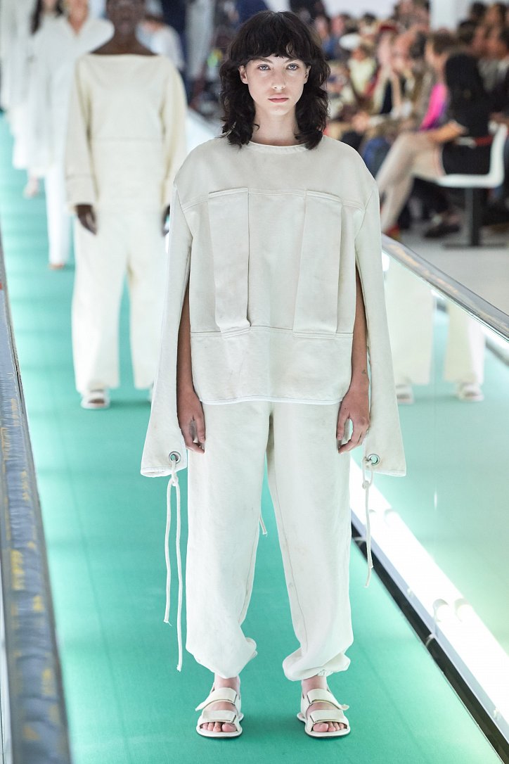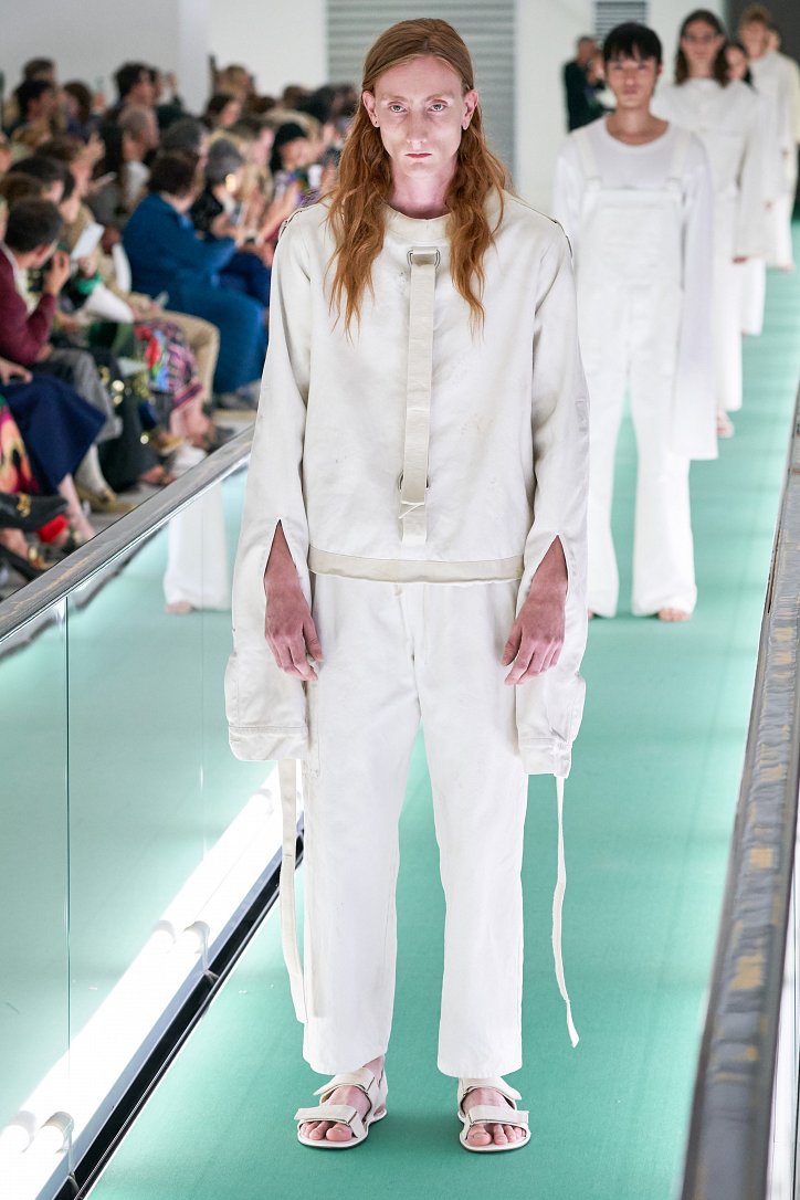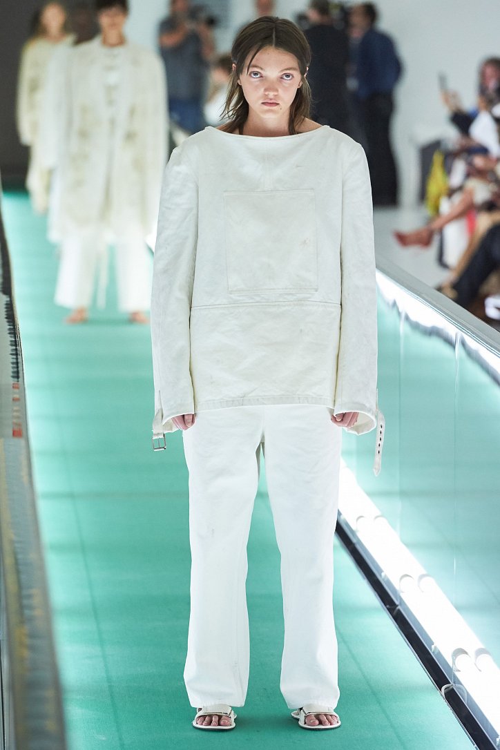 Сюрпризы начались с самого начала: на подиуме появились модели … в смирительных рубашках. Одна за другой появлялись они на подиуме, выезжая на движущейся дорожке «из-за кулис». Те, кто удосужился посчитать, насчитали 21 белоснежный образ: мешковатые платья с ультрадлинными рукавами, комбинезоны и брючная «униформа». Это был пролог.