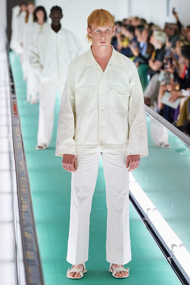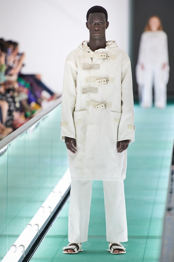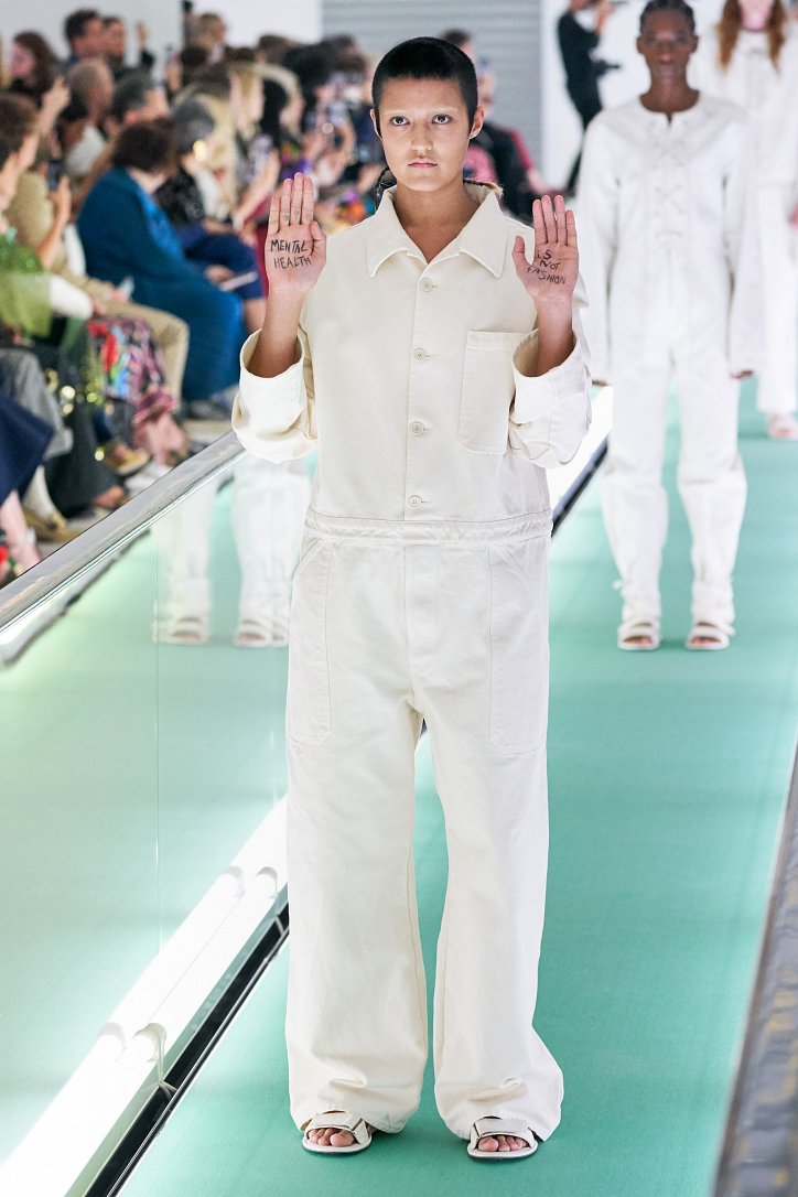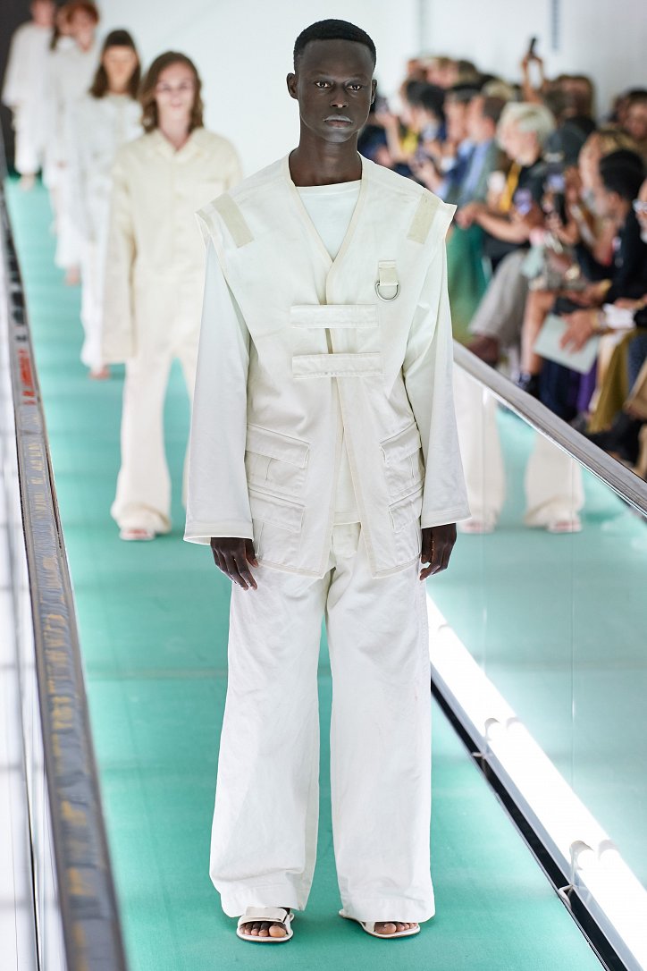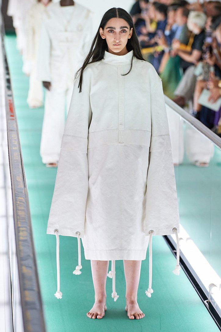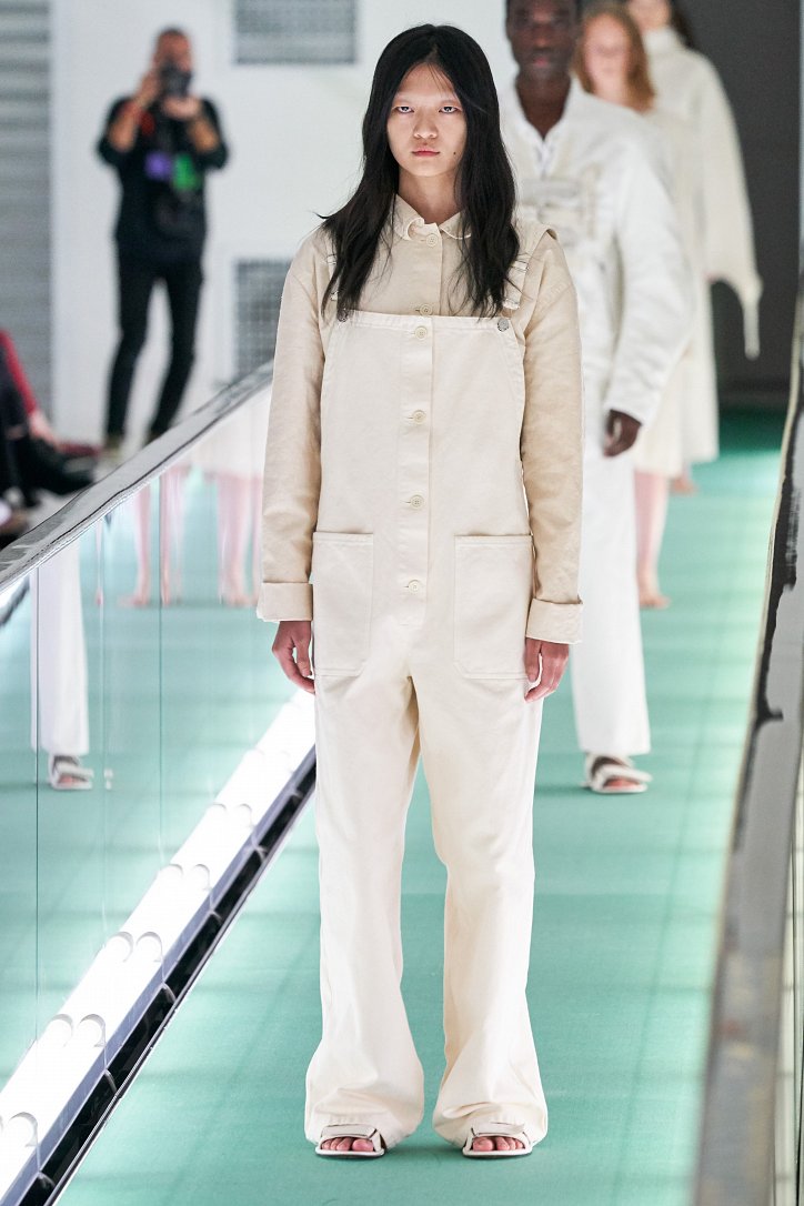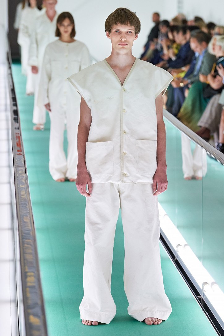 Сюрпризы начались с самого начала: на подиуме появились модели … в смирительных рубашках. Одна за другой появлялись они на подиуме, выезжая на движущейся дорожке «из-за кулис». Те, кто удосужился посчитать, насчитали 21 белоснежный образ: мешковатые платья с ультрадлинными рукавами, комбинезоны и брючная «униформа». Это был пролог.