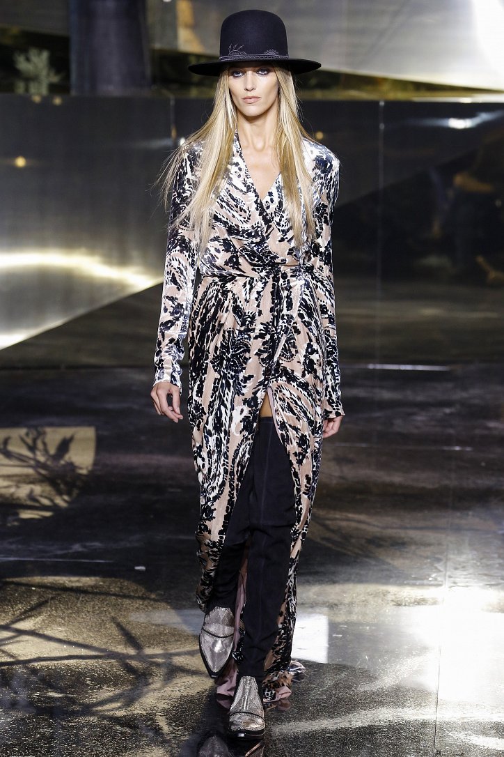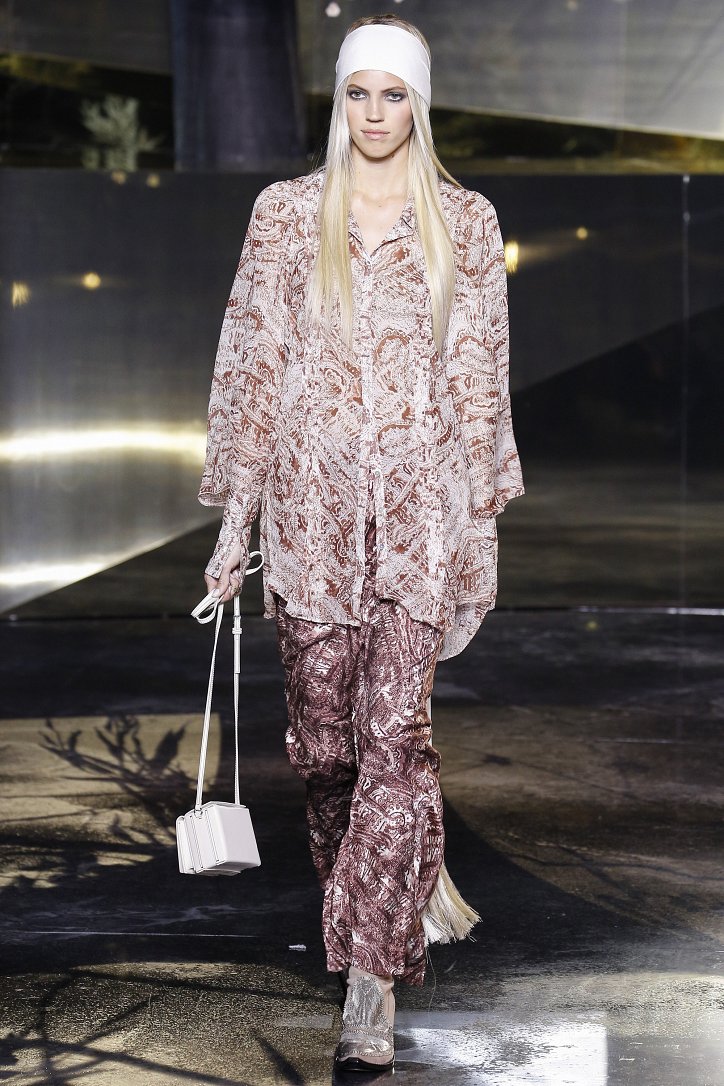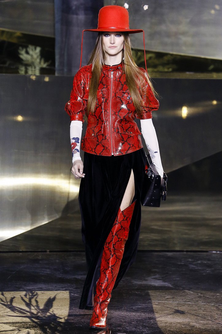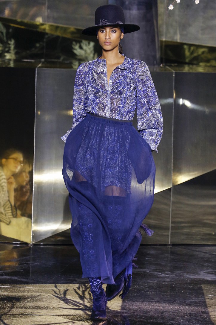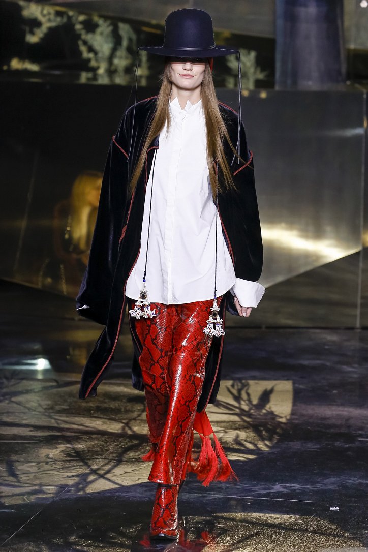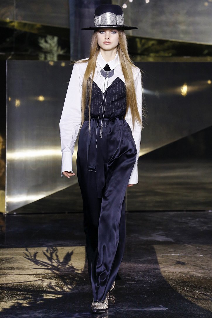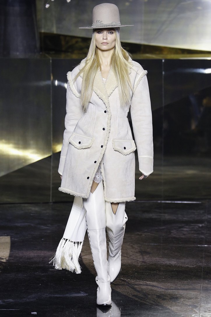 Что ж до самой коллекции, но ее изюминкой стали… шляпы гаучо. И высокие ковбойские сапоги из кожи и замши с вызывающим хищным принтом. Все эти аксессуары дополняли брючные костюмы, оригинальные «большемерные» пальто, дубленки, корсеты из «мужских» тканей, свободные платья и блузы с принтами, напоминающими национальную шведскую вышивку, широкие брюки на высокой талии, прозрачные топы, блузы и костюмы в бельевом стиле.
