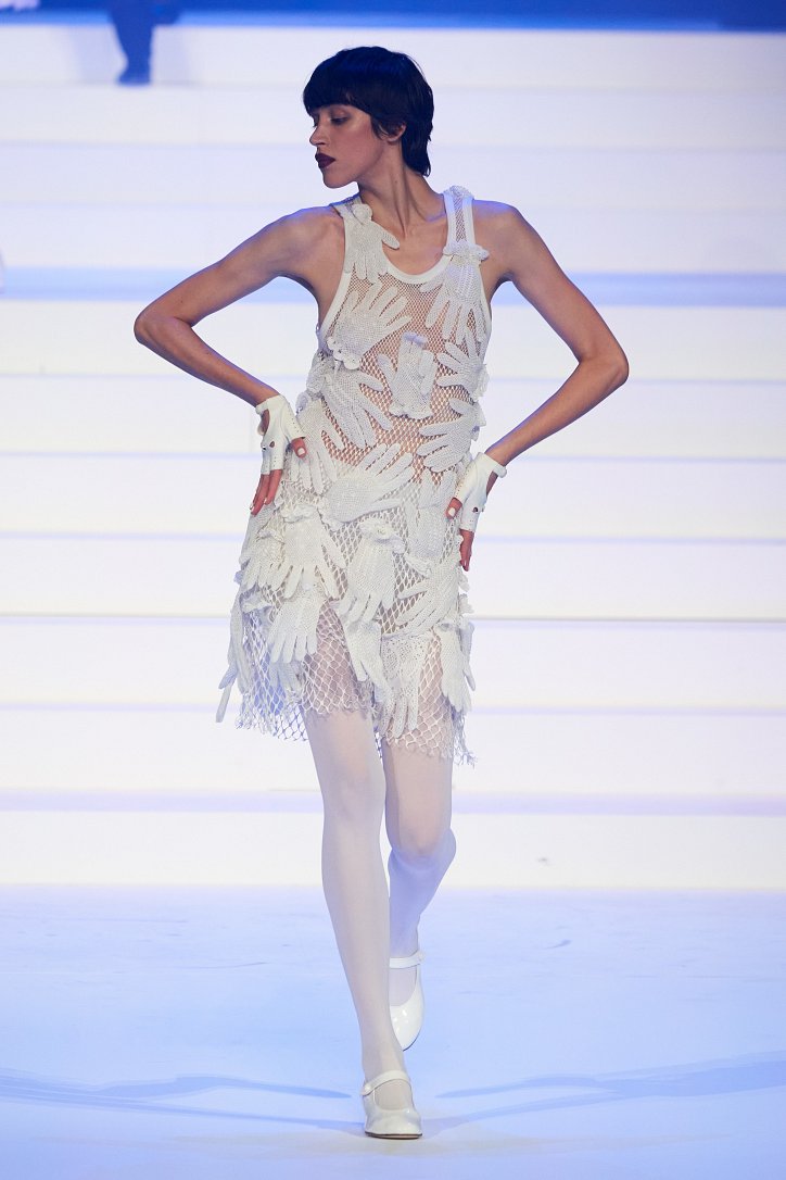 Karlie Kloss (вся в черном, как и надлежит в такой ситуации, да еще и с похоронным венком на спине) смело открыла крышку – и перед публикой предстала вполне себе живая модель в белом мини-платье, сшитом из множества детских (или кукольных) платьиц.
