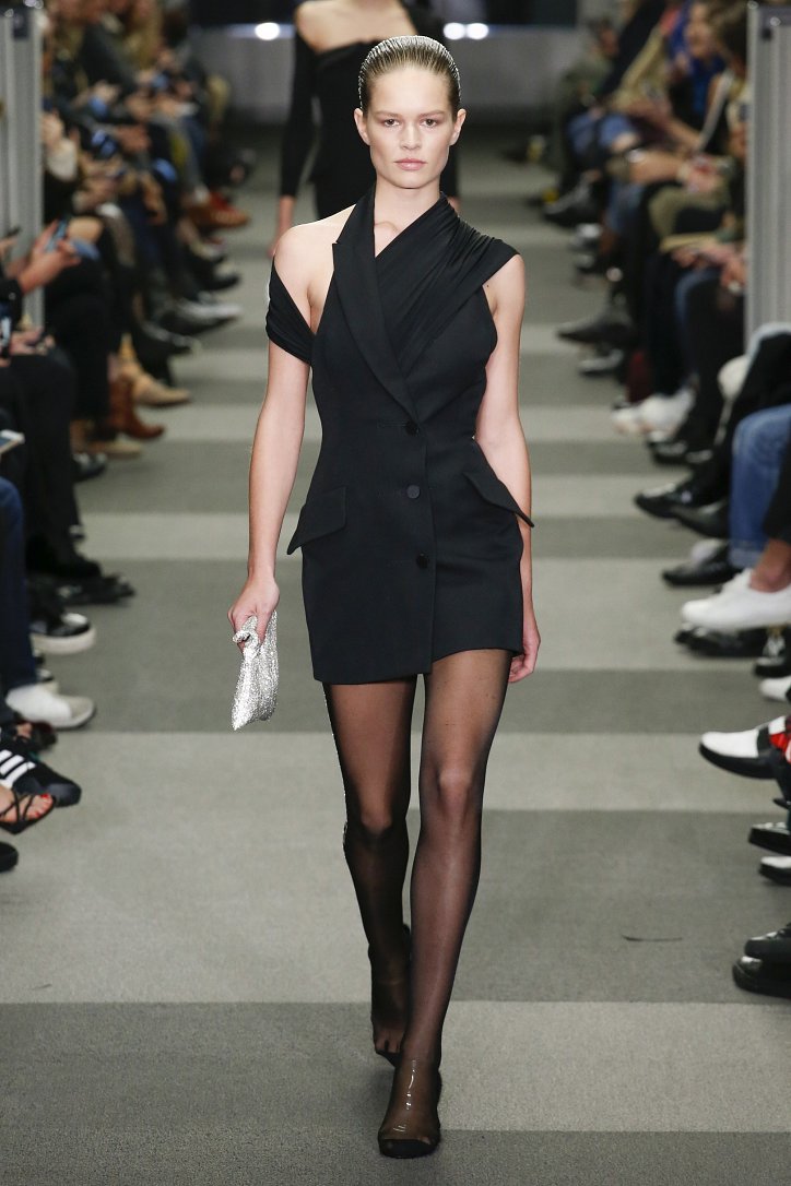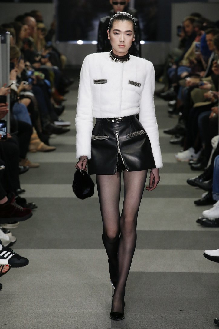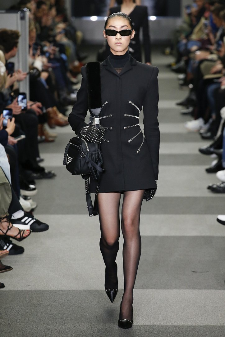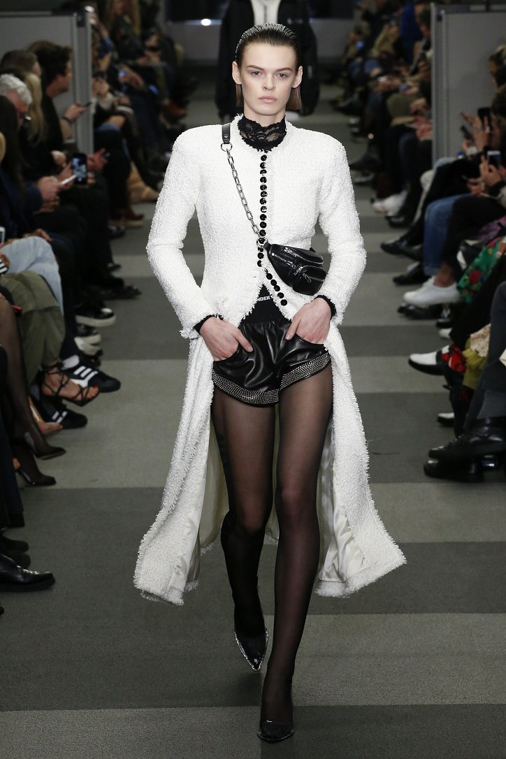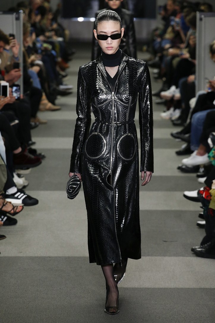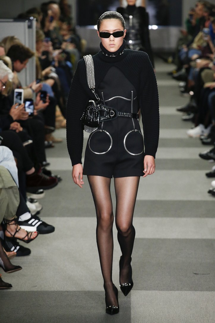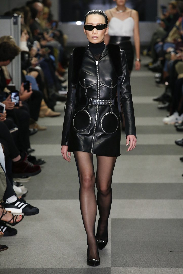 Черно-белая коллекция Alexander Wang осень-зима 2018-2019 создана для современных Тринити. Она дерзкая и сексуальная, смелая и экстравагантная. Ставку дизайнер сделал на длину мини (стремящуюся к микро), черную кожу, очки (естественно, а-ля Матрица) и рок.