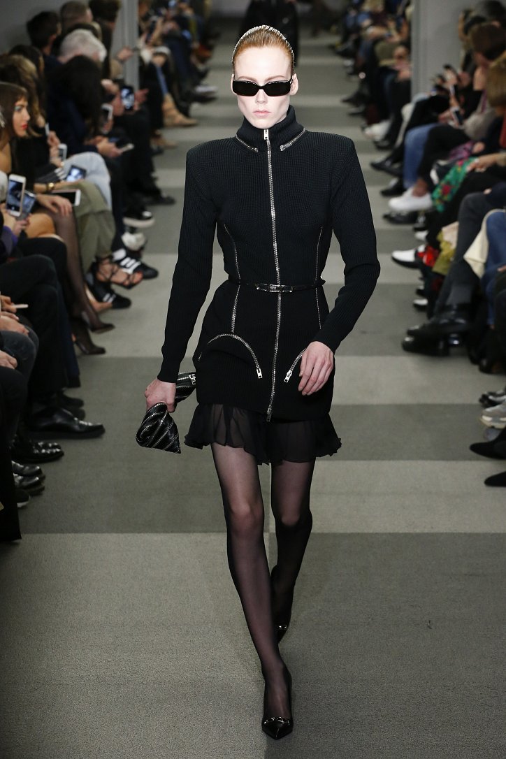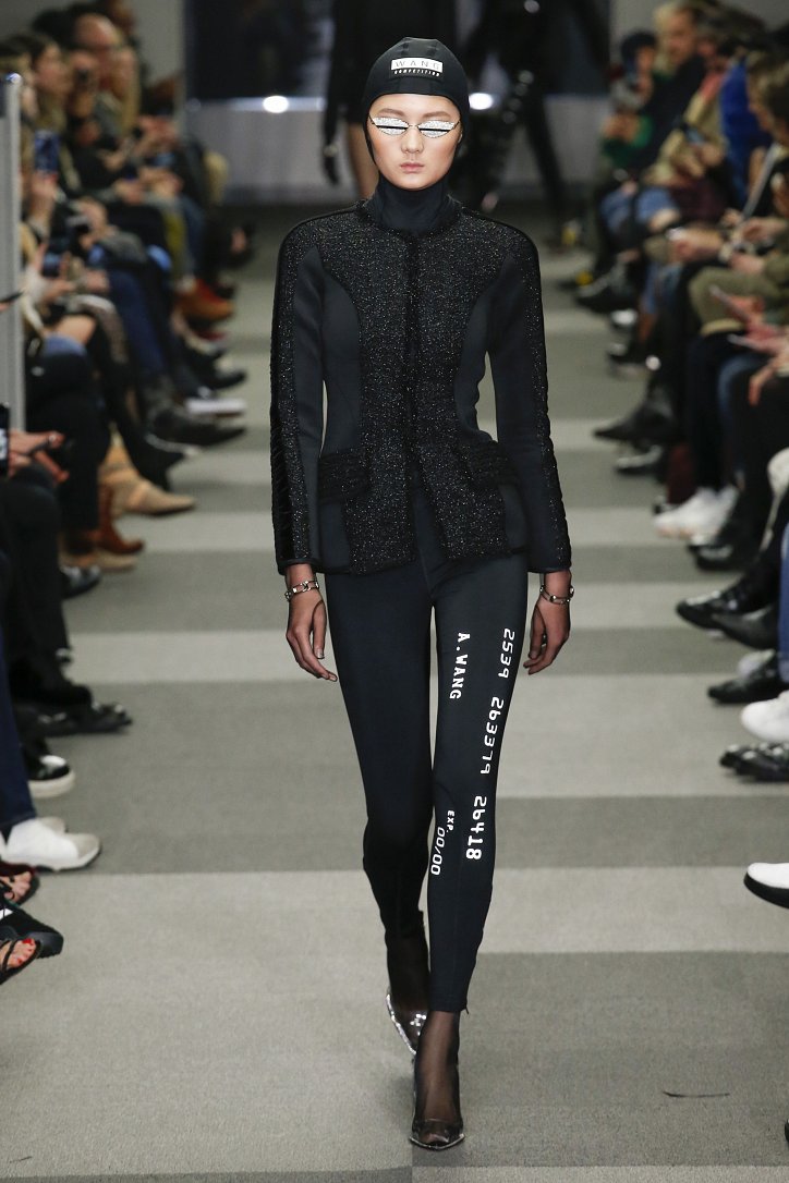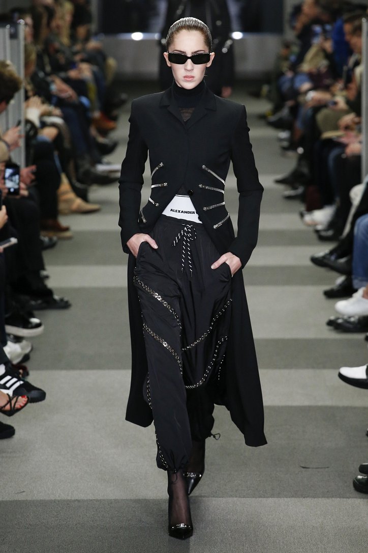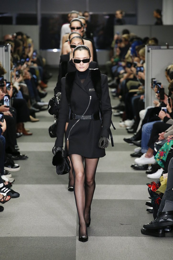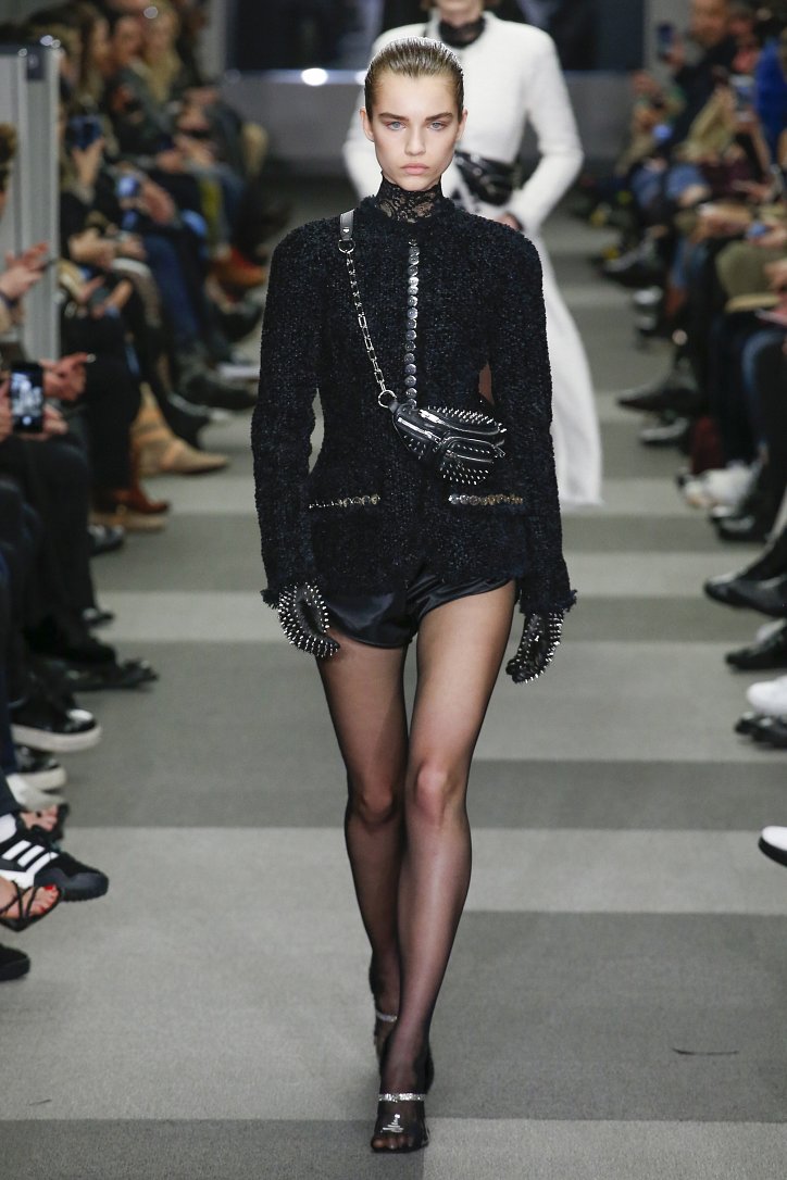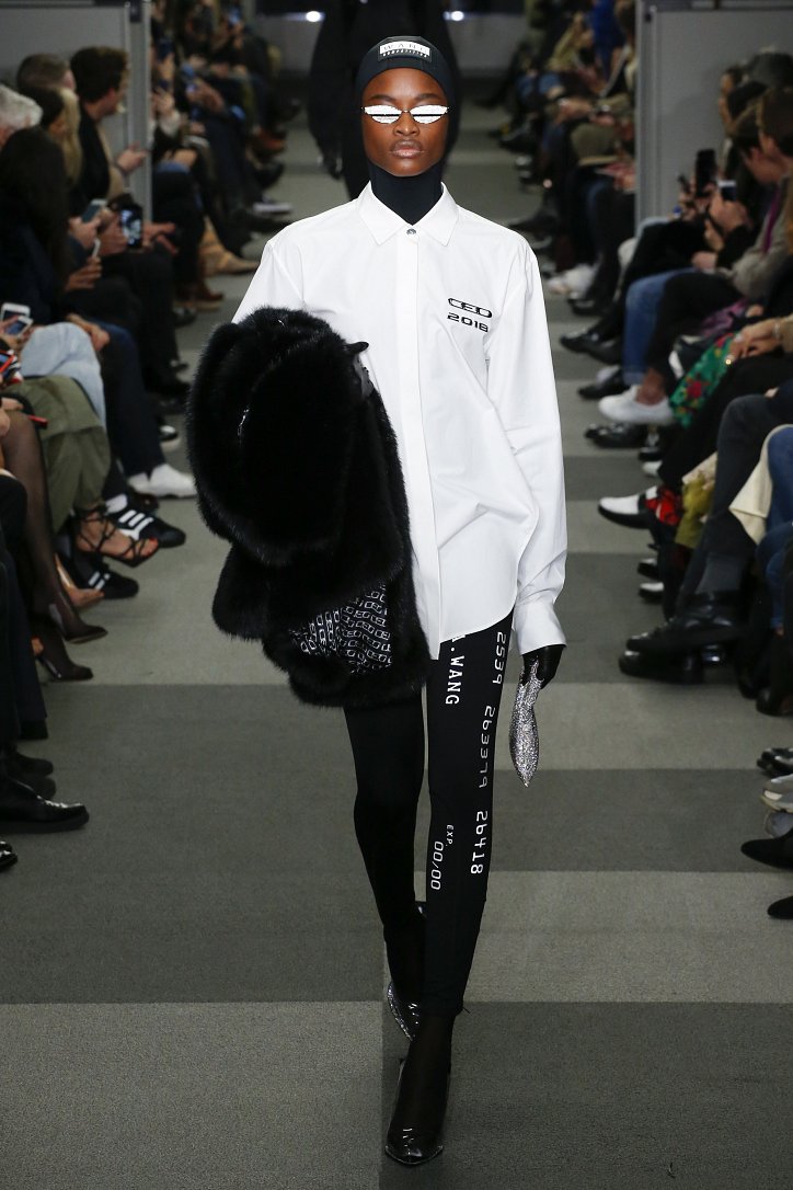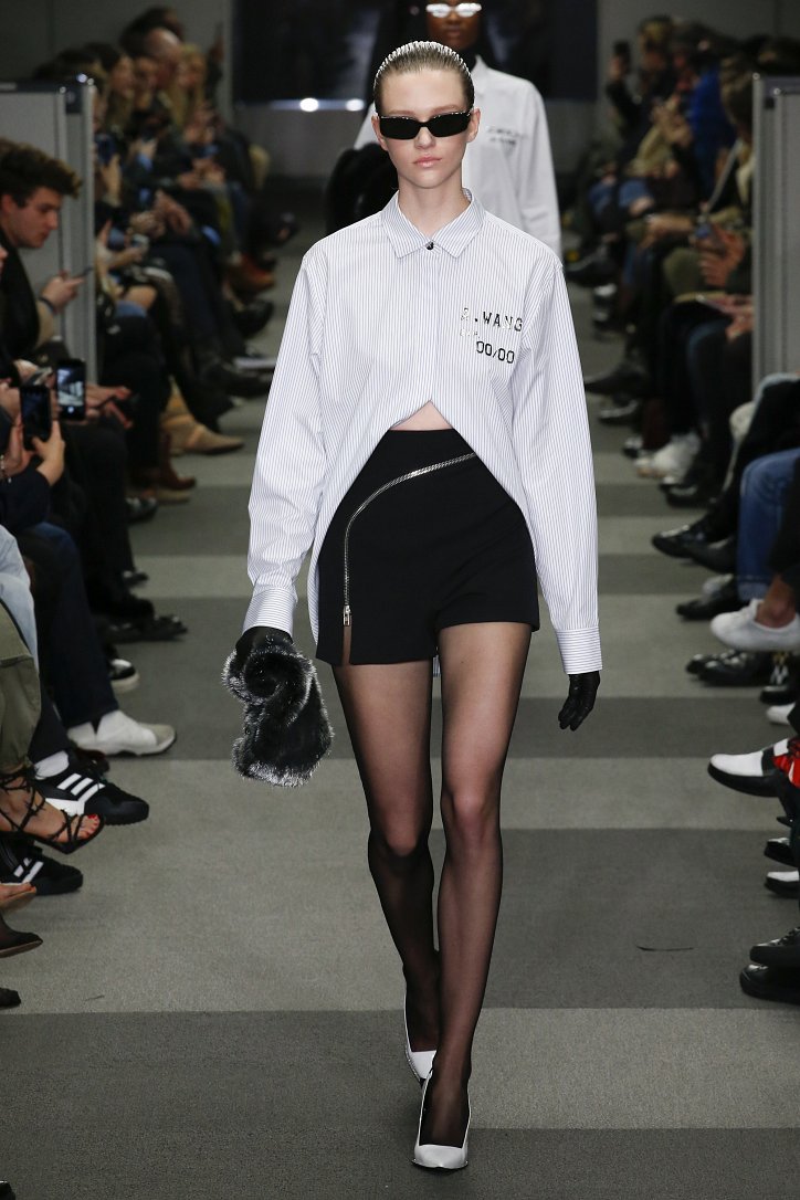 Черно-белая коллекция Alexander Wang осень-зима 2018-2019 создана для современных Тринити. Она дерзкая и сексуальная, смелая и экстравагантная. Ставку дизайнер сделал на длину мини (стремящуюся к микро), черную кожу, очки (естественно, а-ля Матрица) и рок.