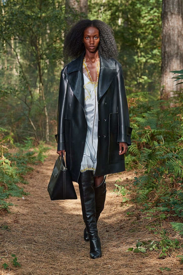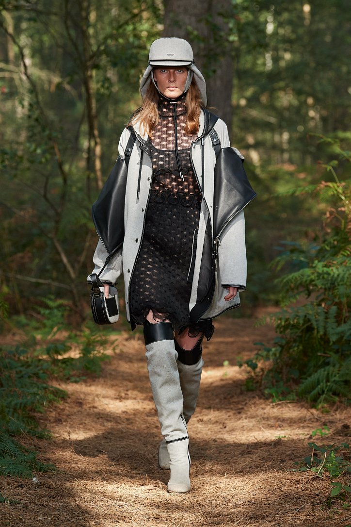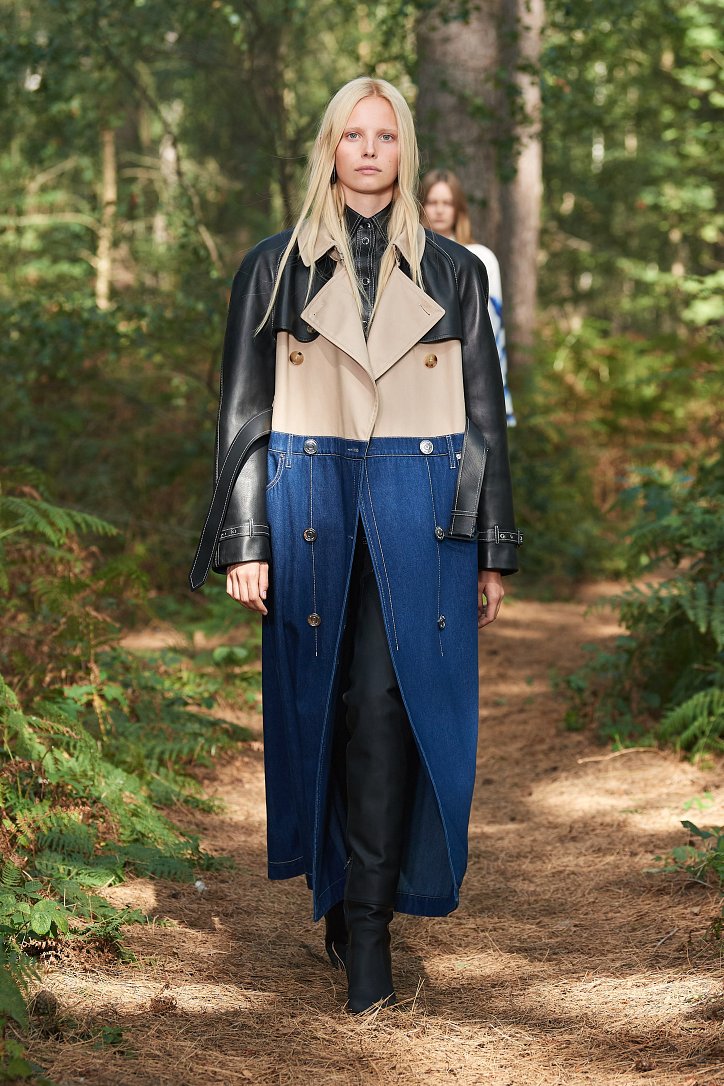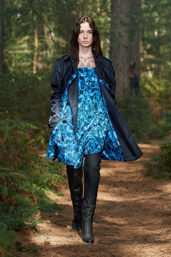 Рассуждая о чувствах людей, попавших в столь необычные и непростые условия, дизайнер не только использует в качестве фона для показа настоящий лес, но и демонстрирует множество отсылок к морю. Синих оттенков в коллекции было настолько много, что они даже затмили «фирменную» бежевую палитру дома моды. Кроме того, о море напоминали принты, рыбацкие сапоги и похожие на рыбью чешую блестящие материалы.