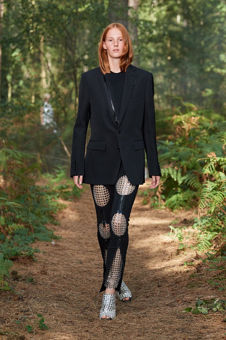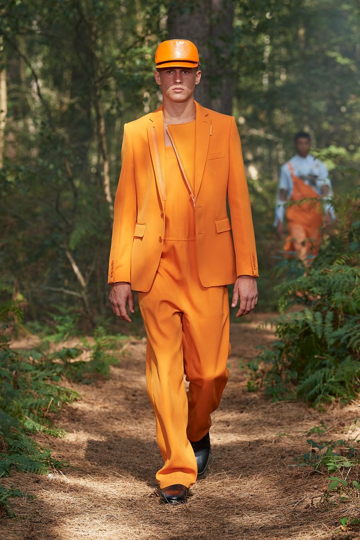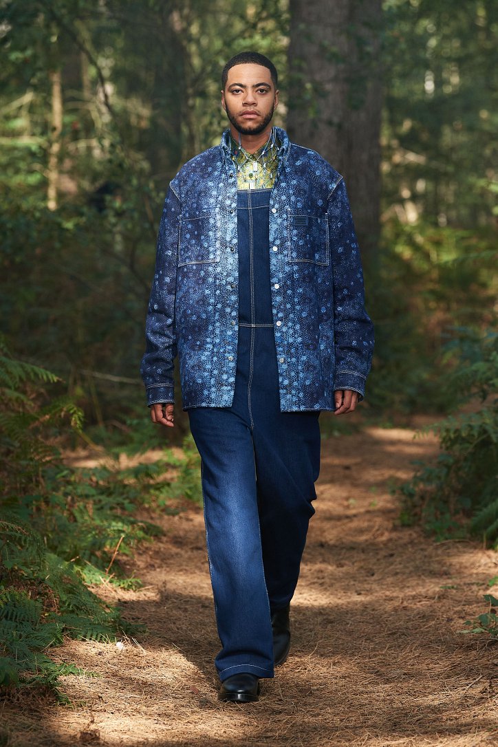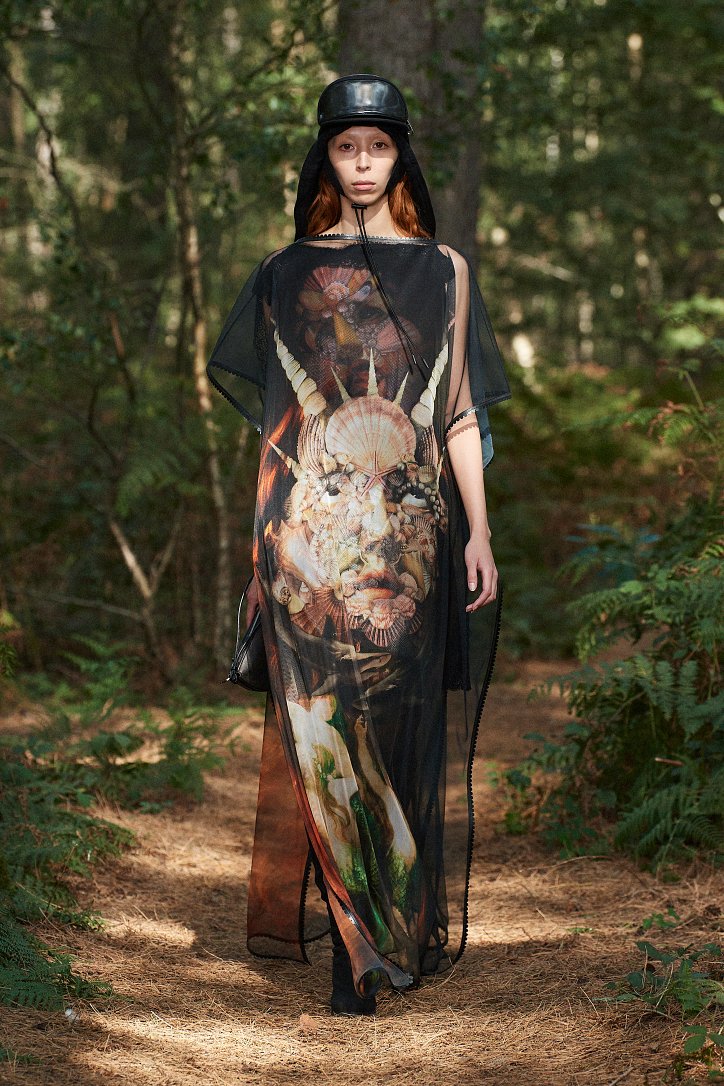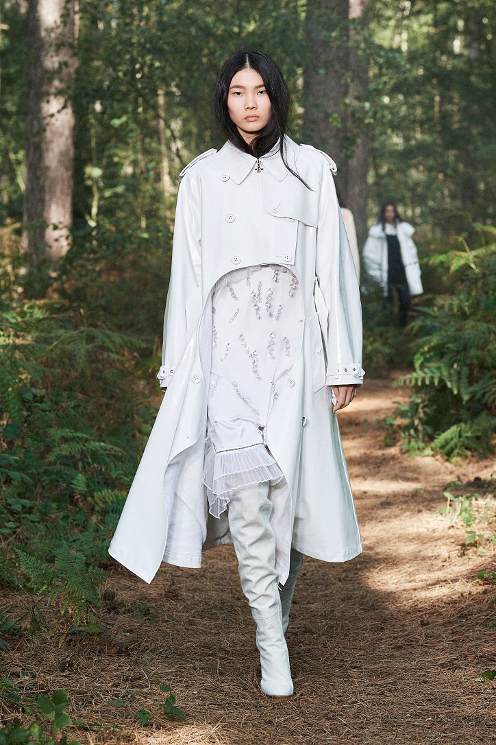 Рассуждая о чувствах людей, попавших в столь необычные и непростые условия, дизайнер не только использует в качестве фона для показа настоящий лес, но и демонстрирует множество отсылок к морю. Синих оттенков в коллекции было настолько много, что они даже затмили «фирменную» бежевую палитру дома моды. Кроме того, о море напоминали принты, рыбацкие сапоги и похожие на рыбью чешую блестящие материалы.