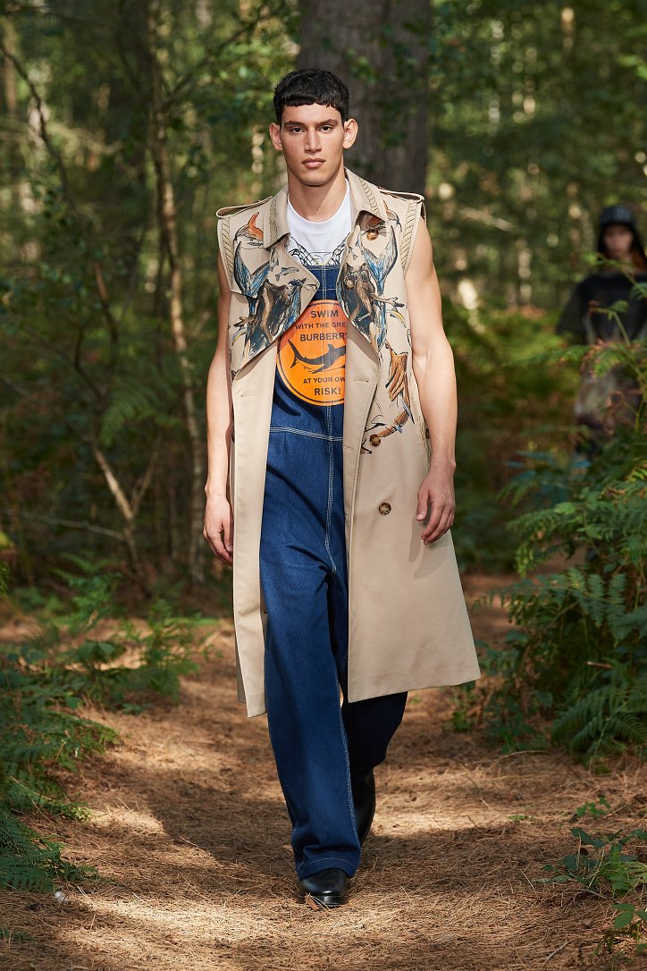 В качестве декораций Риккардо Тиши выбрал лес. Эта локация была символичной: коллекция Burberry показывает «две стороны медали» - вынужденную изоляцию всего мира во время карантина и возможность побыть наедине с собой, с природой, со своими близкими.
