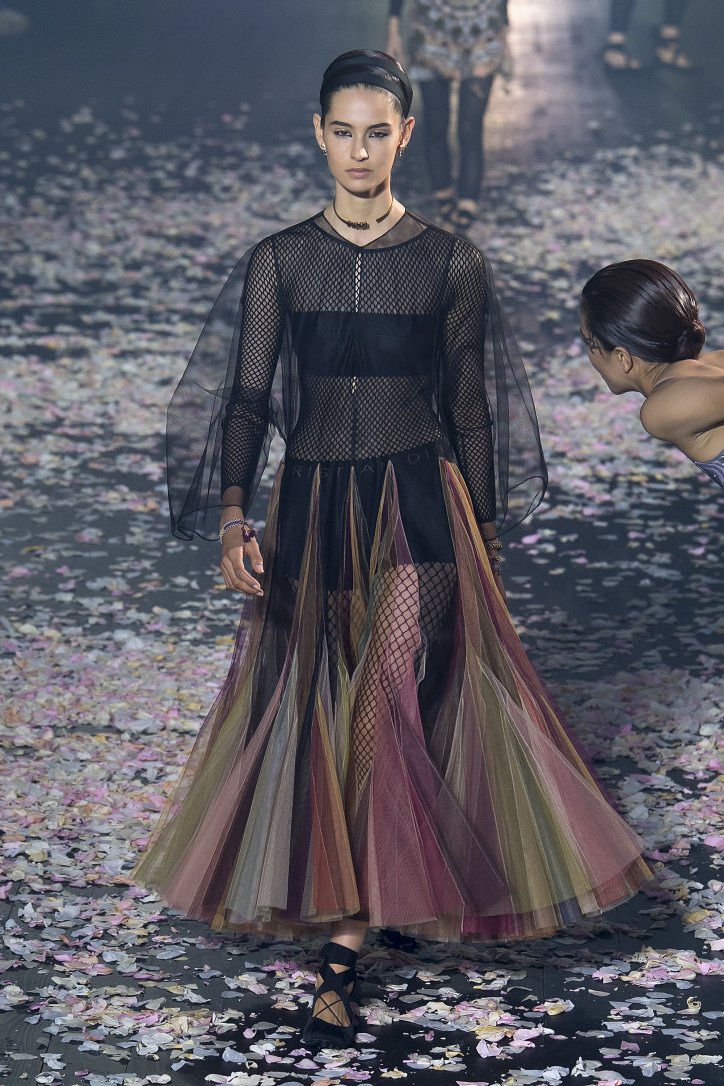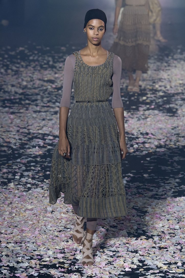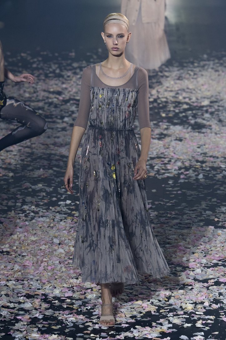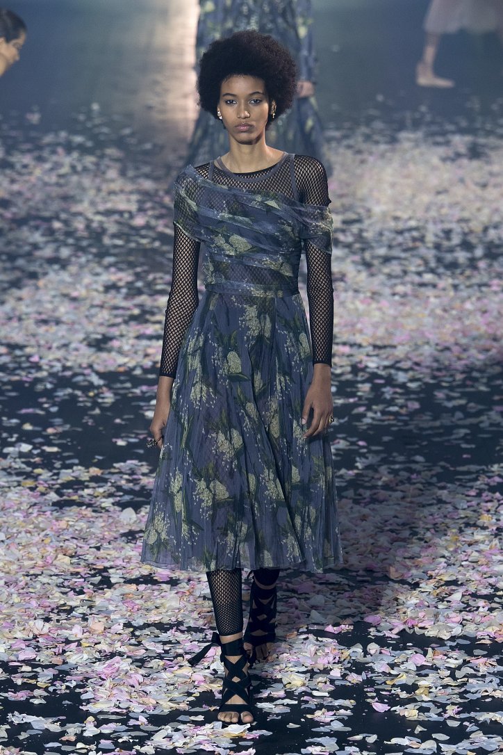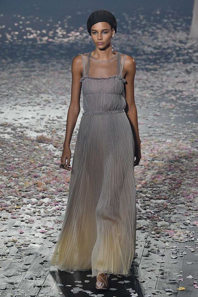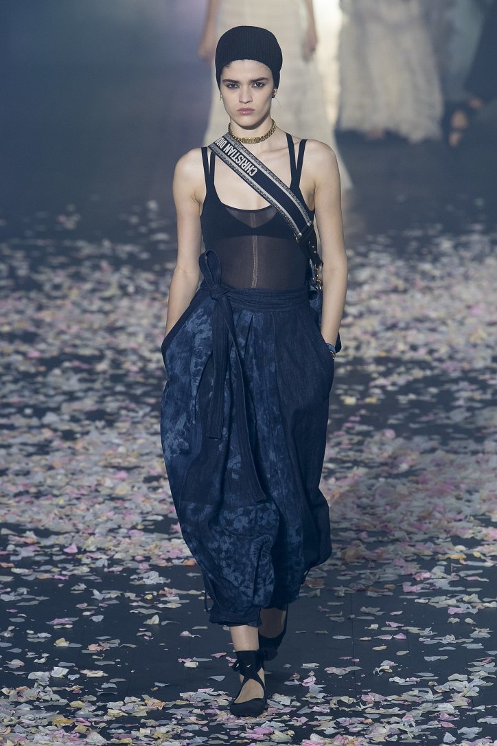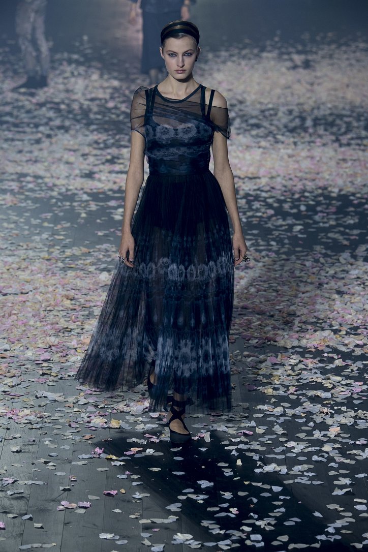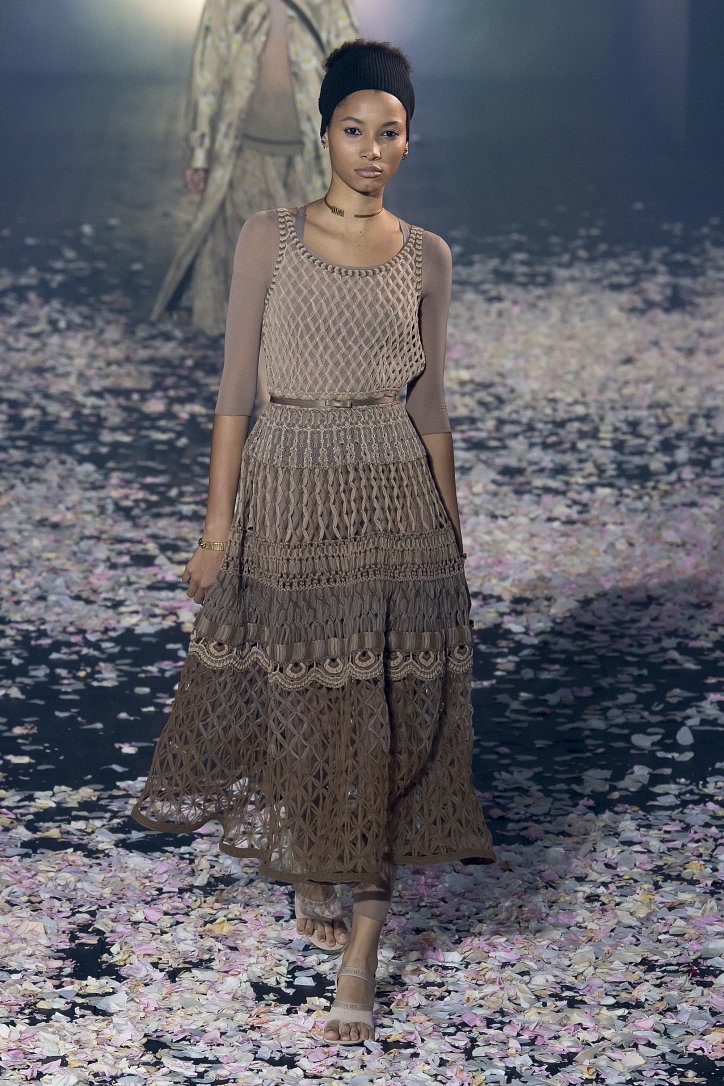 Коллекция Christian Dior – это новый взгляд на диоровские силуэты. Свобода для Кьюри – это отказ от корсетов и жестких тканей. На их место пришли тюль и макраме, джерси и шелк. Привычный New Look стал мягче и нежнее, а влияние балета было заметно в летящих юбках, туфельках-пуантах и сдержанной цветовой гамме: беж, кофе с молоком, экрю, черный, темно-синий, хаки и серый. И ни одной яркой вспышки – даже цветы были выполнены в технике tie-dye!