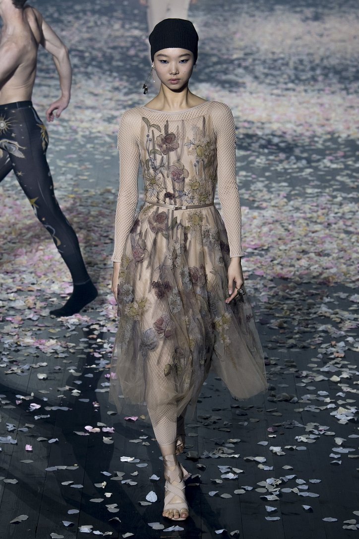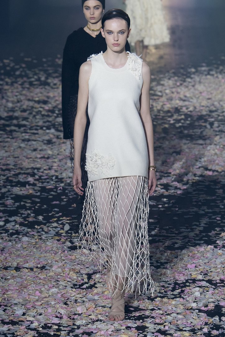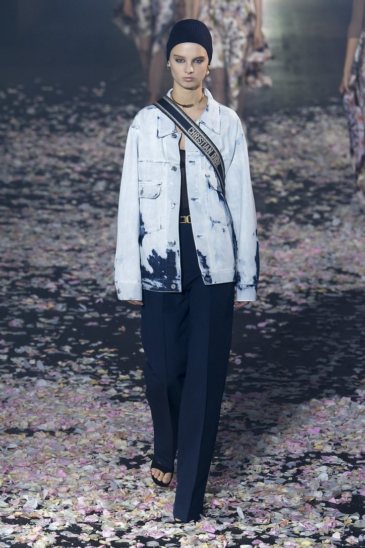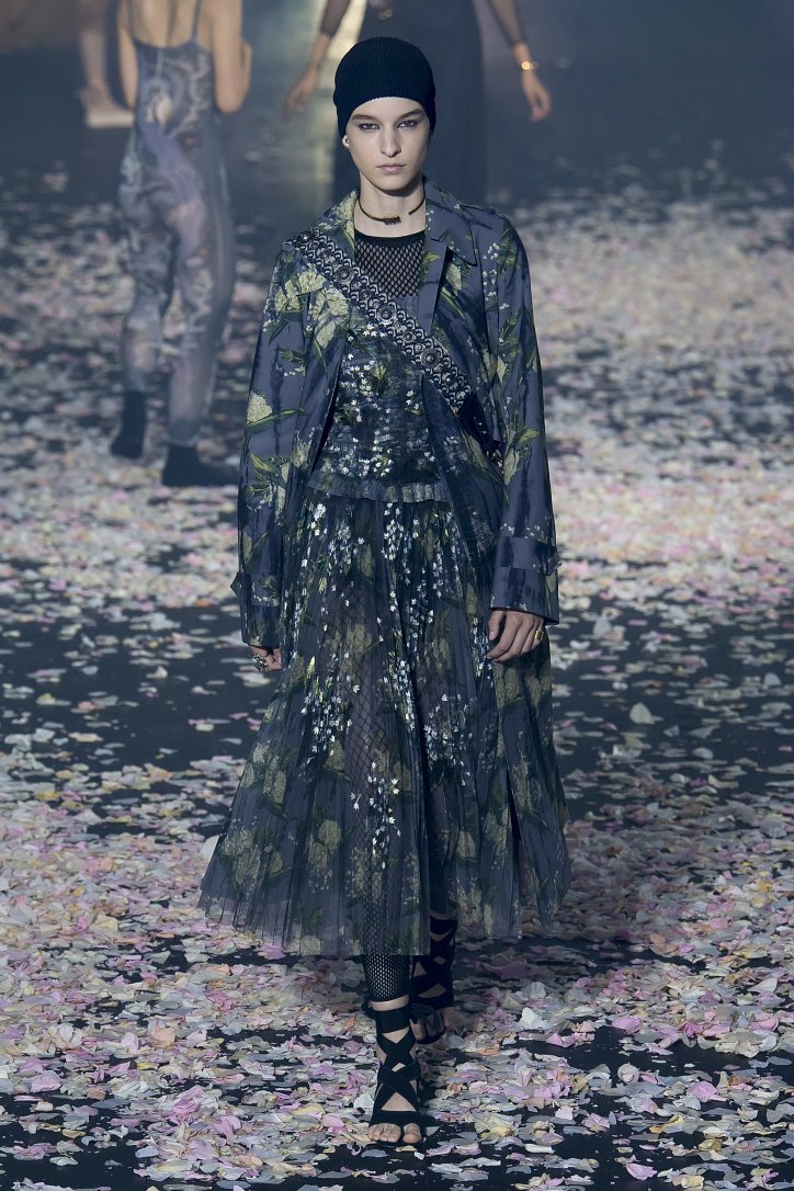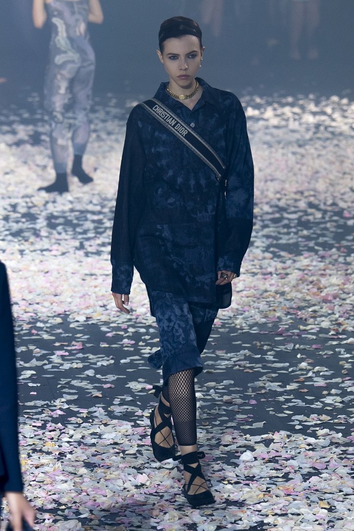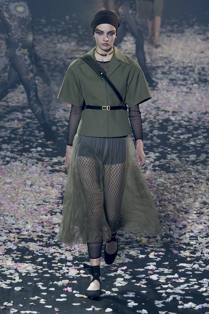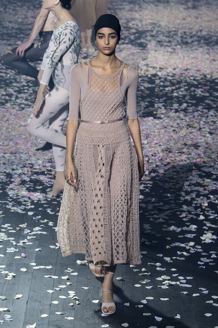 Коллекция Christian Dior – это новый взгляд на диоровские силуэты. Свобода для Кьюри – это отказ от корсетов и жестких тканей. На их место пришли тюль и макраме, джерси и шелк. Привычный New Look стал мягче и нежнее, а влияние балета было заметно в летящих юбках, туфельках-пуантах и сдержанной цветовой гамме: беж, кофе с молоком, экрю, черный, темно-синий, хаки и серый. И ни одной яркой вспышки – даже цветы были выполнены в технике tie-dye!