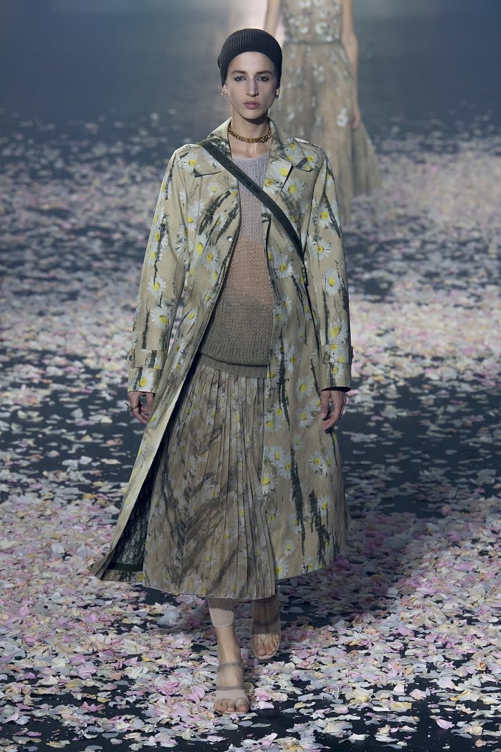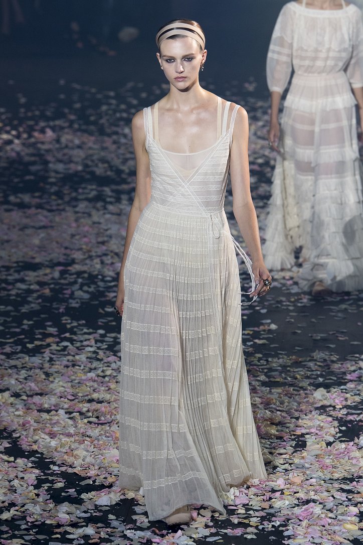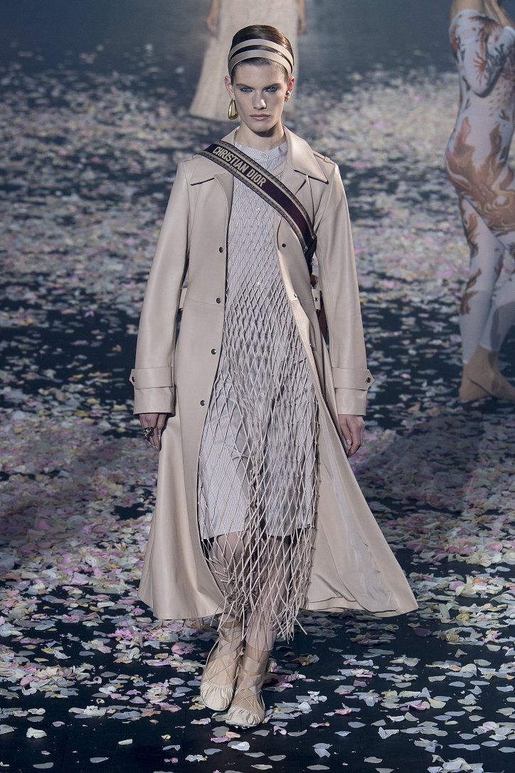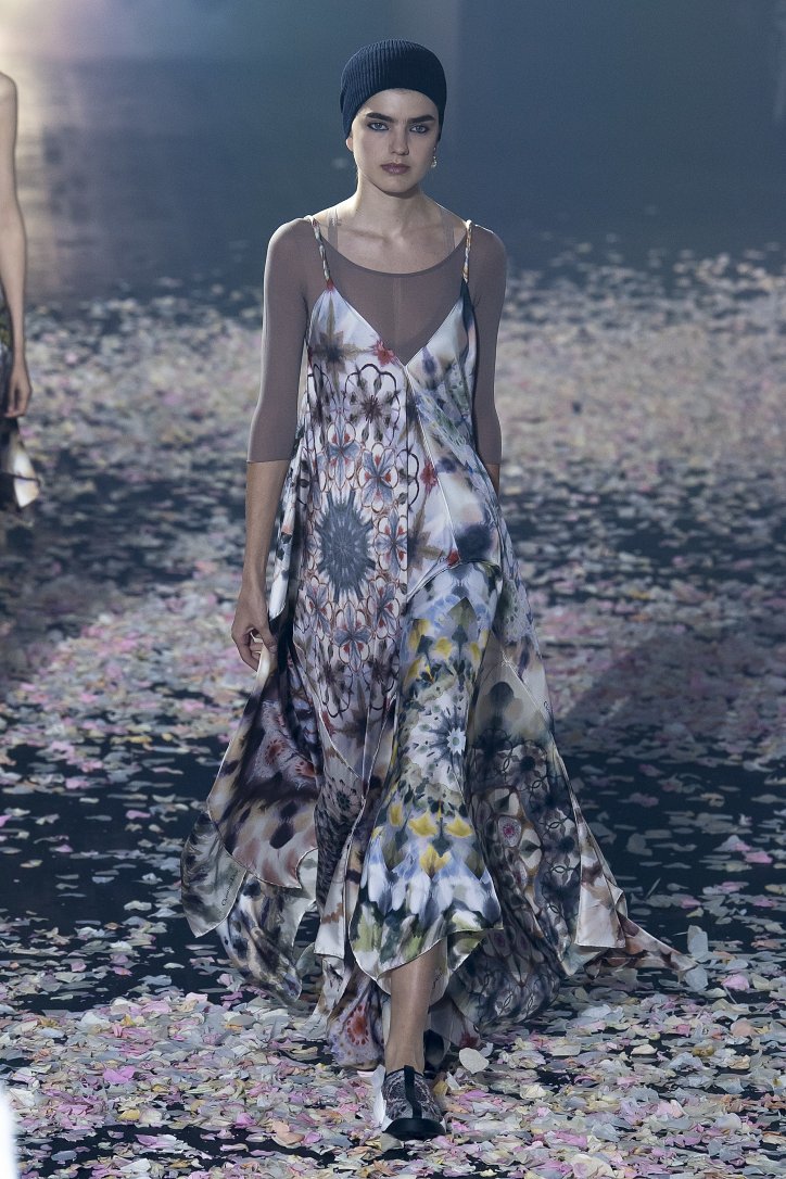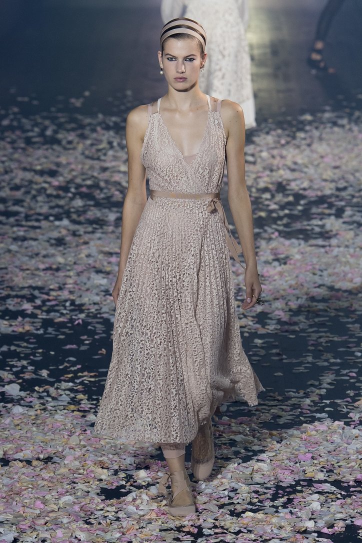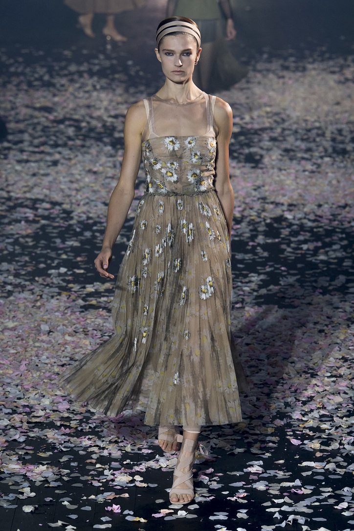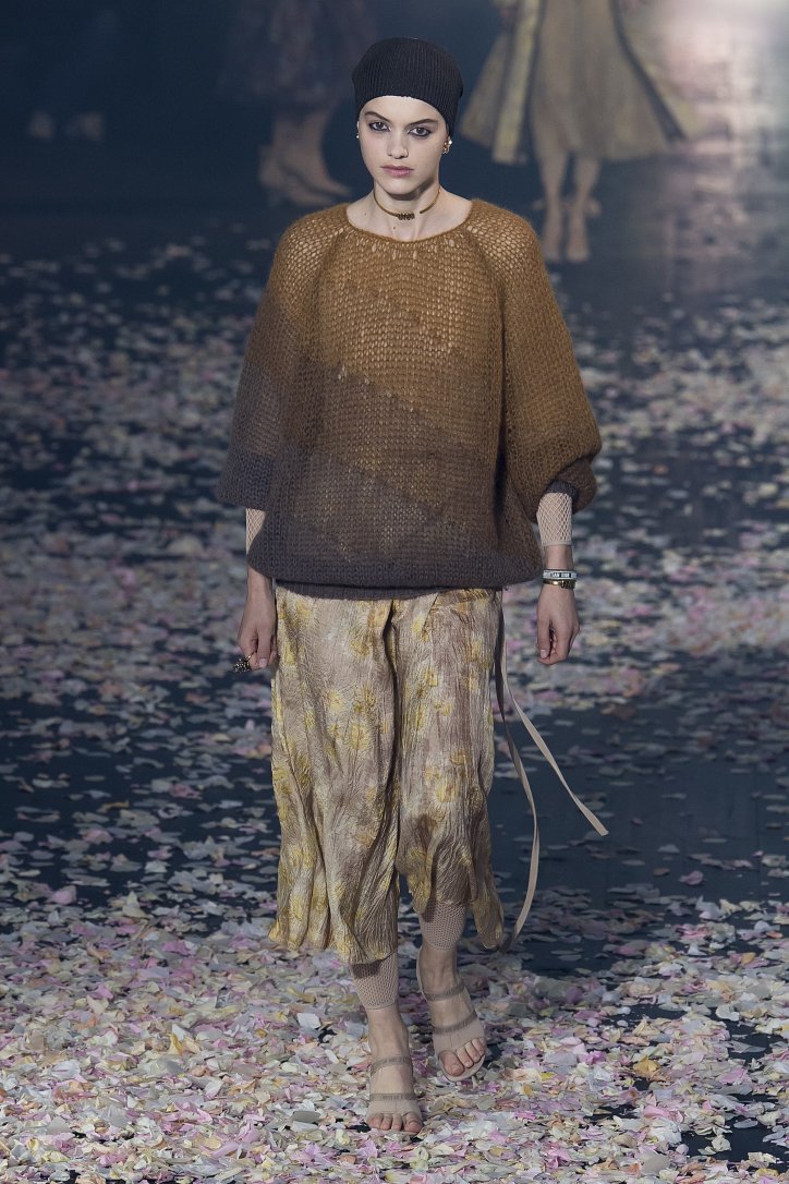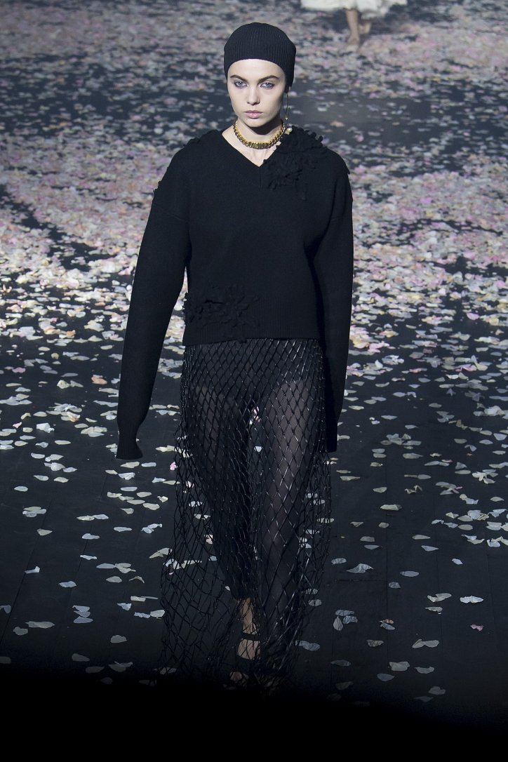 Коллекция Christian Dior – это новый взгляд на диоровские силуэты. Свобода для Кьюри – это отказ от корсетов и жестких тканей. На их место пришли тюль и макраме, джерси и шелк. Привычный New Look стал мягче и нежнее, а влияние балета было заметно в летящих юбках, туфельках-пуантах и сдержанной цветовой гамме: беж, кофе с молоком, экрю, черный, темно-синий, хаки и серый. И ни одной яркой вспышки – даже цветы были выполнены в технике tie-dye!
