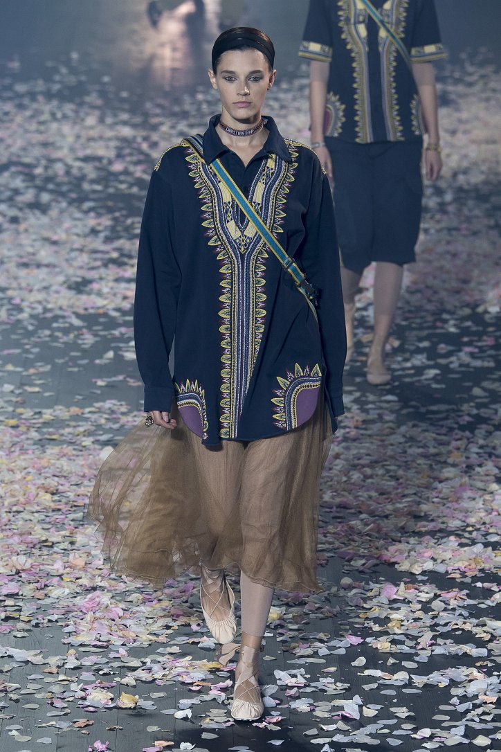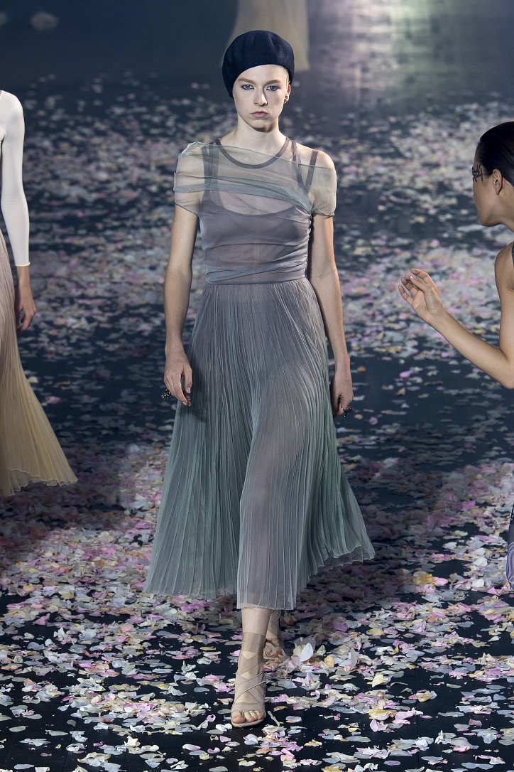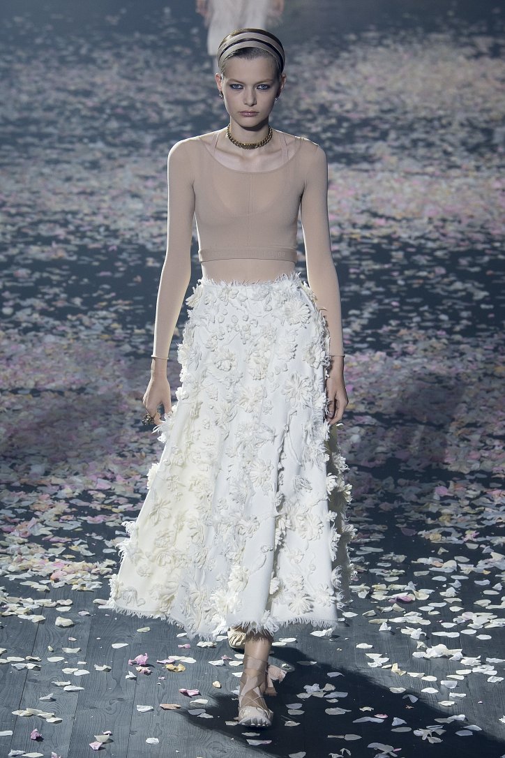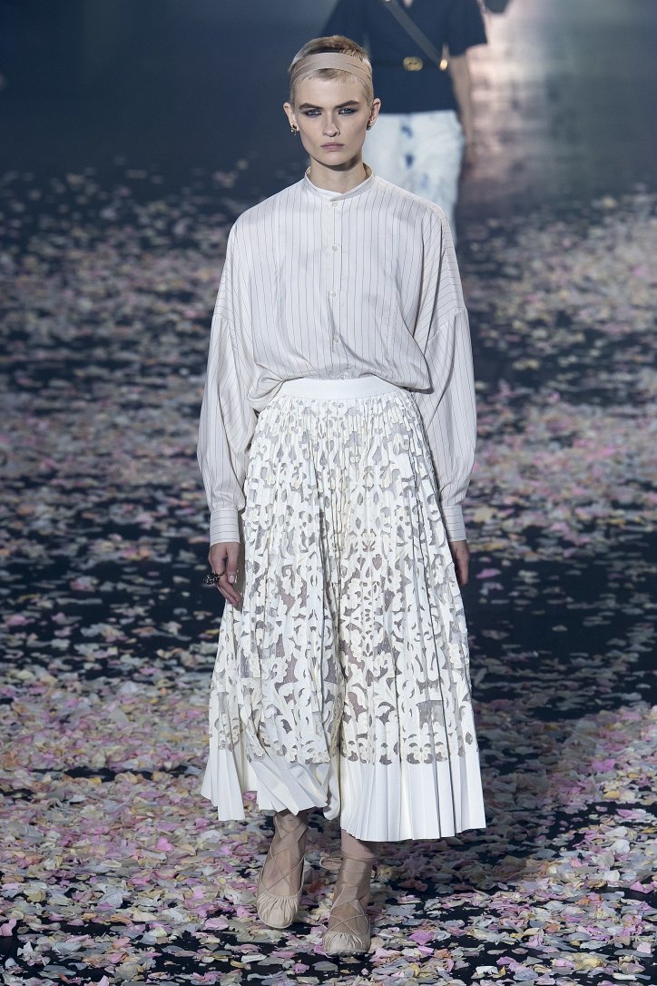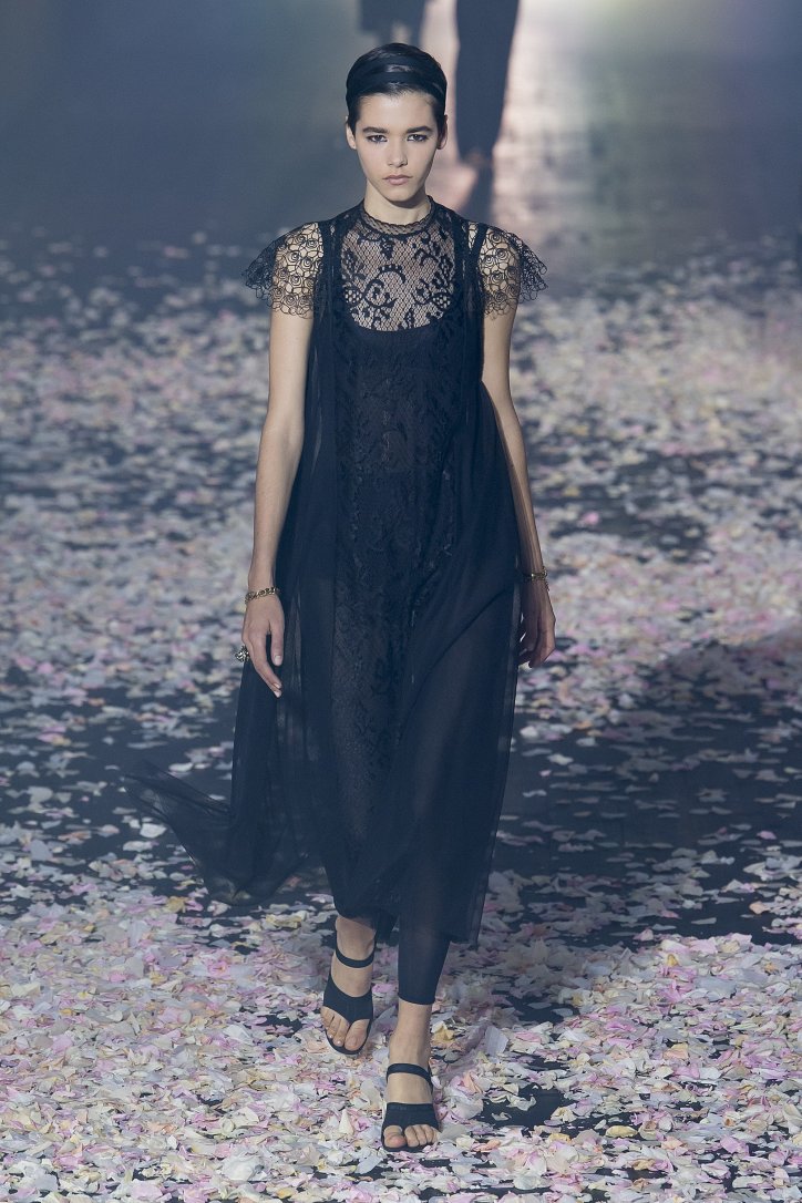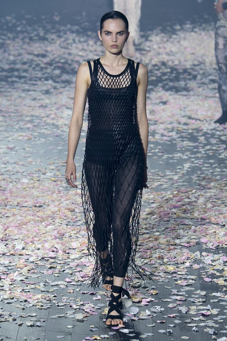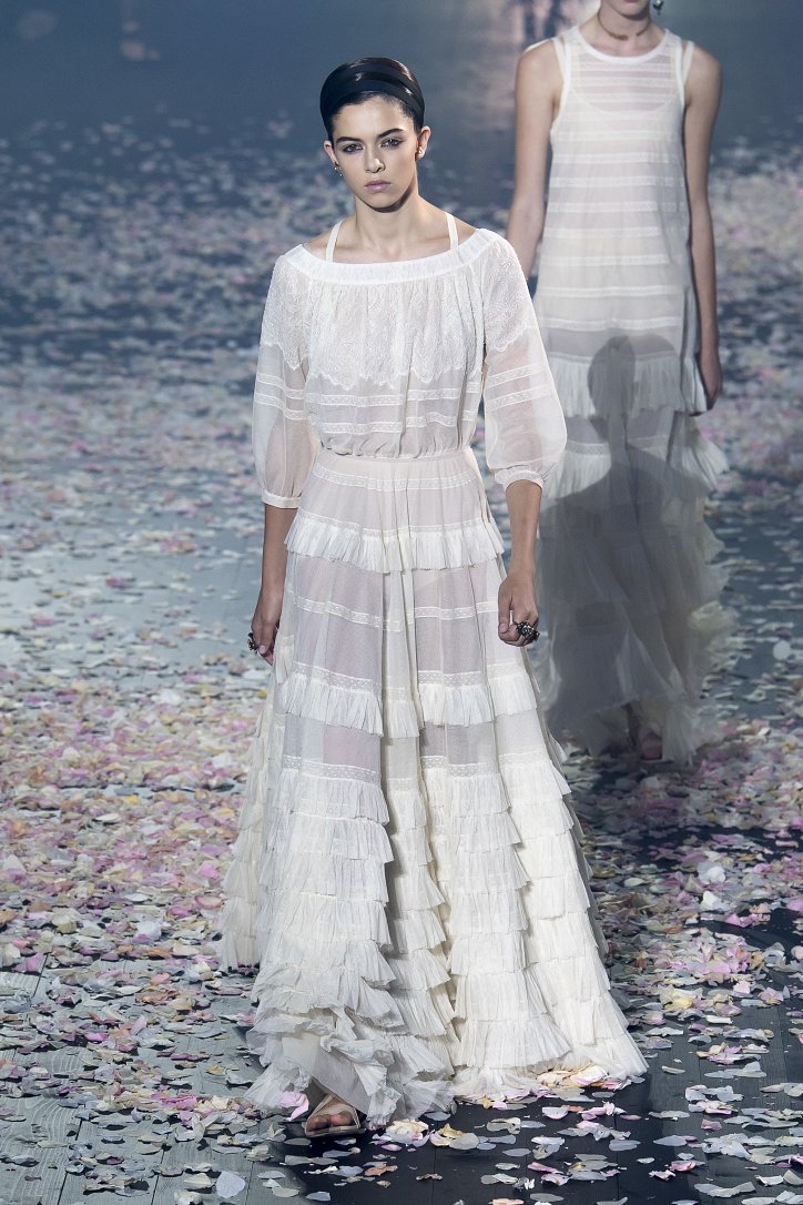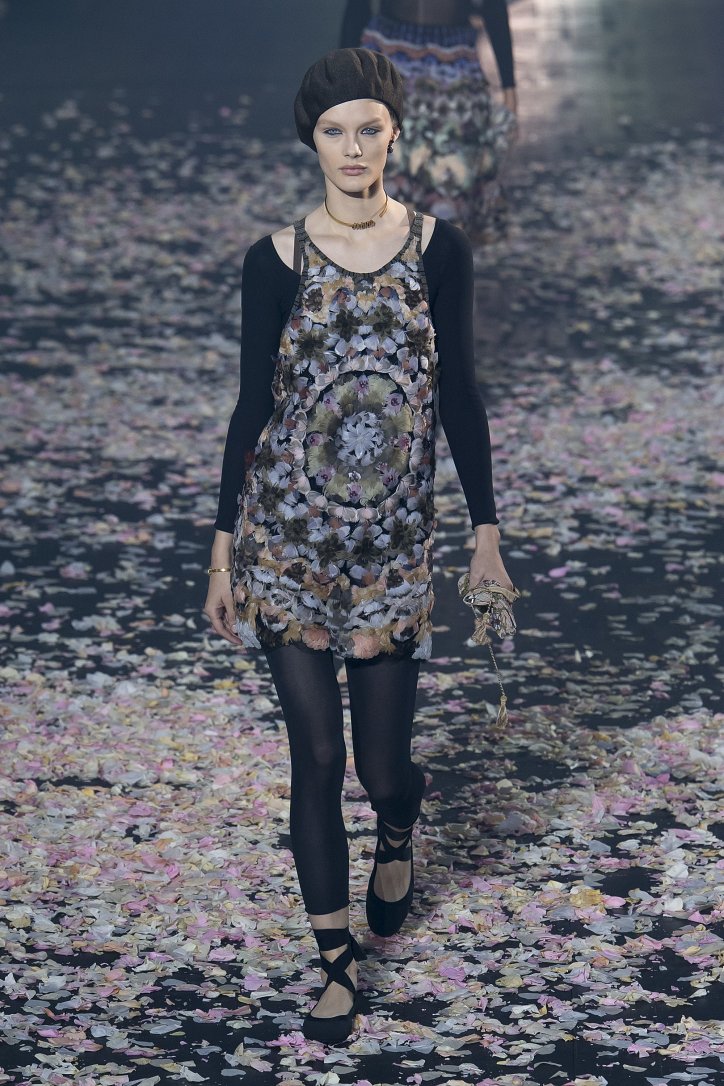 Коллекция Christian Dior – это новый взгляд на диоровские силуэты. Свобода для Кьюри – это отказ от корсетов и жестких тканей. На их место пришли тюль и макраме, джерси и шелк. Привычный New Look стал мягче и нежнее, а влияние балета было заметно в летящих юбках, туфельках-пуантах и сдержанной цветовой гамме: беж, кофе с молоком, экрю, черный, темно-синий, хаки и серый. И ни одной яркой вспышки – даже цветы были выполнены в технике tie-dye!