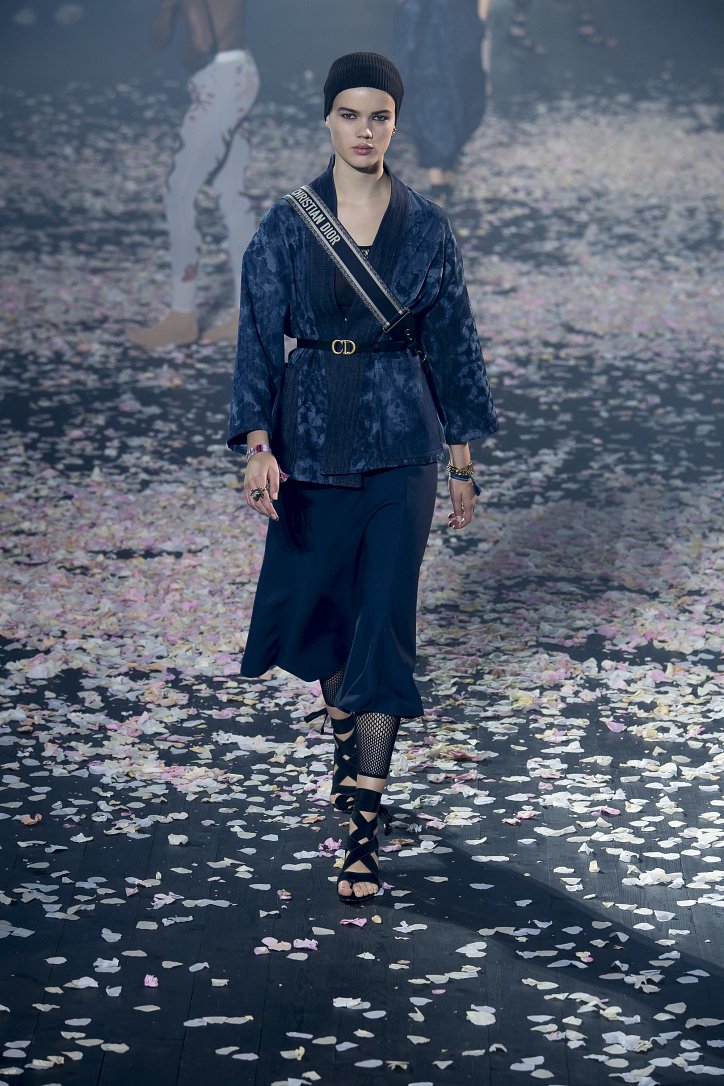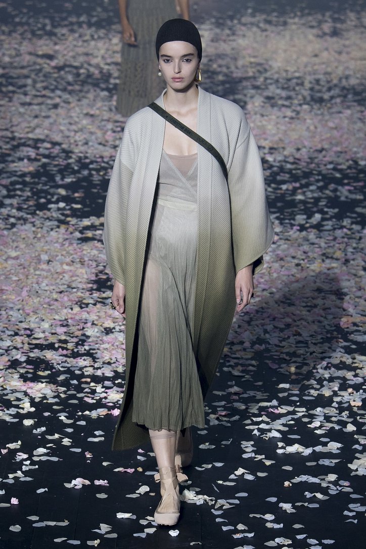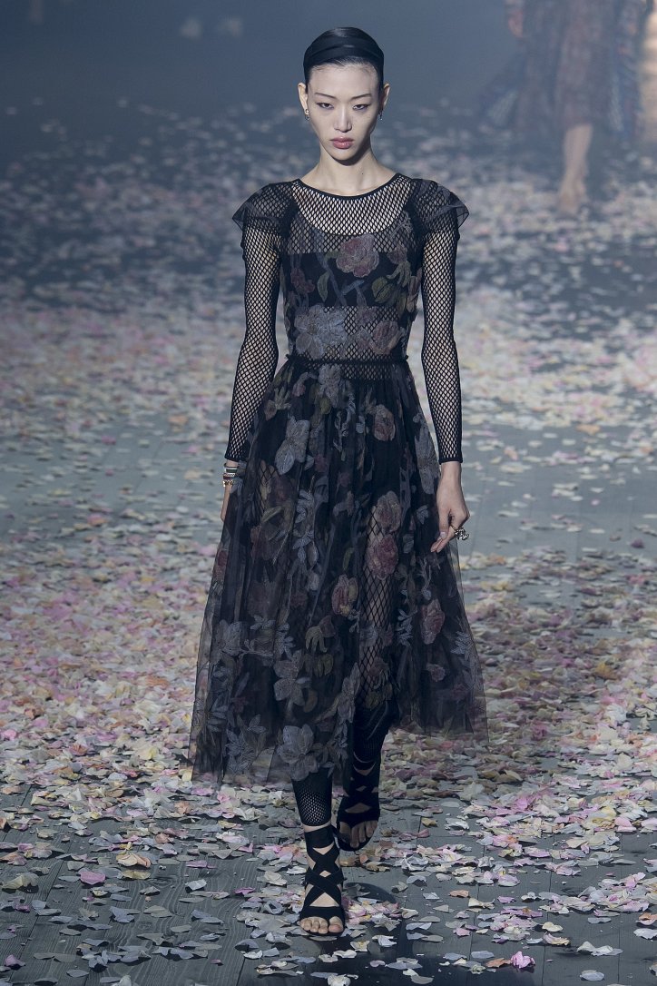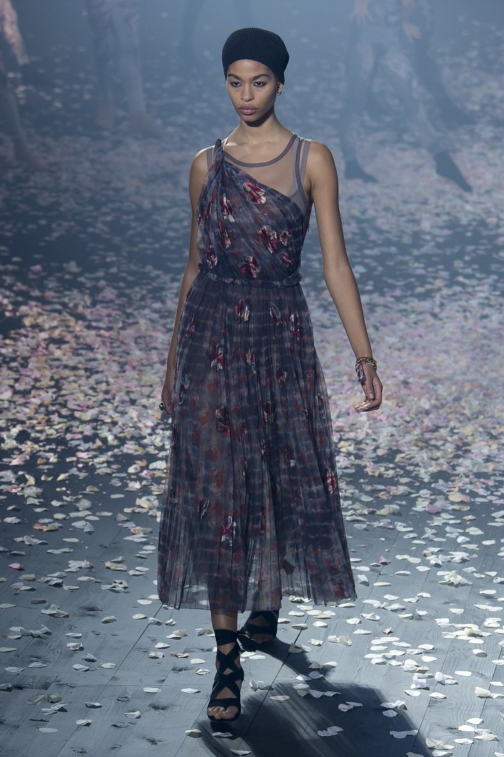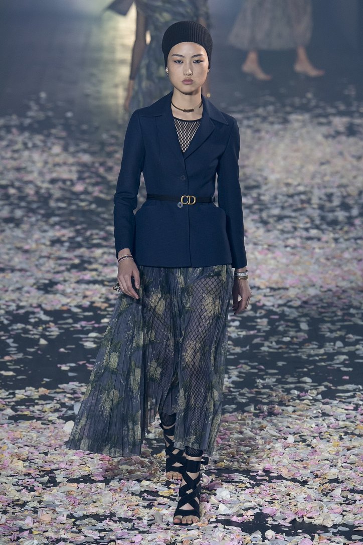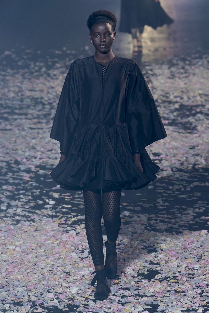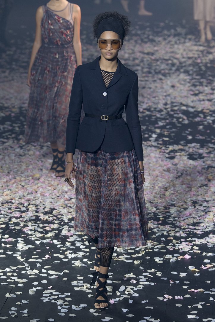 Коллекция Christian Dior – это новый взгляд на диоровские силуэты. Свобода для Кьюри – это отказ от корсетов и жестких тканей. На их место пришли тюль и макраме, джерси и шелк. Привычный New Look стал мягче и нежнее, а влияние балета было заметно в летящих юбках, туфельках-пуантах и сдержанной цветовой гамме: беж, кофе с молоком, экрю, черный, темно-синий, хаки и серый. И ни одной яркой вспышки – даже цветы были выполнены в технике tie-dye!