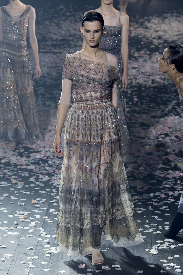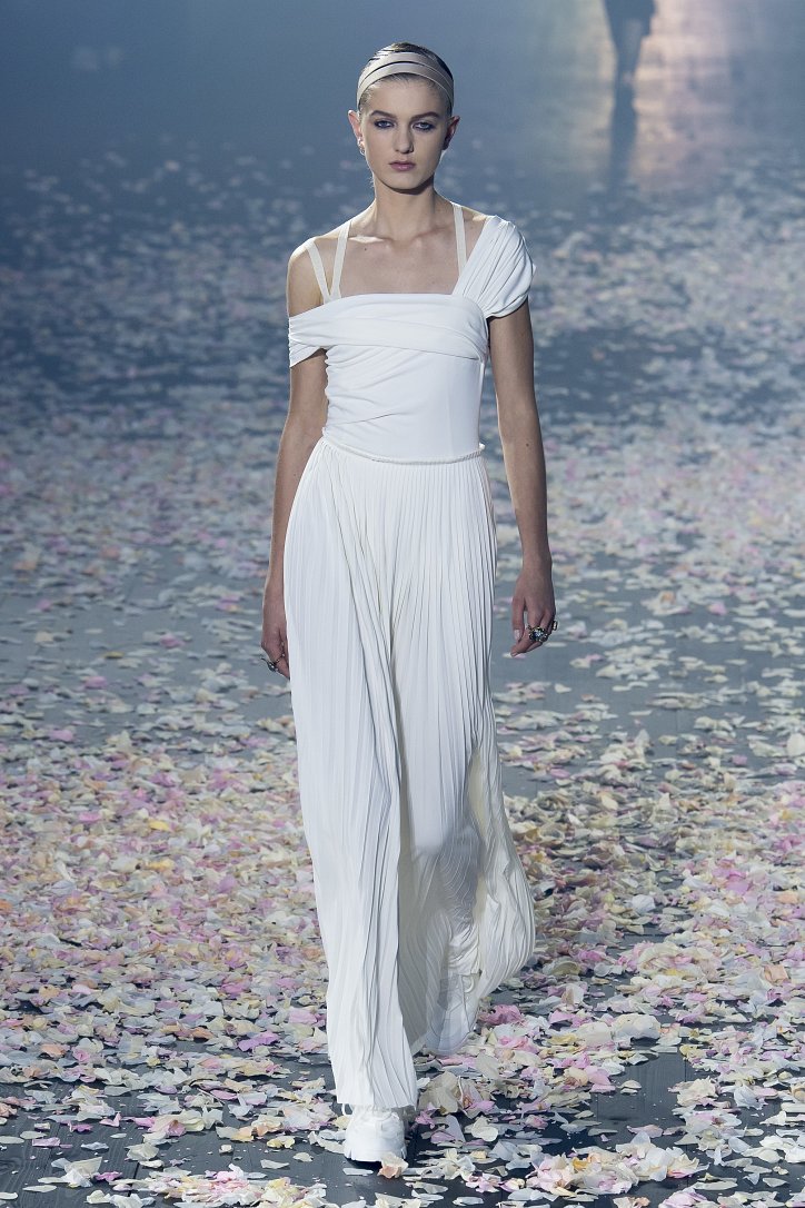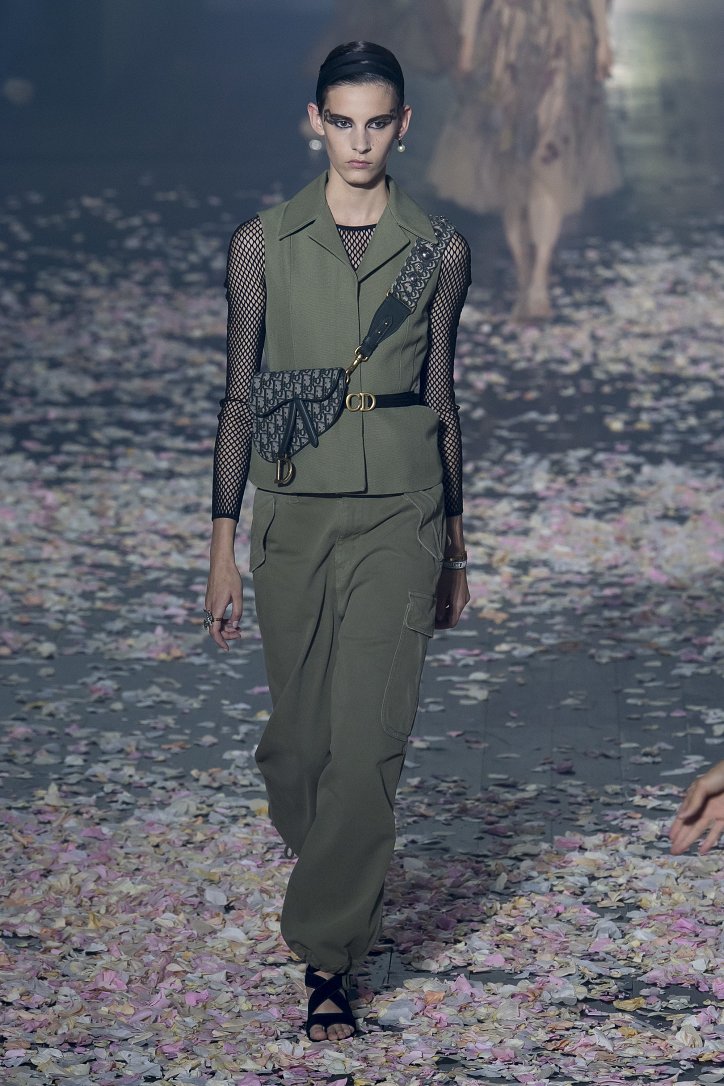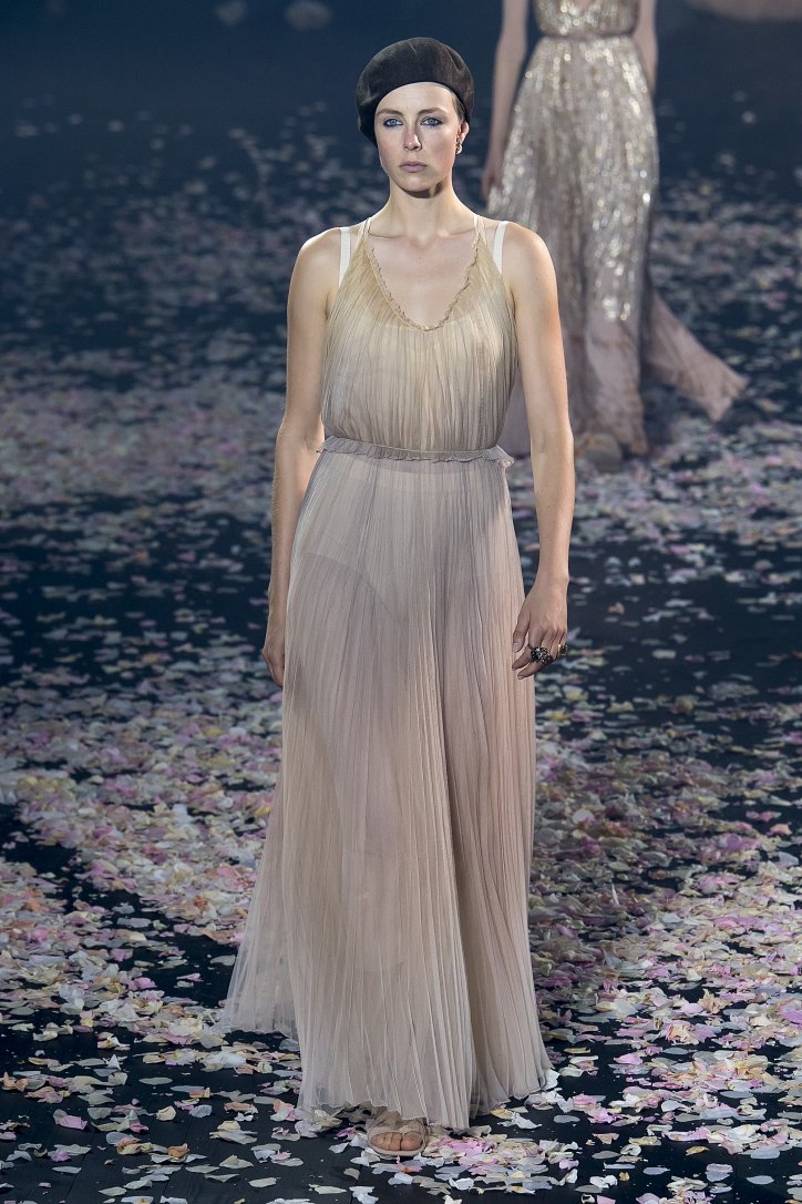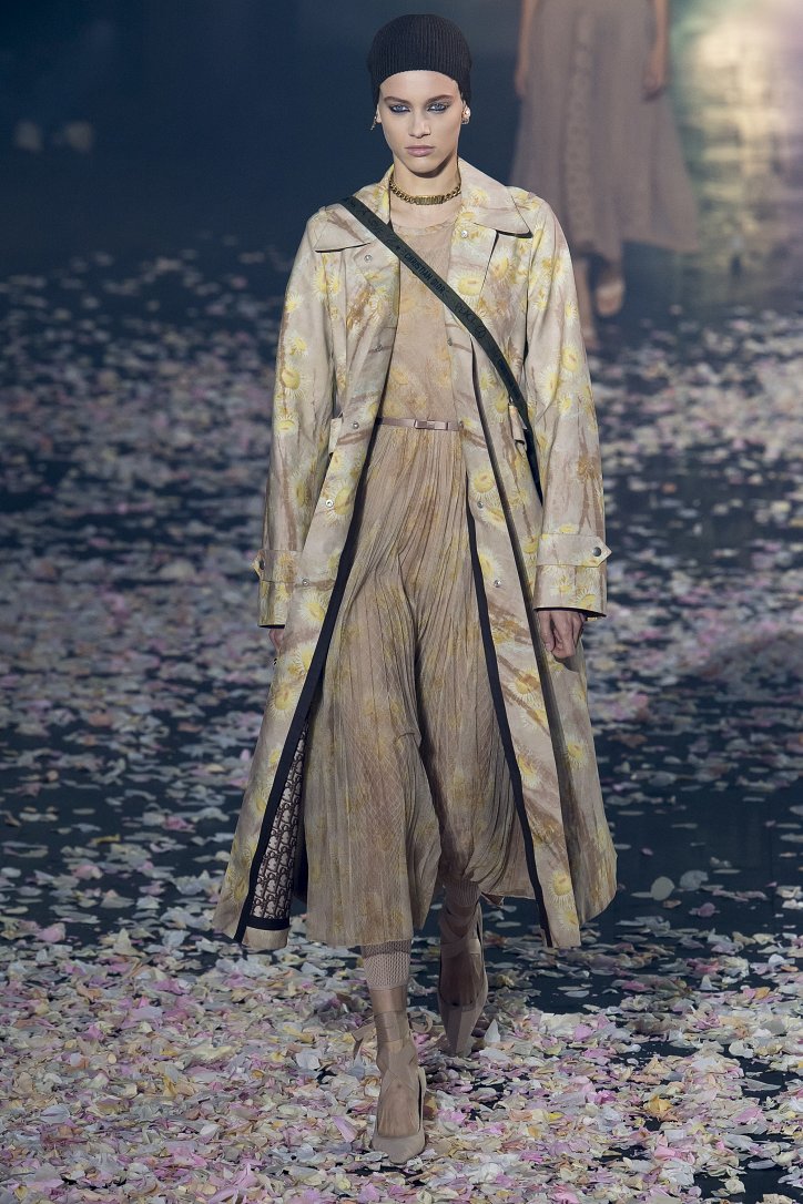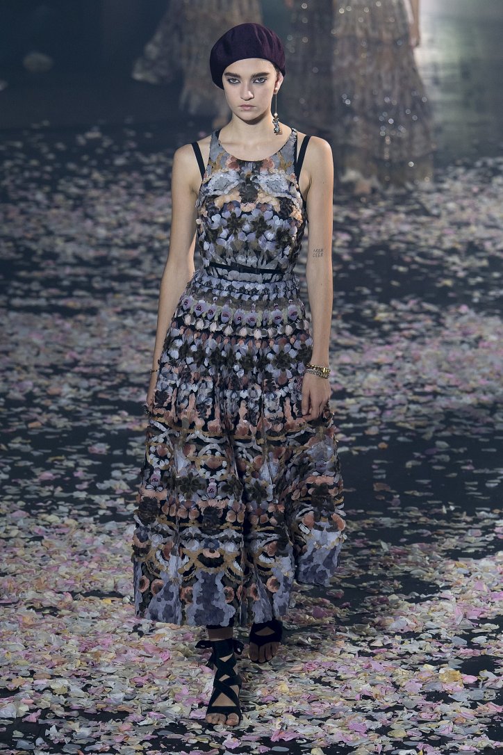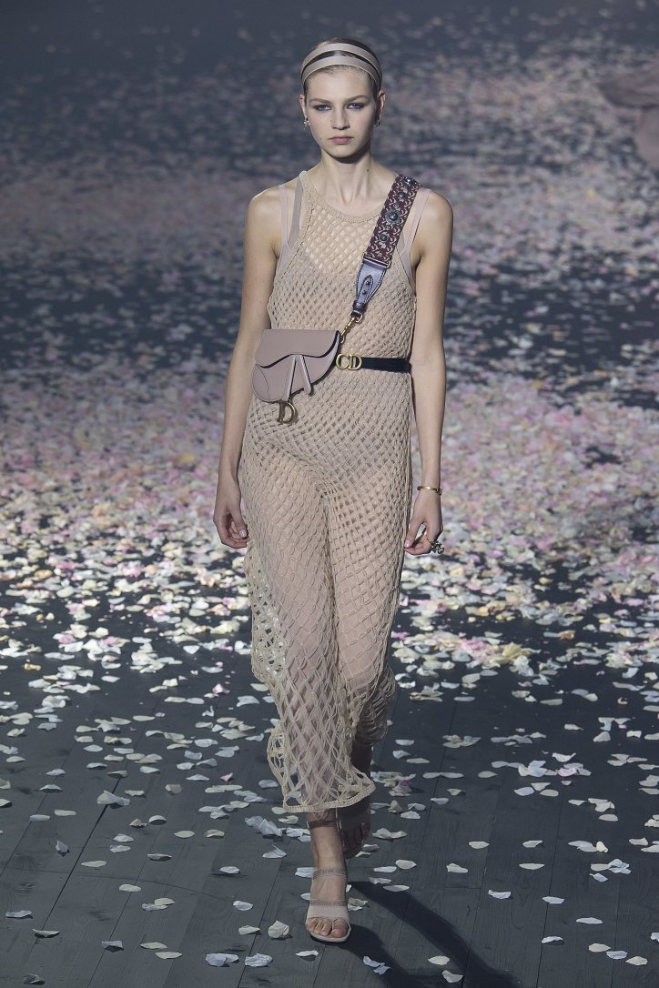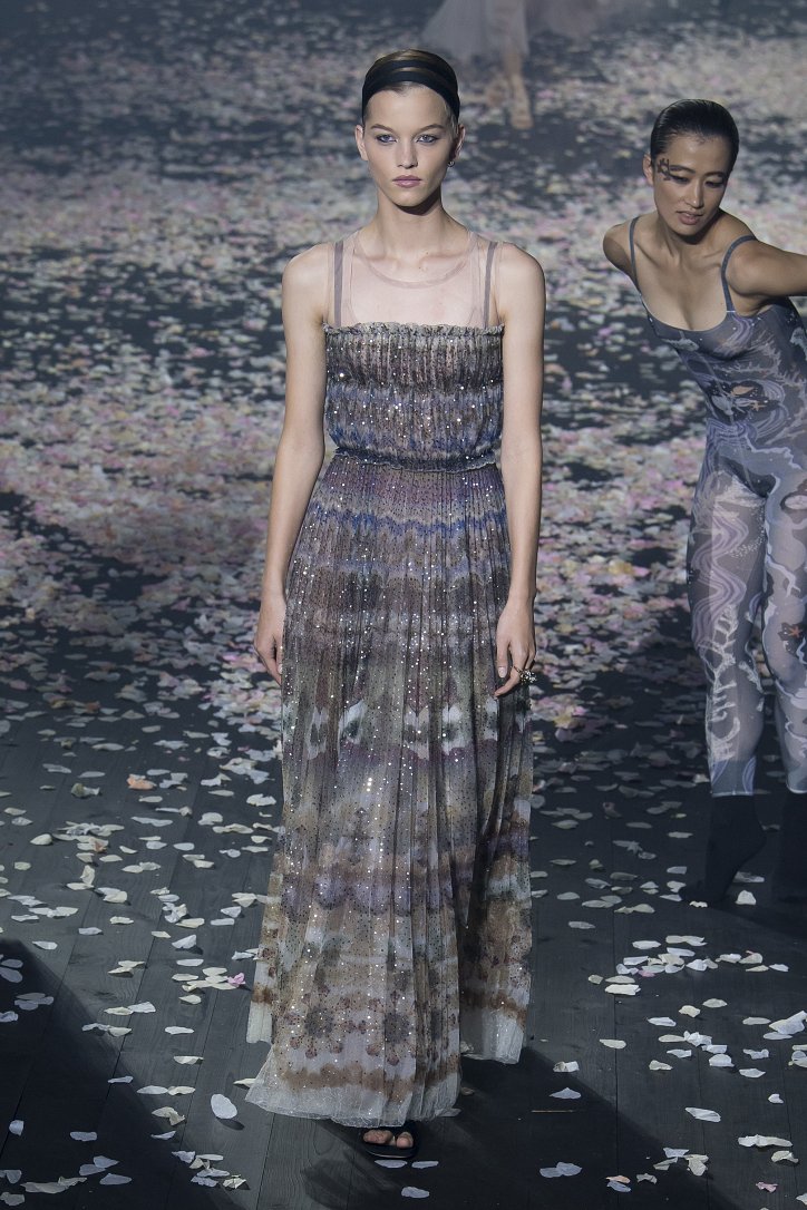 Коллекция Christian Dior – это новый взгляд на диоровские силуэты. Свобода для Кьюри – это отказ от корсетов и жестких тканей. На их место пришли тюль и макраме, джерси и шелк. Привычный New Look стал мягче и нежнее, а влияние балета было заметно в летящих юбках, туфельках-пуантах и сдержанной цветовой гамме: беж, кофе с молоком, экрю, черный, темно-синий, хаки и серый. И ни одной яркой вспышки – даже цветы были выполнены в технике tie-dye!
