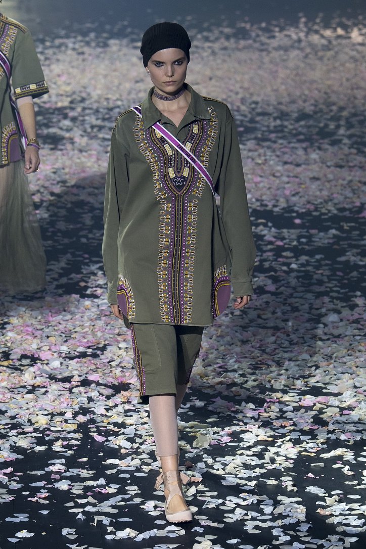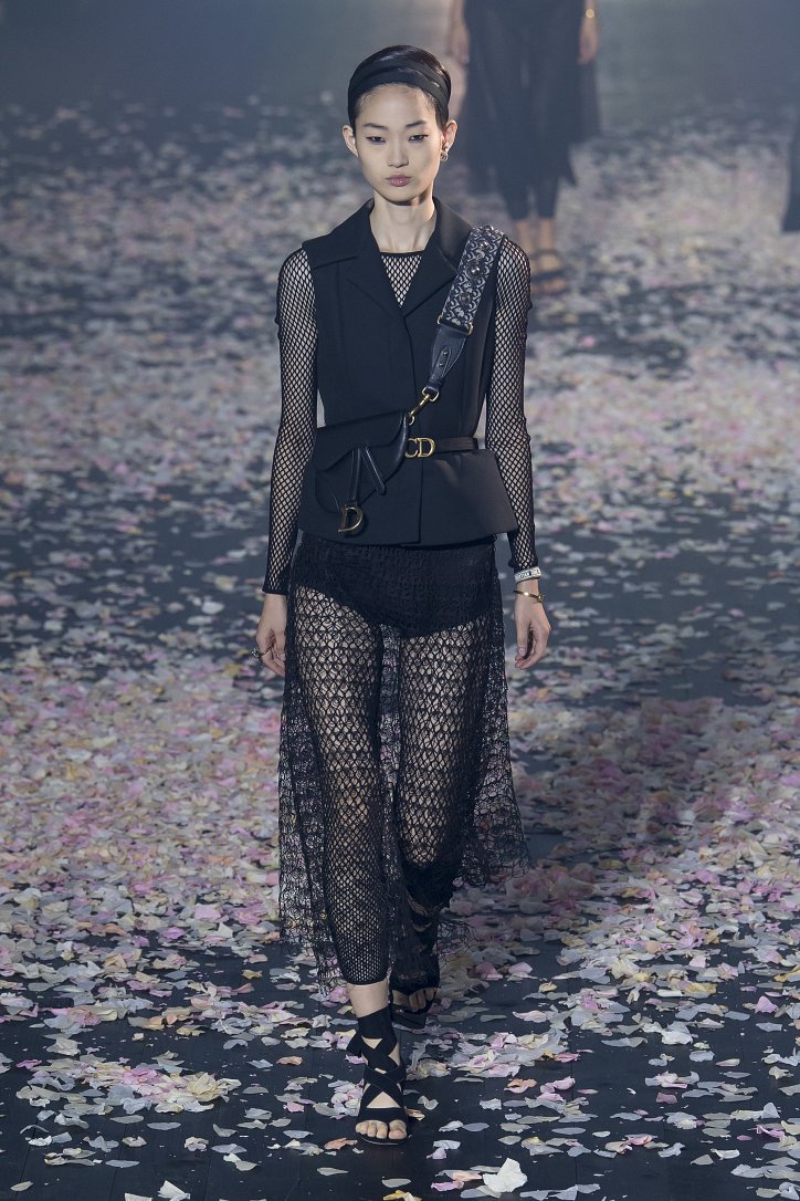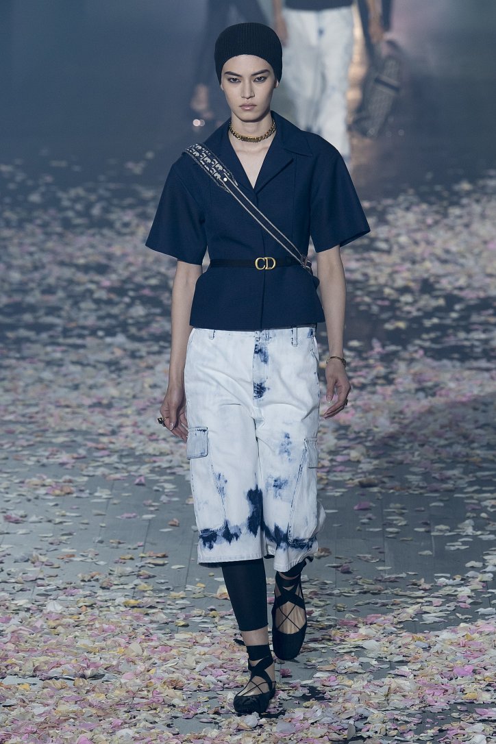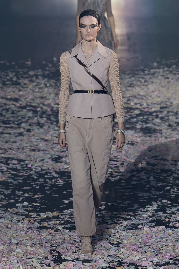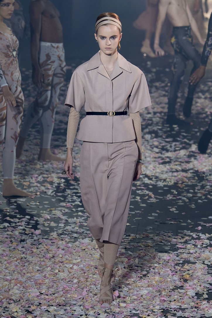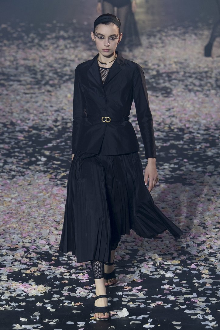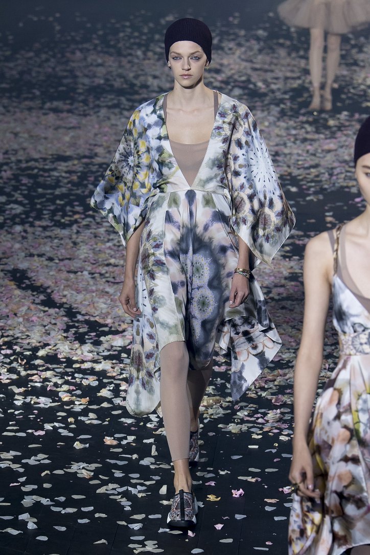 Коллекция Christian Dior – это новый взгляд на диоровские силуэты. Свобода для Кьюри – это отказ от корсетов и жестких тканей. На их место пришли тюль и макраме, джерси и шелк. Привычный New Look стал мягче и нежнее, а влияние балета было заметно в летящих юбках, туфельках-пуантах и сдержанной цветовой гамме: беж, кофе с молоком, экрю, черный, темно-синий, хаки и серый. И ни одной яркой вспышки – даже цветы были выполнены в технике tie-dye!