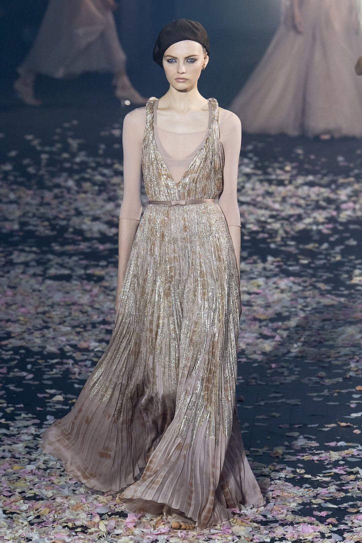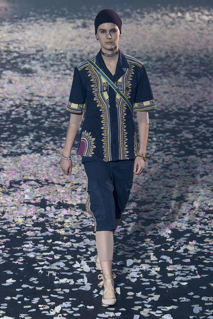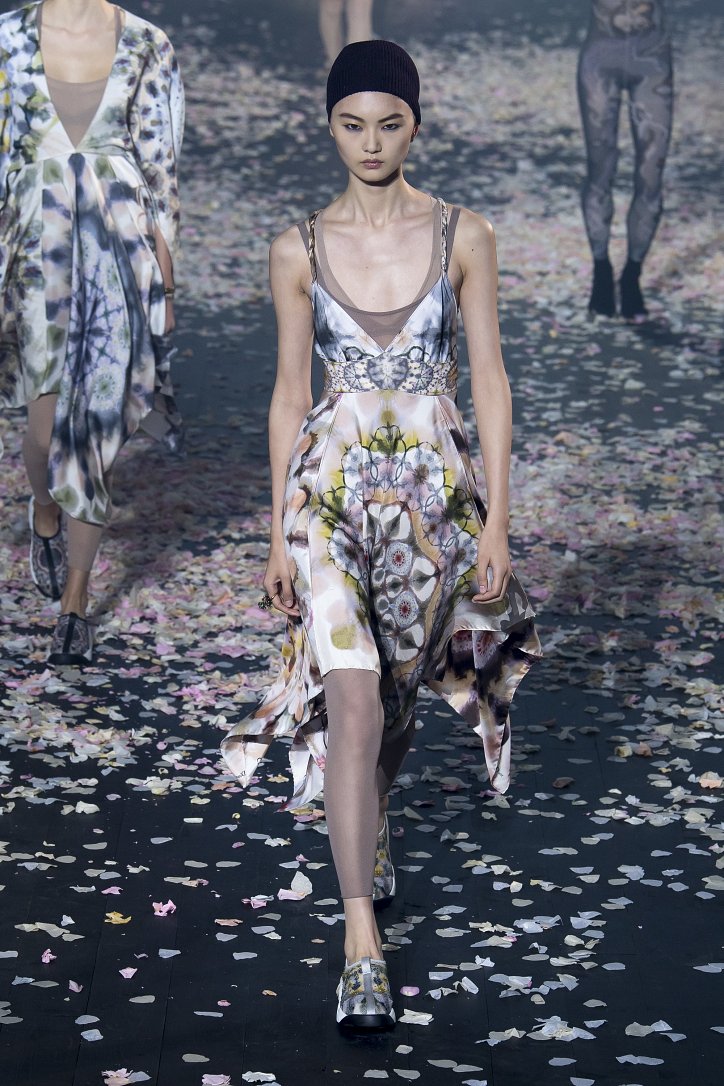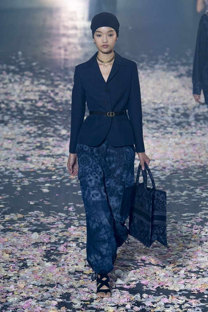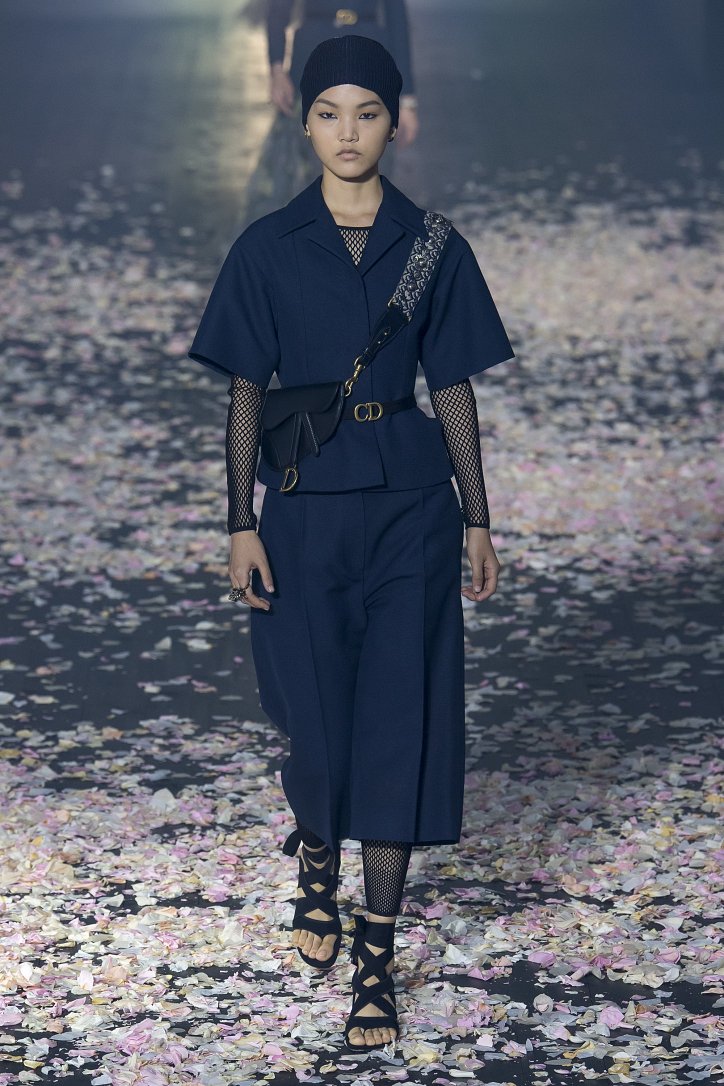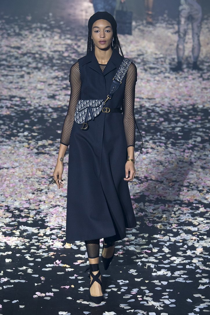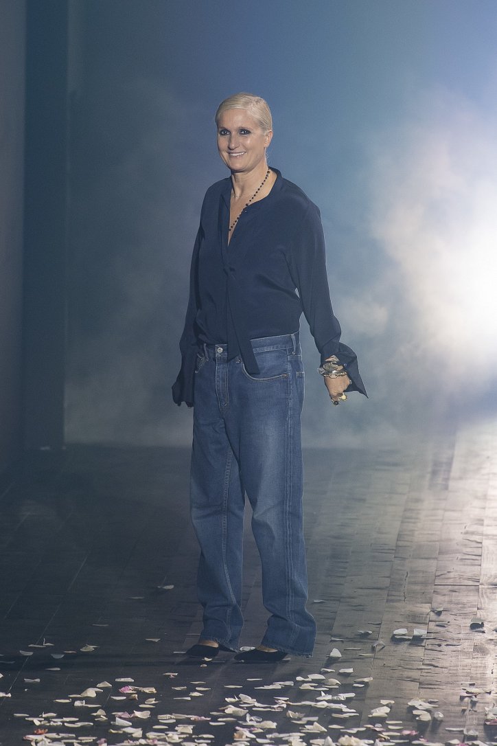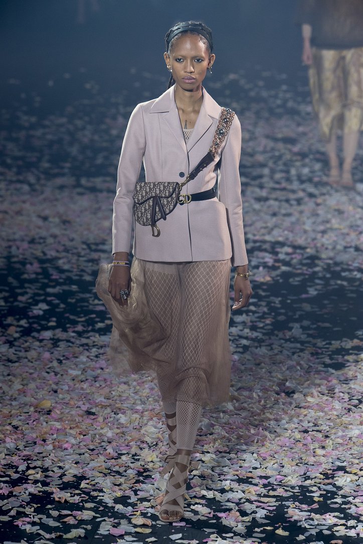 Коллекция Christian Dior – это новый взгляд на диоровские силуэты. Свобода для Кьюри – это отказ от корсетов и жестких тканей. На их место пришли тюль и макраме, джерси и шелк. Привычный New Look стал мягче и нежнее, а влияние балета было заметно в летящих юбках, туфельках-пуантах и сдержанной цветовой гамме: беж, кофе с молоком, экрю, черный, темно-синий, хаки и серый. И ни одной яркой вспышки – даже цветы были выполнены в технике tie-dye!