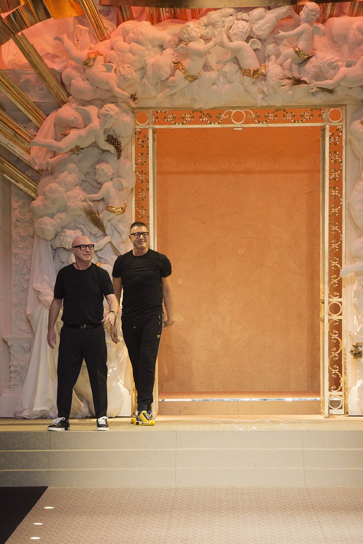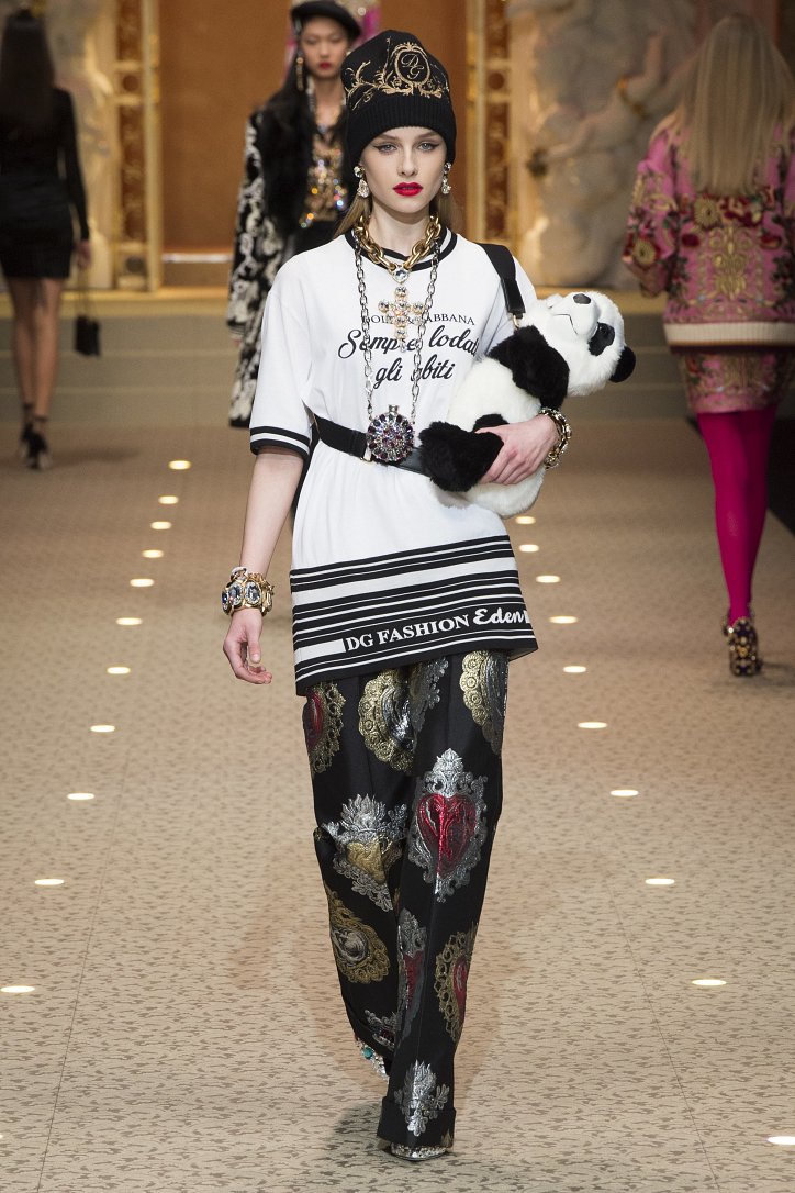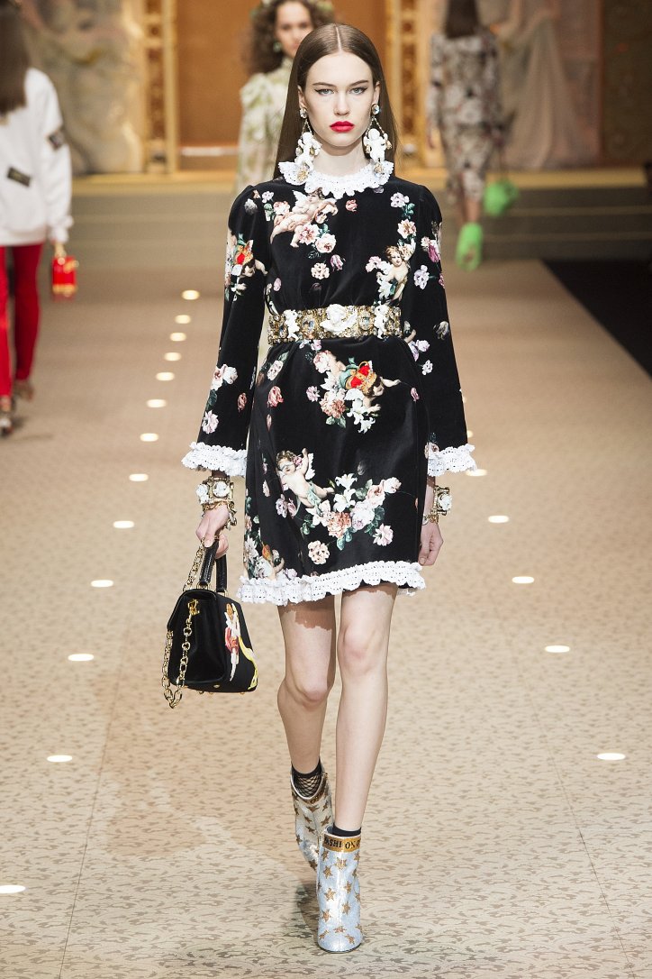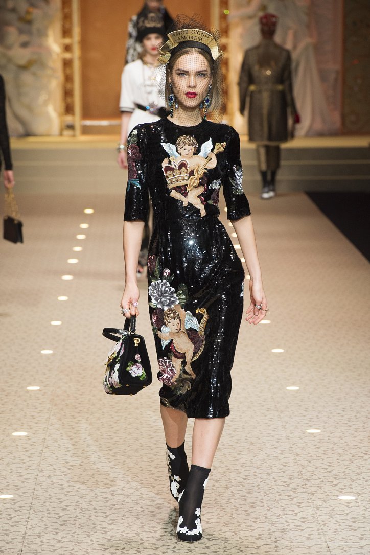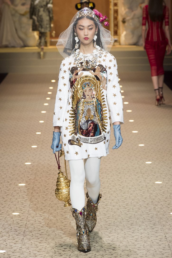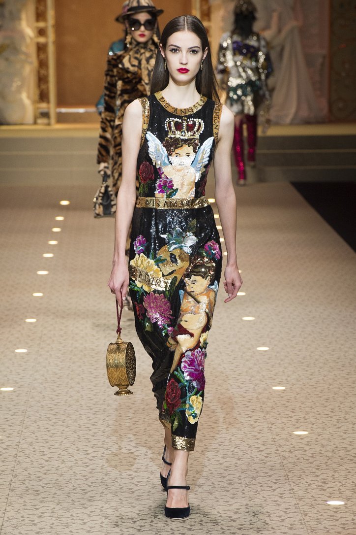 В очередной раз рискуя нарваться на неодобрение Ватикана, дизайнеры решили вновь «обожествить» моду: ангелочки, словно срисованные с полотен эпохи Возрождения, смотрели с шапок и свитшотов, бархат и парча напоминали об одеяниях духовенства, стразами на клатчах было выложено слово «Heaven» («Рай»), а рядом – «скромно» - D&G.
