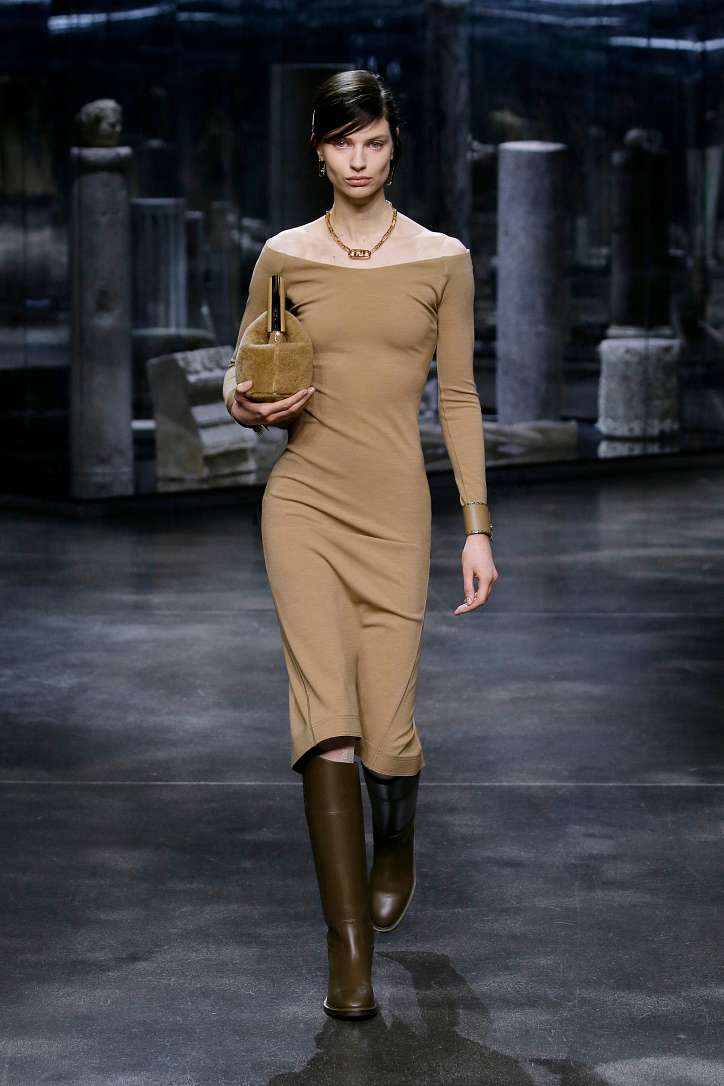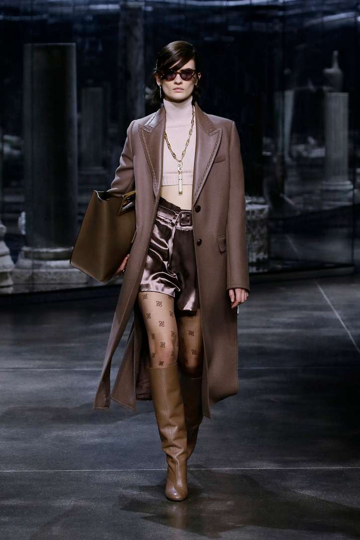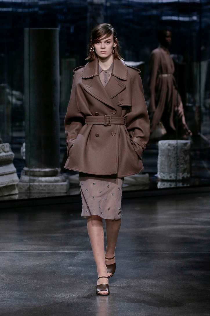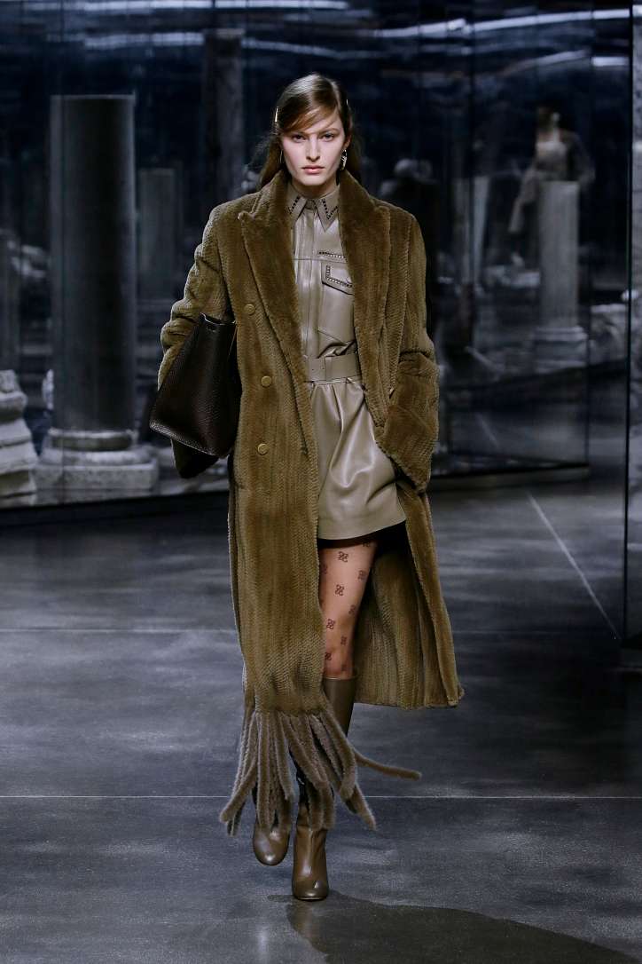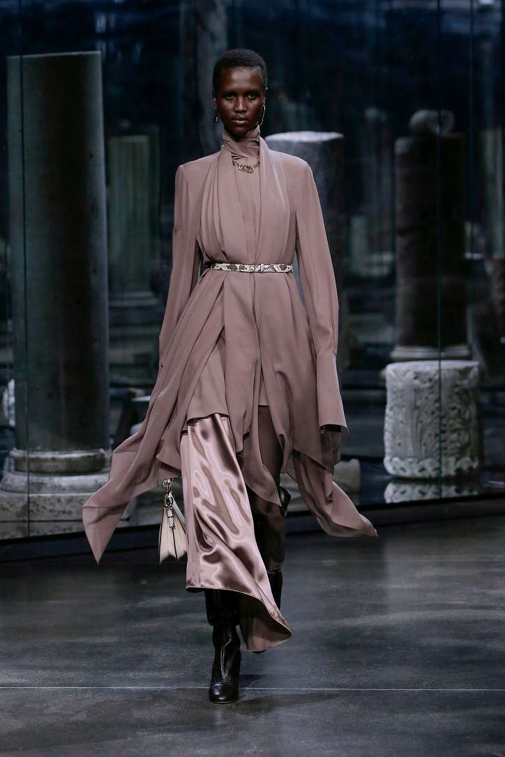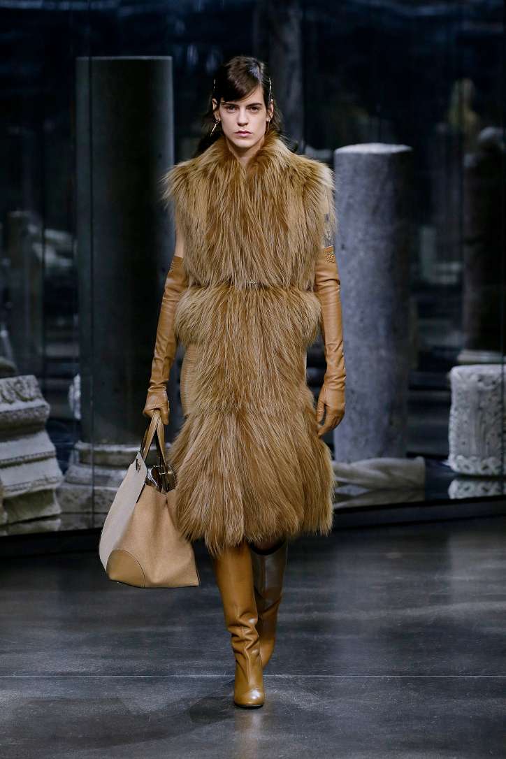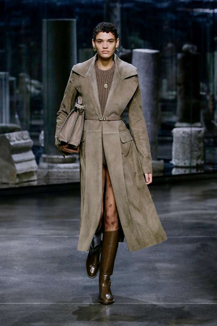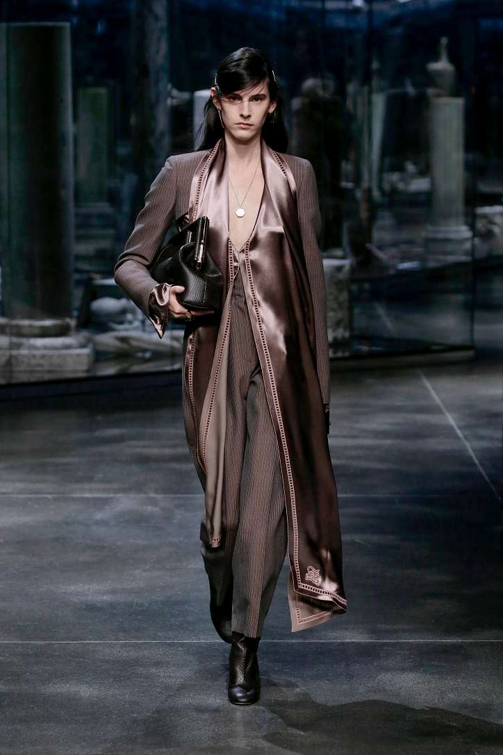 В целом же коллекция Fendi получилась очень интересной и цельной, выдержанной в нейтральных бежево-коричневых оттенках с незначительными вкраплениями черного, белого, нежно-розового и серого. Это символизировало минеральные цвета Рима и оттенки, которые преобладали в истории Fendi.