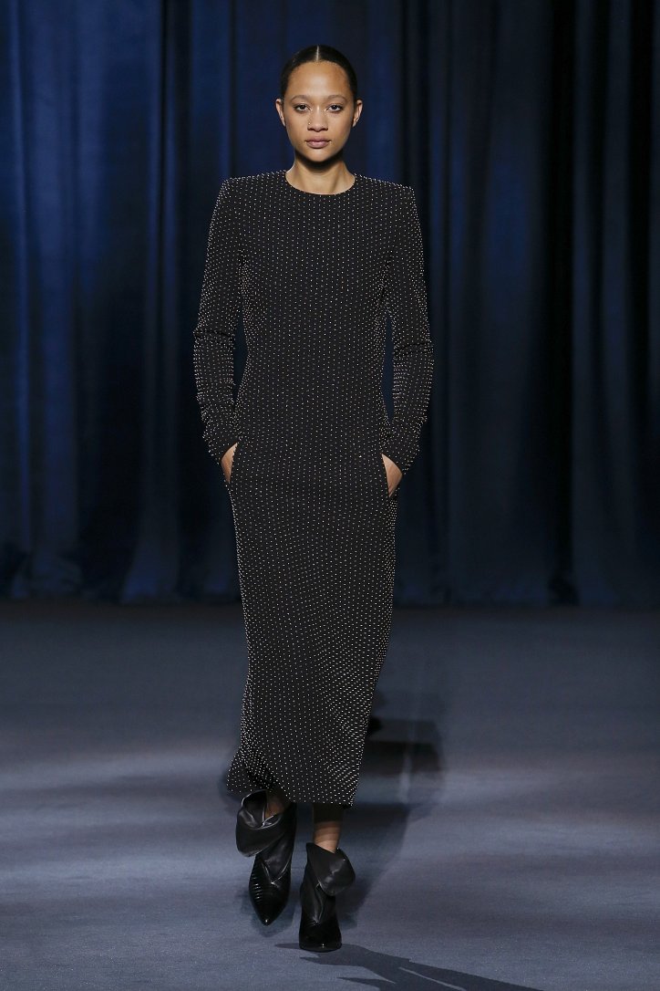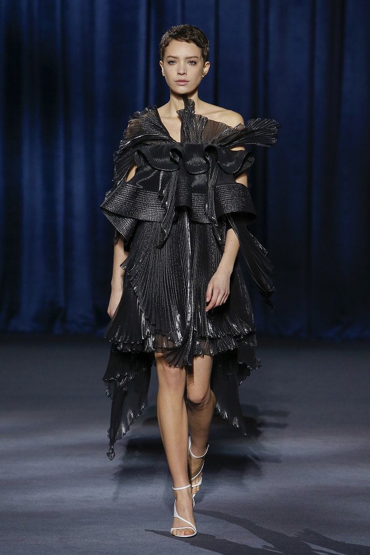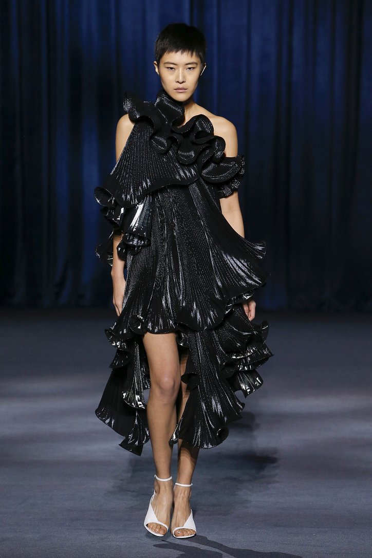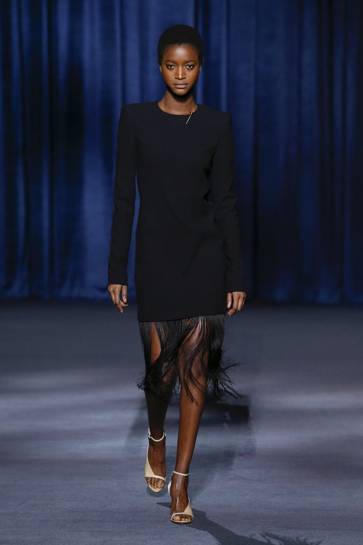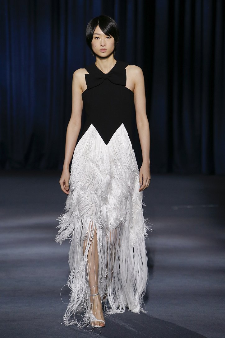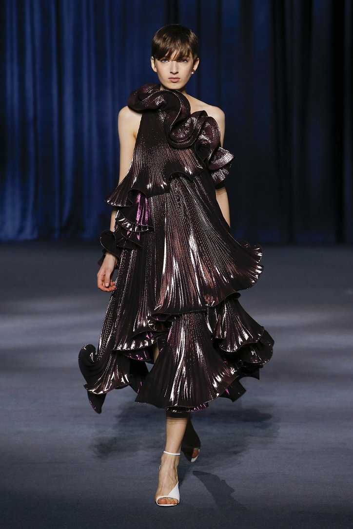Заявленный же голливудский нуар появился ближе к концу шоу – когда на подиум вышли девушки в роскошных платьях из многослойного плиссе, блестящих материалов и моделях с длинной бахромой.