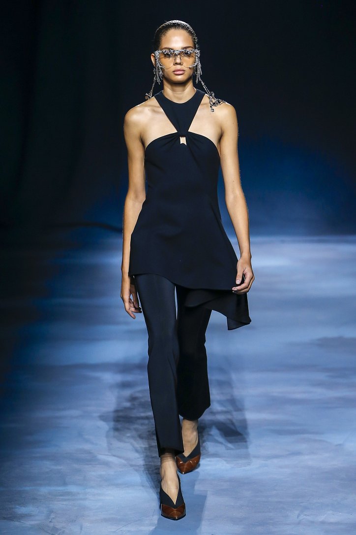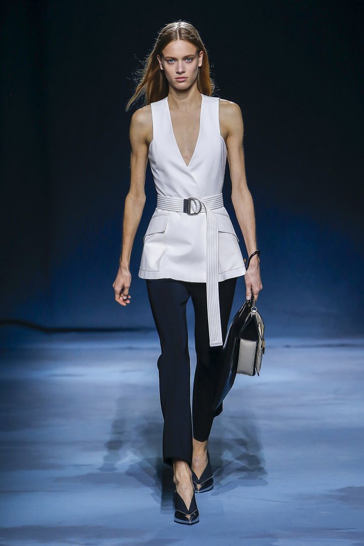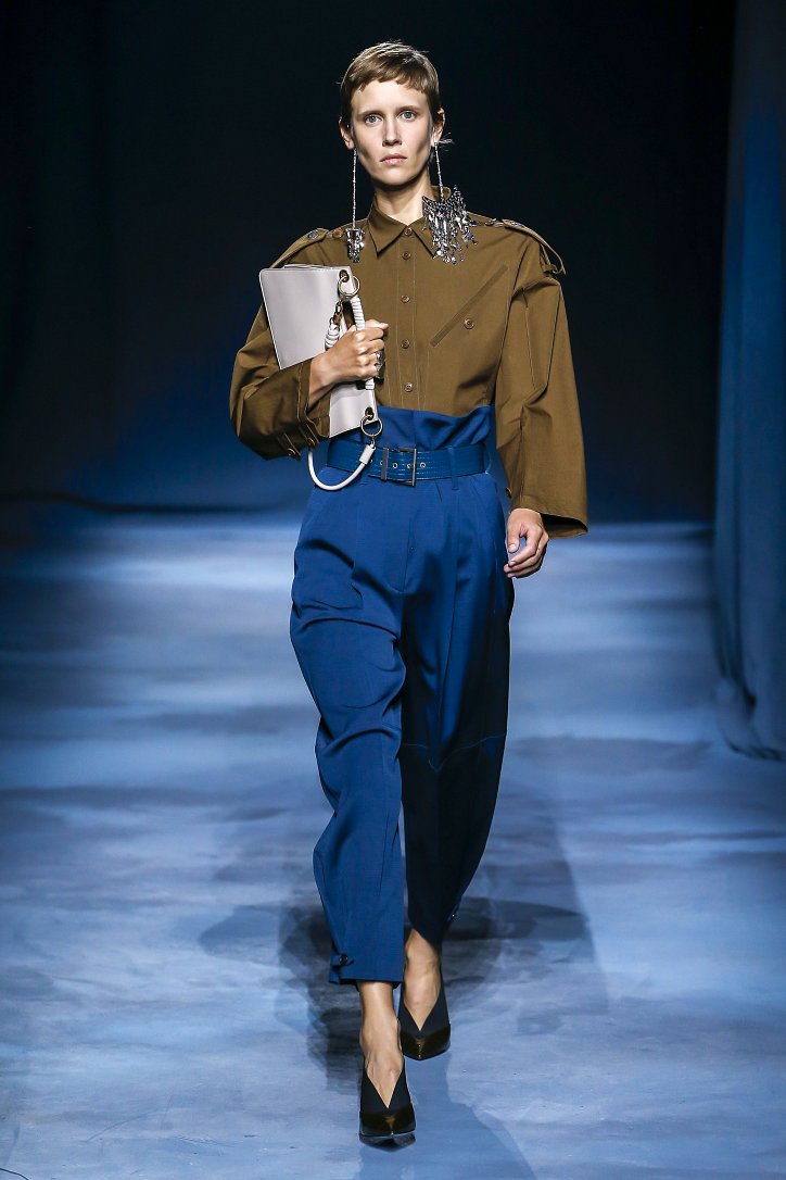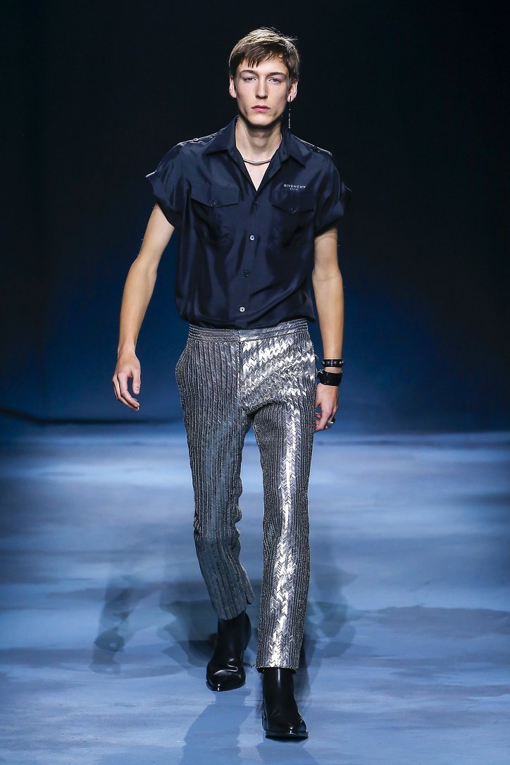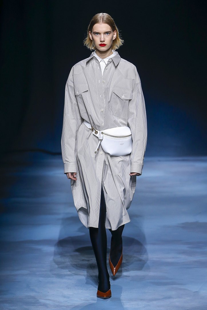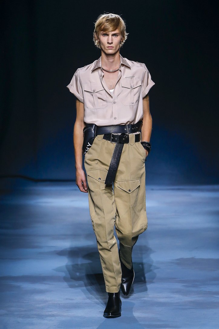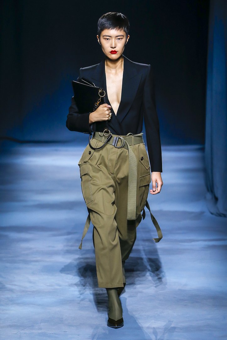 Коллекция Givenchy – это микс из одежды мужского и женского стиля. Героиня Givenchy, как и ее прообраз, носит строгие тренчи и брюки со стрелками, рубашки с остроугольными воротничками и брюки-карго с накладными карманами, но при случае свободно себя чувствует и в асимметричных платьях-плиссе, летящих палаццо и жакетах, надетых на голое тело (и, к слову, заправленных за высокий пояс брюк). При этом в одном луке вполне могут встретиться и андрогинные вещи и откровенно женственные.