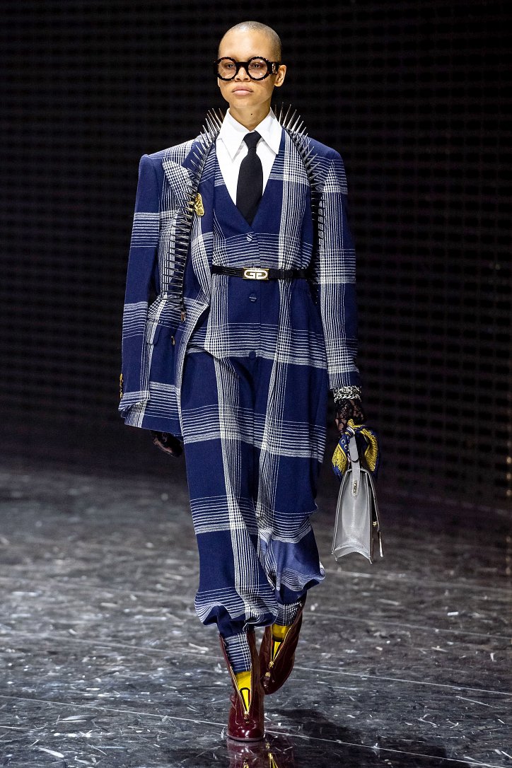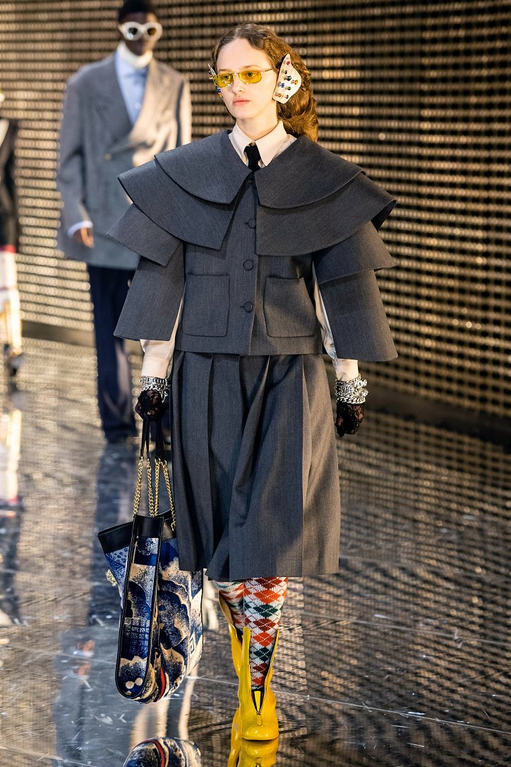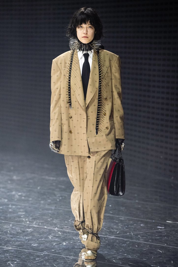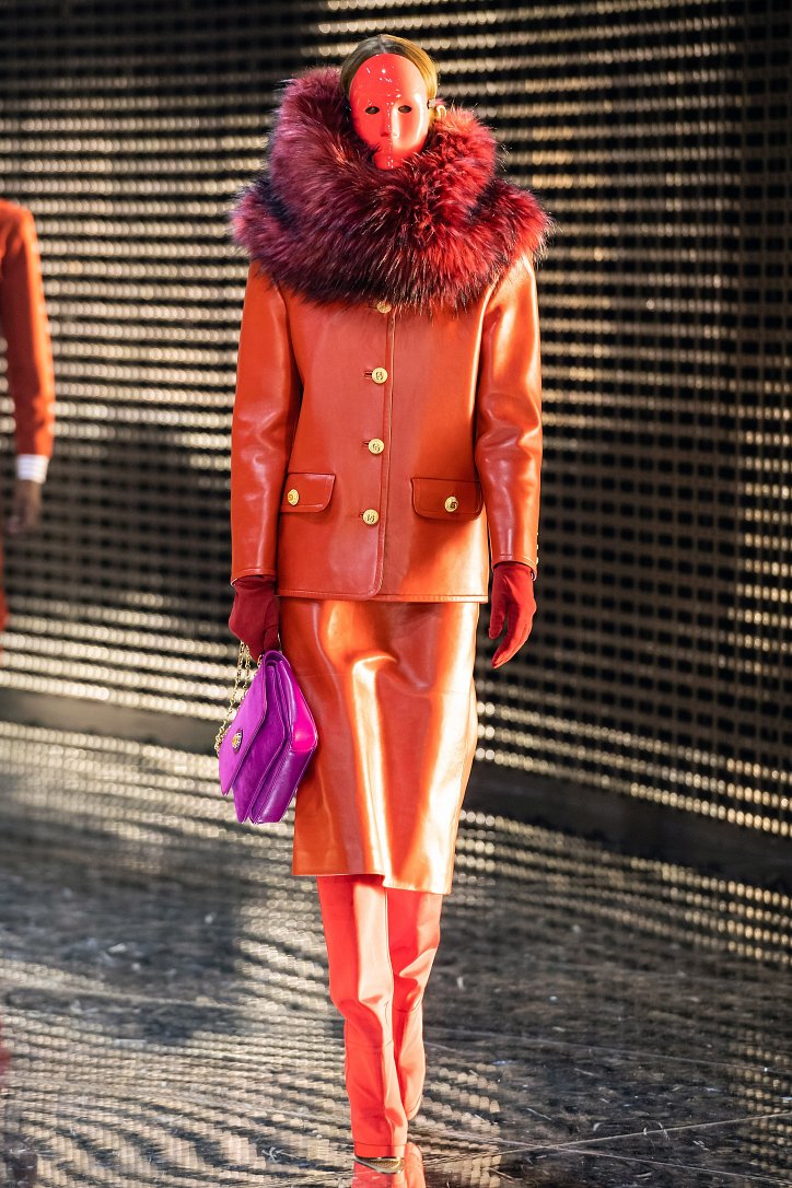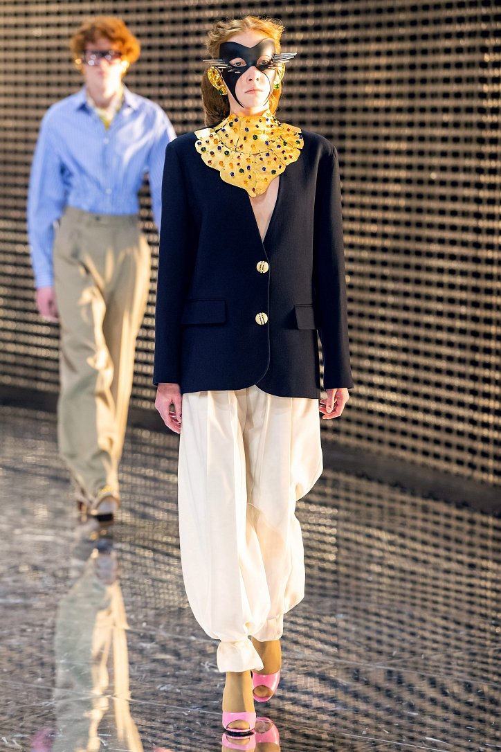 Что такое маска – попытка скрыть свое лицо или привлечь к себе внимание? Подобными рассуждениями делился за кулисами шоу Алессандро Микеле. Впечатлившись идеями философа Hannah Arendt, которая считала основополагающей характеристикой общества достижение баланса между публичностью и приватностью, дизайнер продолжает размышлять о дуальности – в том числе и гендерной. Так что, если отвлечься от масок на лицах моделей (их в продаже не будет), и посмотреть на одежду, то станет понятно, почему девушек дизайнер обрядил в мешковатые мужские костюмы, а мужские образы дополнил боа из цветного меха.