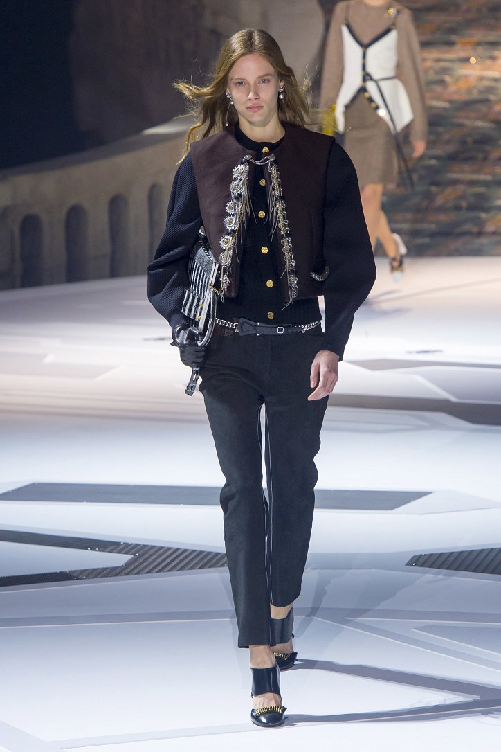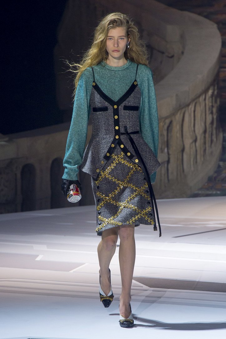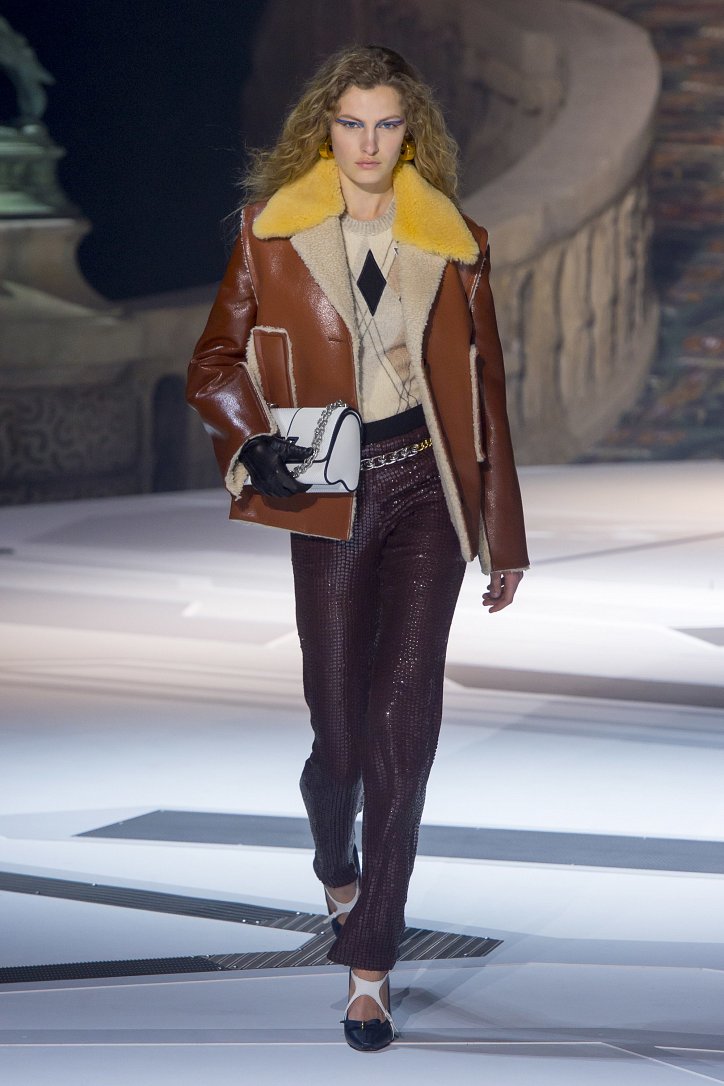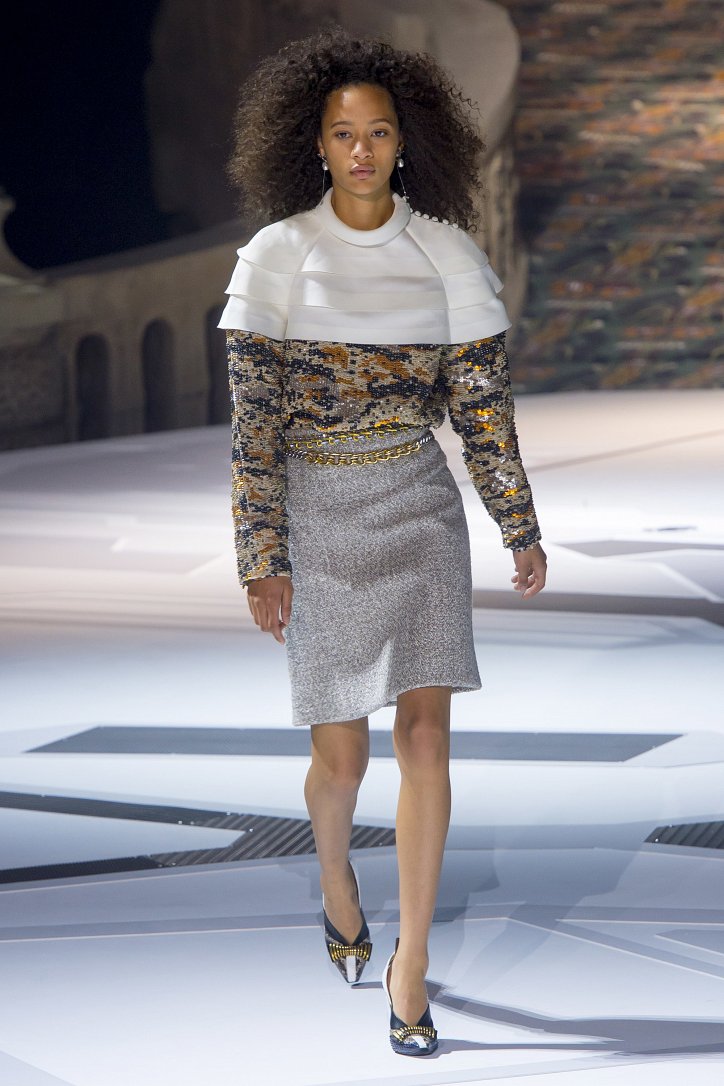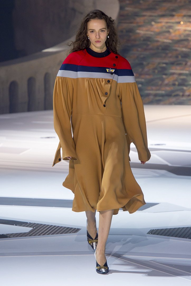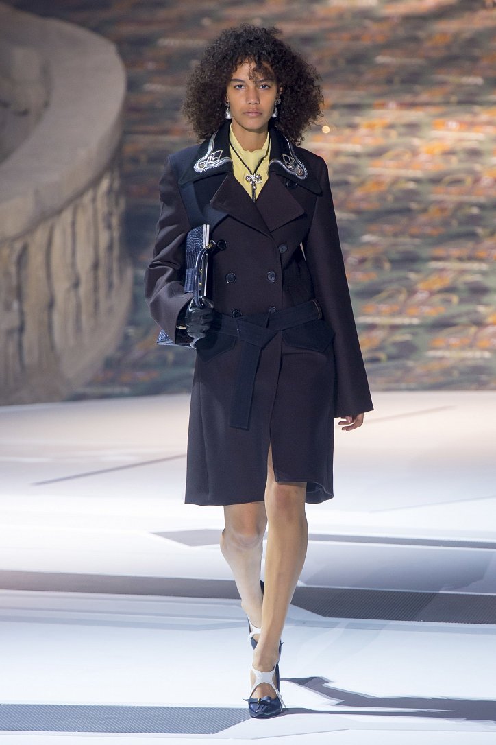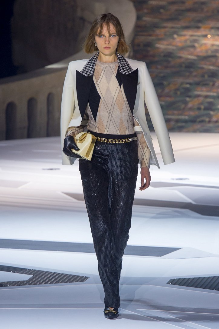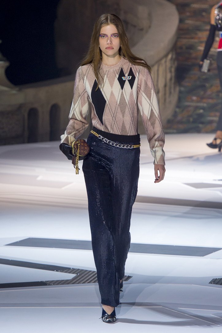 Николя Жескьер всегда питал слабость к футуризму, поэтому особого удивления столь неординарное решение у гостей показа коллекции Louis Vuitton осень-зима 2018-2019 не вызвало. Впрочем, летающая тарелка – это единственный футуристический элемент шоу. Сама же коллекция представляла, скорее, некий микс из исторических костюмов и актуальных трендов. При этом все, что представил дизайнер, выглядело очень реалистично и современно. Юбки длиной по колено – прямые, плиссе и трапеции, свободные платья – чуть ниже колена, слегка зауженные книзу брюки, немного дискотечного блеска на брюках и топах, пуловеры с ромбами, жакеты с острыми контрастными лацканами, косухи, дубленки и пальто – абсолютно все «пригодно к жизни»!