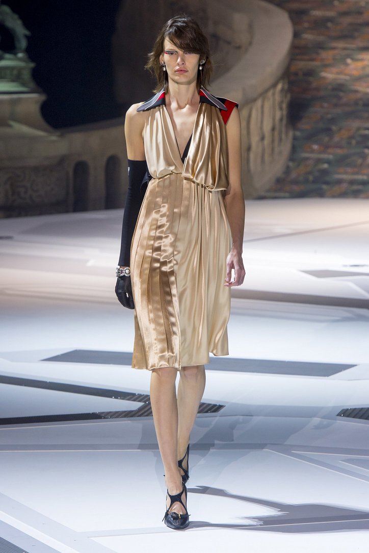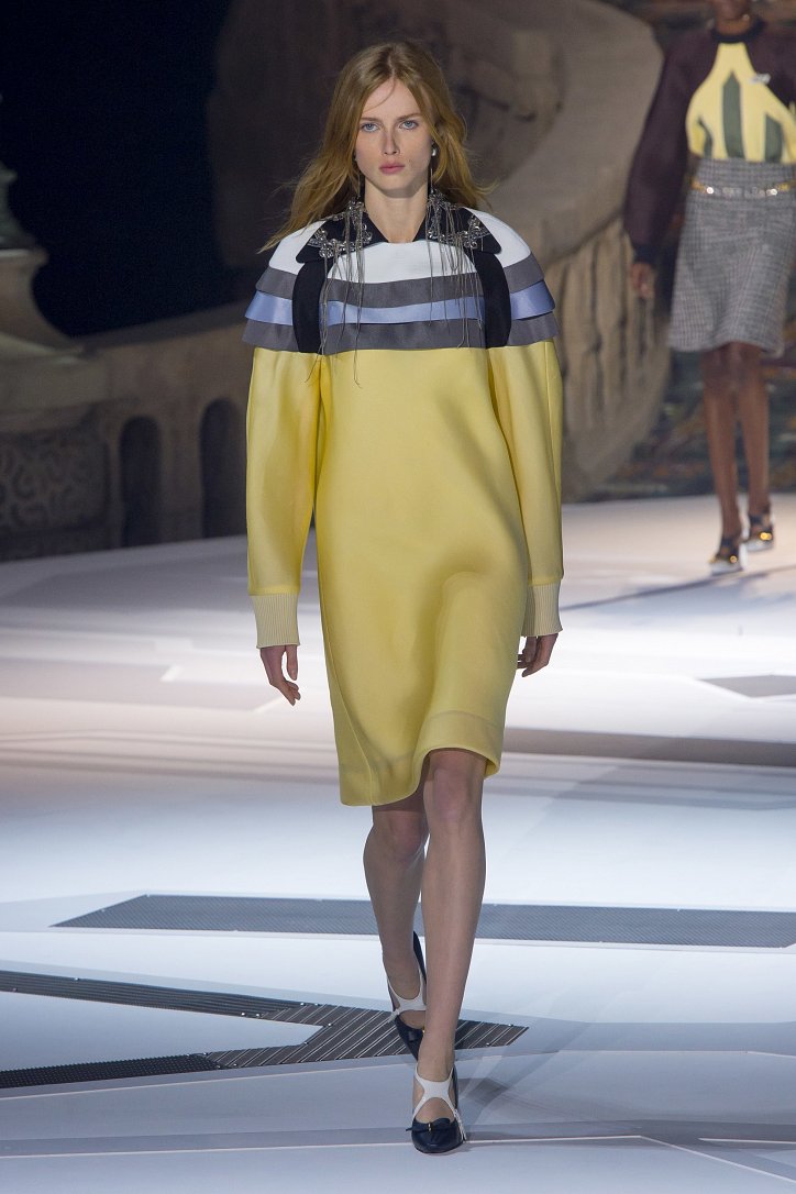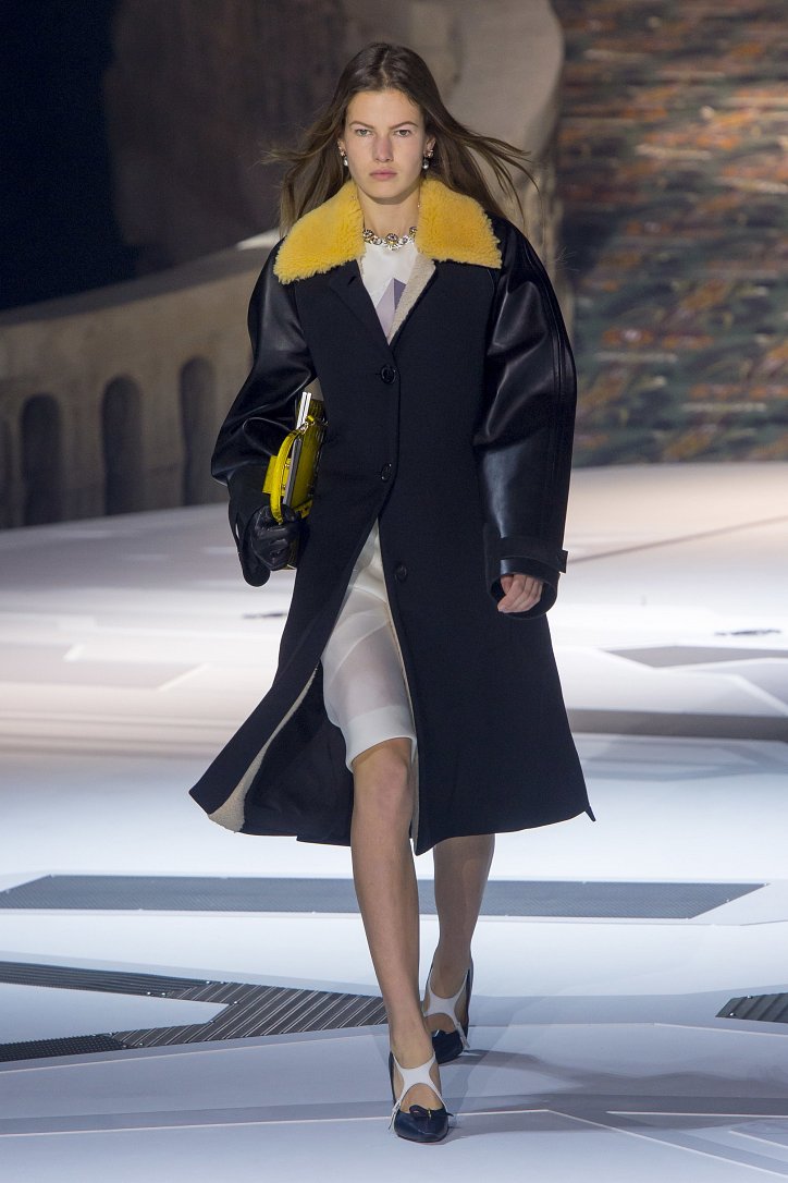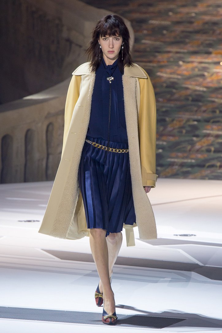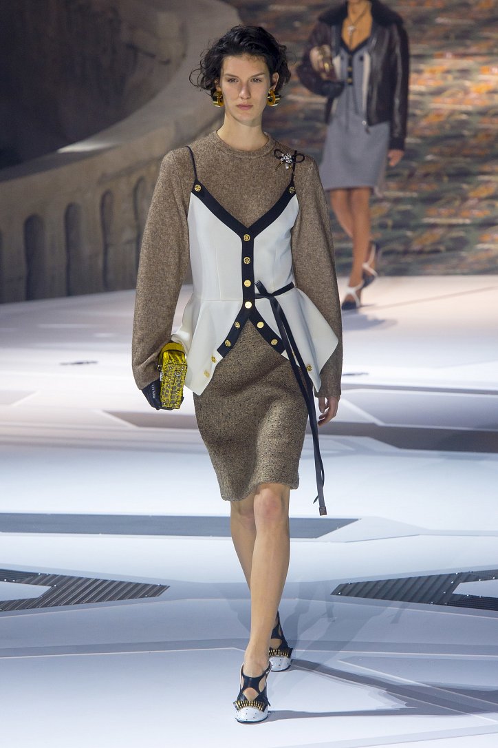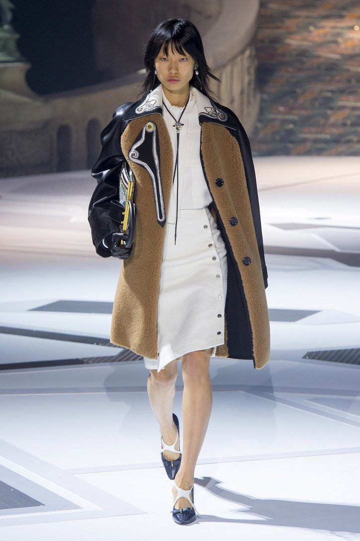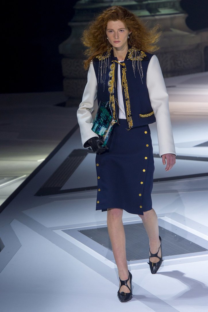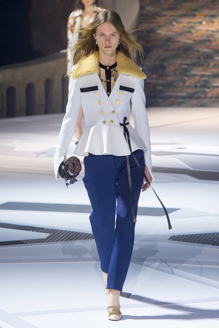 Николя Жескьер всегда питал слабость к футуризму, поэтому особого удивления столь неординарное решение у гостей показа коллекции Louis Vuitton осень-зима 2018-2019 не вызвало. Впрочем, летающая тарелка – это единственный футуристический элемент шоу. Сама же коллекция представляла, скорее, некий микс из исторических костюмов и актуальных трендов. При этом все, что представил дизайнер, выглядело очень реалистично и современно. Юбки длиной по колено – прямые, плиссе и трапеции, свободные платья – чуть ниже колена, слегка зауженные книзу брюки, немного дискотечного блеска на брюках и топах, пуловеры с ромбами, жакеты с острыми контрастными лацканами, косухи, дубленки и пальто – абсолютно все «пригодно к жизни»!