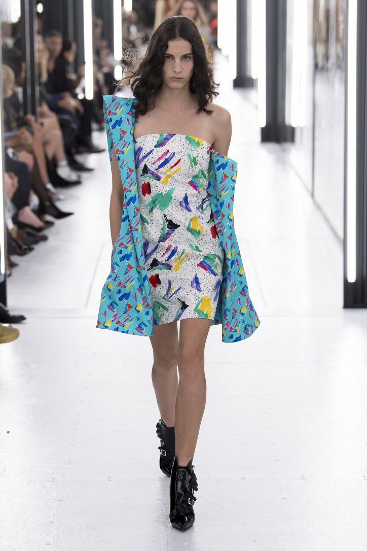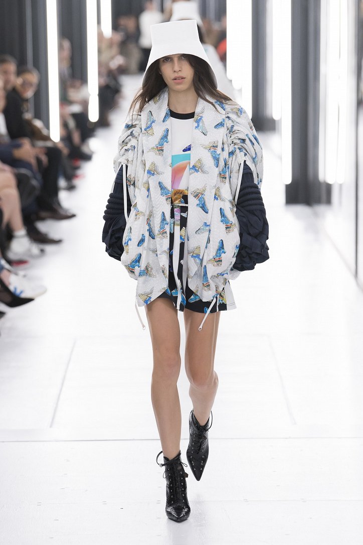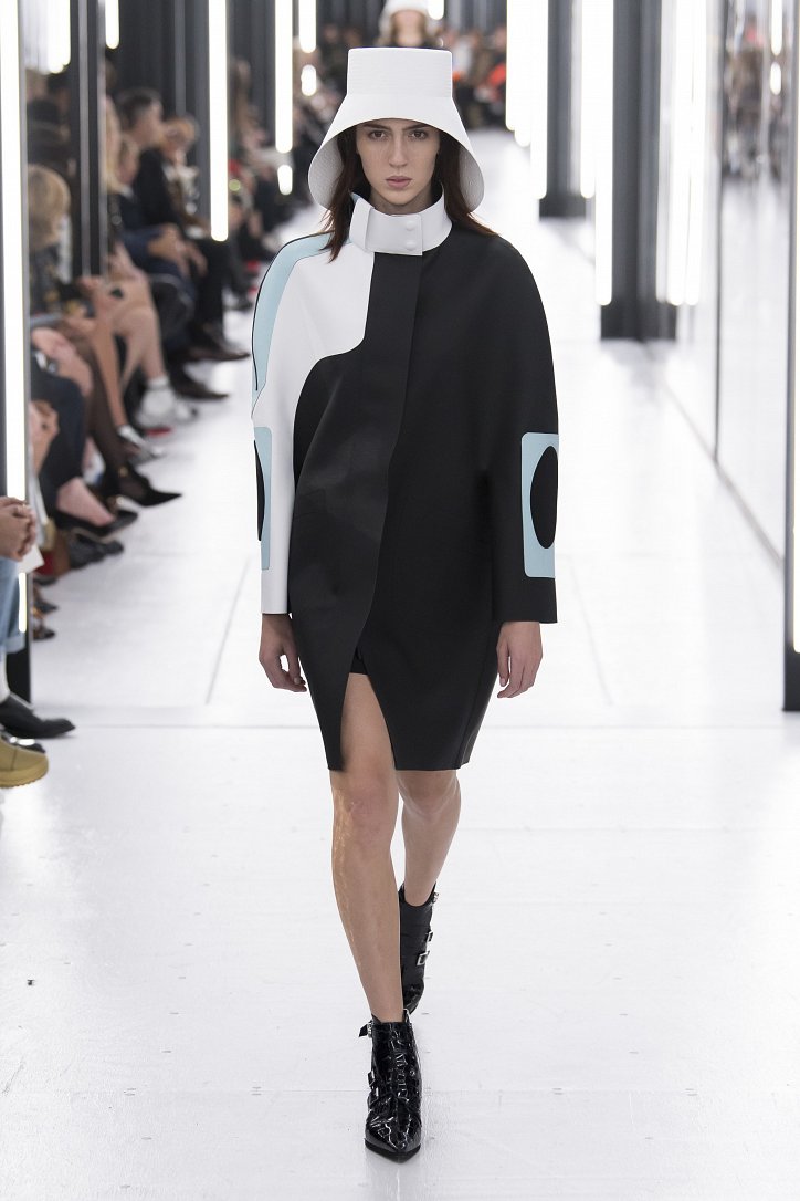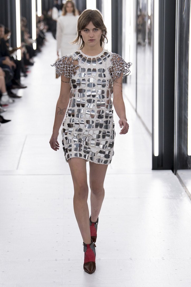 В выстроенных в Лувре «световых тоннелях» дизайнер продемонстрировал «новую реальность»: объемные пальто и жакеты, блузы с гиперболизированными рукавами и платья-кольчуги, фотопринты с изображениями ракет, астероидов, роботов, инопланетных пейзажей и внеземных цивилизаций. Под стать одежде были и аксессуары: дизайнер представил сумки в виде НЛО и яиц (по всей видимости, тоже космических).