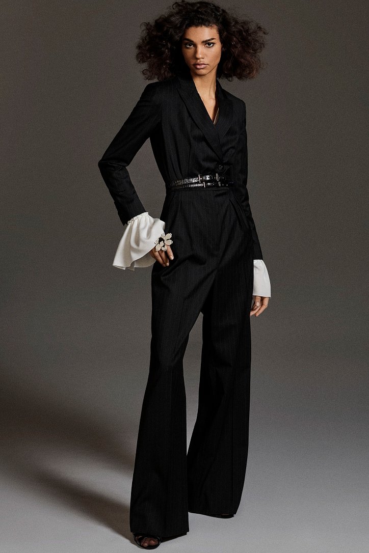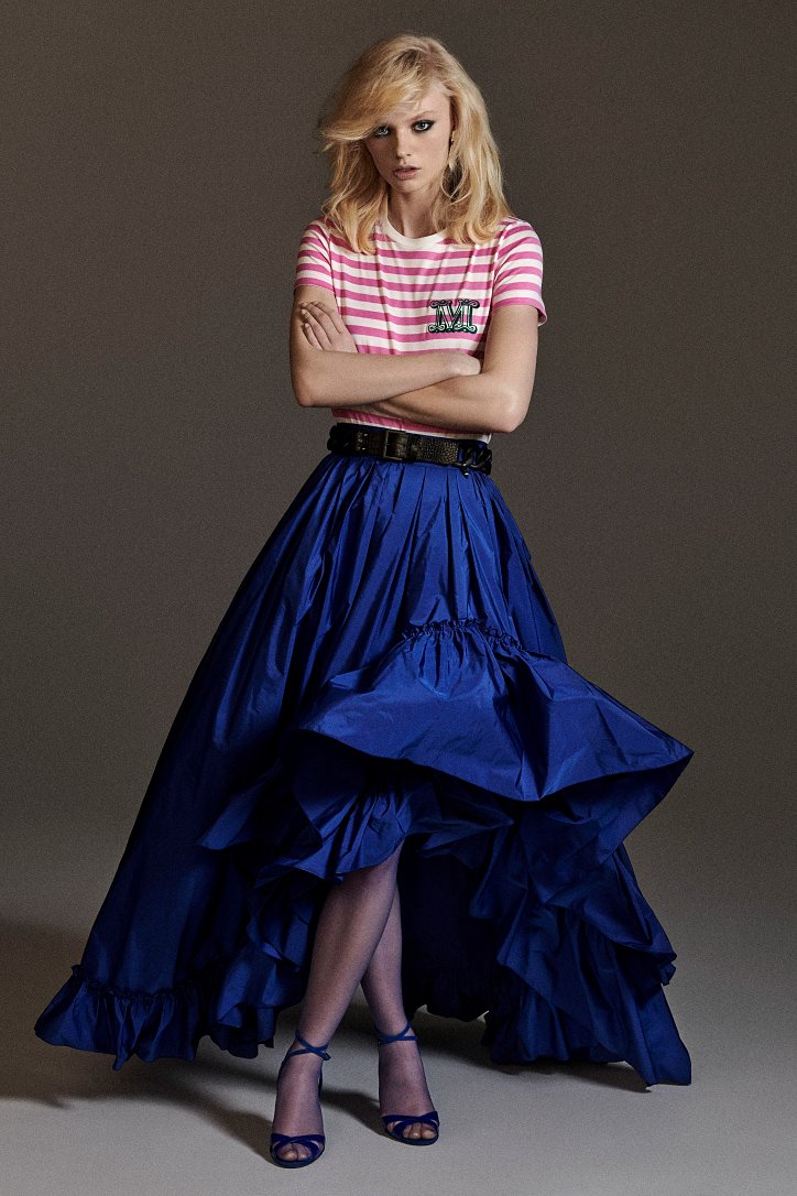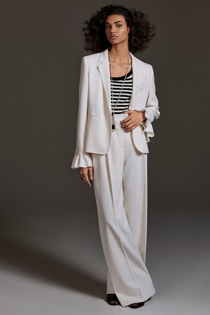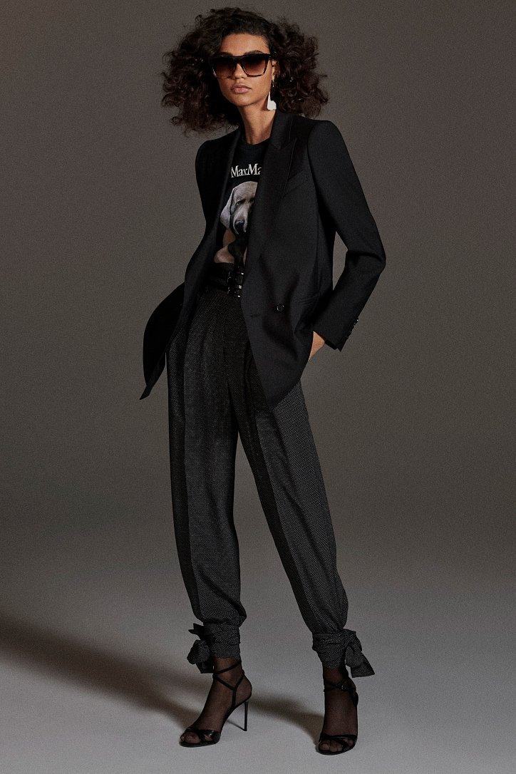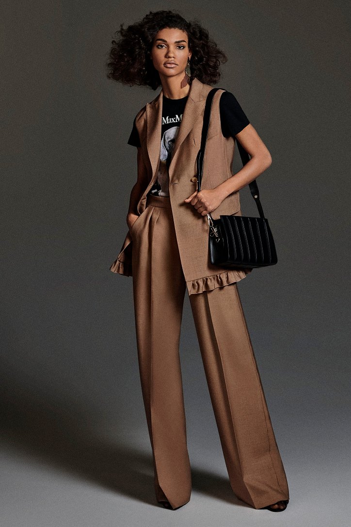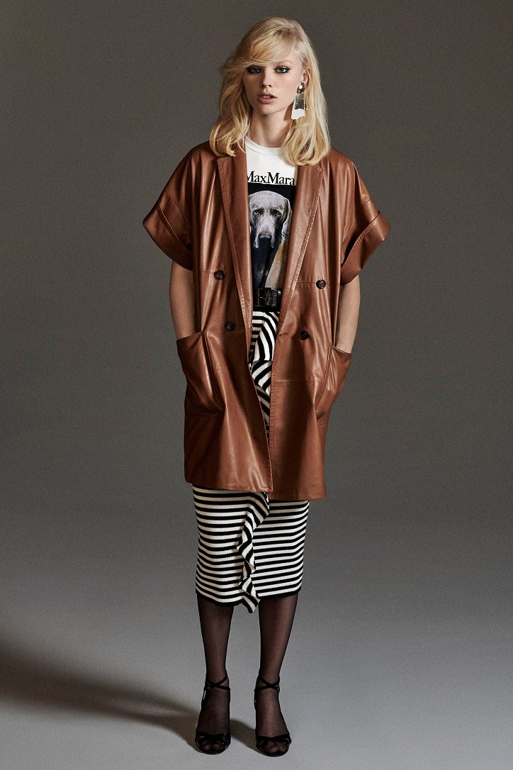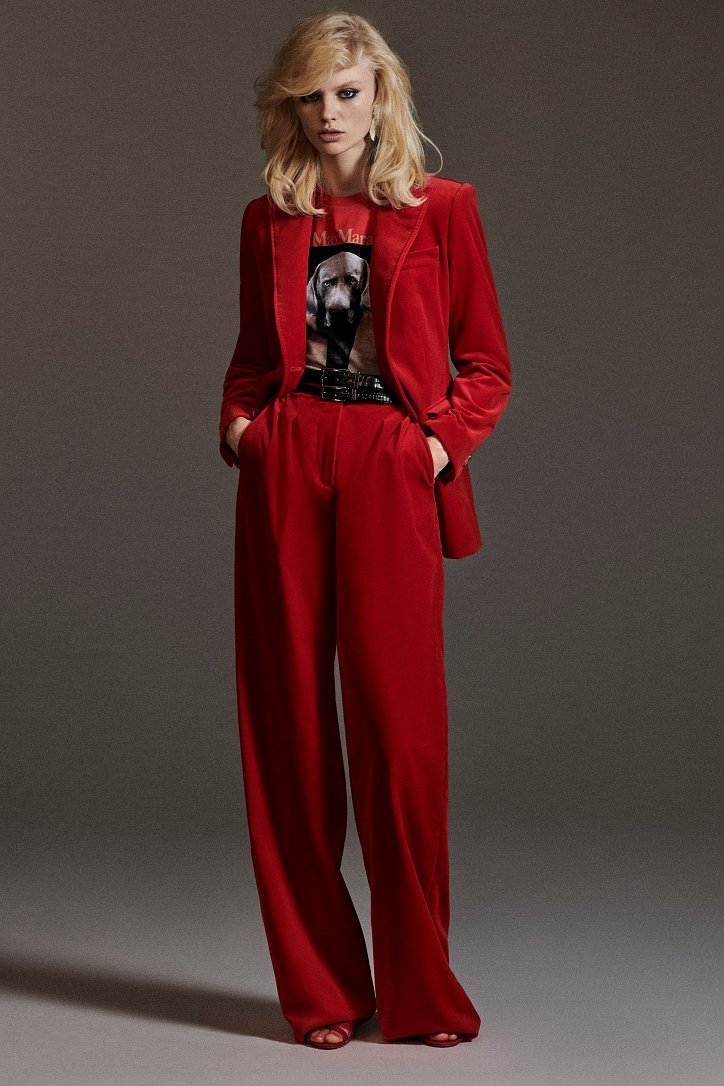 Размышляя о роли женщин в искусстве, рок-музыке и клубной жизни конца 70-ых и 80-ых годов прошлого века, Ян Гриффитс делает ставку на женственность, но не в традиционном ее проявлении, а с оглядкой на реалии той эпохи и ситуации. Именно поэтому оборки (появление которых в коллекции Max Mara само по себе необычно) являются символом чего-то, что может быть нахальным, а не романтическим. Наглядный пример тому – черная юбка-карандаш с асимметричными оборками спереди, которую дизайнер предлагает носить с фирменным бежевым пальто и белой хлопковой футболкой с принтом собаки Уильяма Вегмана, и оборки на жакетах брючных костюмов.