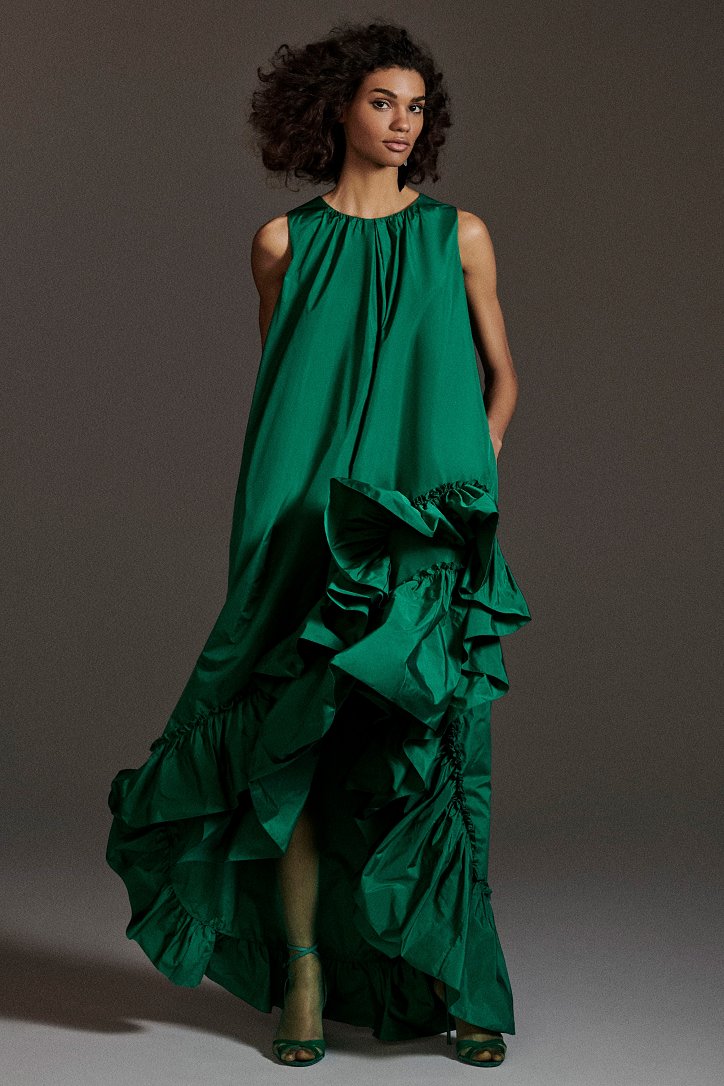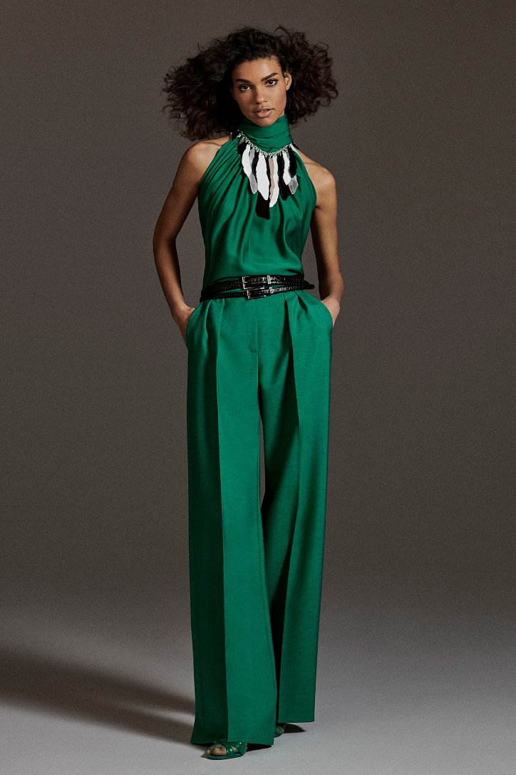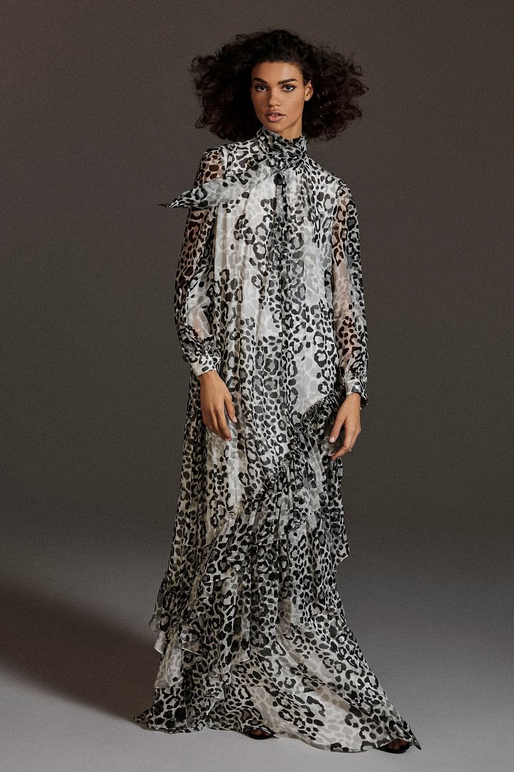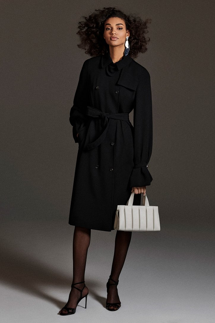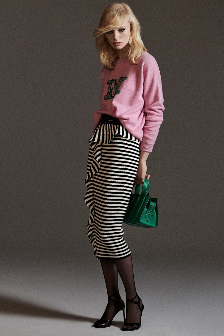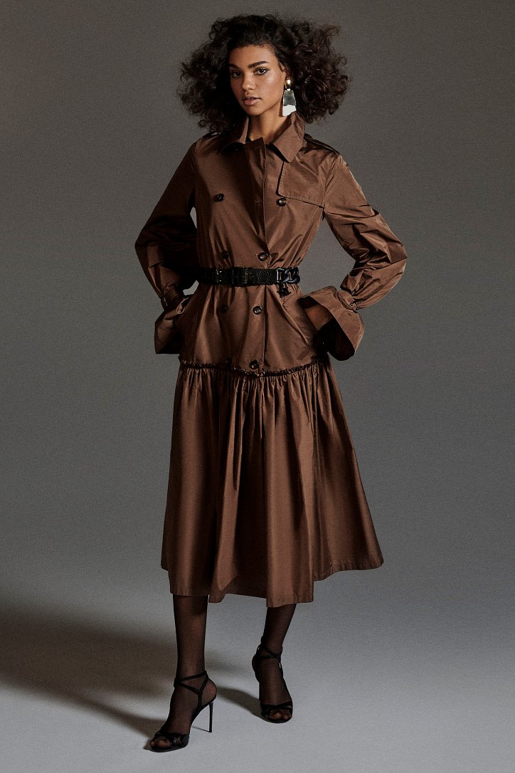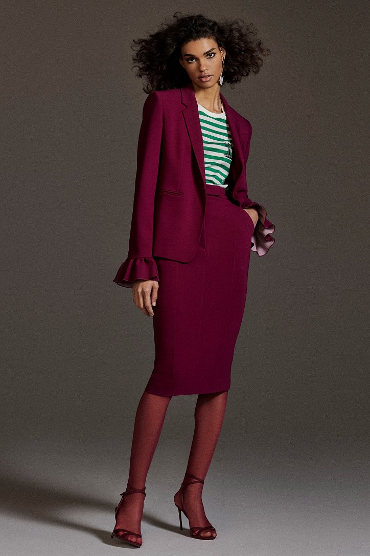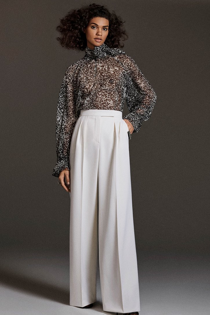 Размышляя о роли женщин в искусстве, рок-музыке и клубной жизни конца 70-ых и 80-ых годов прошлого века, Ян Гриффитс делает ставку на женственность, но не в традиционном ее проявлении, а с оглядкой на реалии той эпохи и ситуации. Именно поэтому оборки (появление которых в коллекции Max Mara само по себе необычно) являются символом чего-то, что может быть нахальным, а не романтическим. Наглядный пример тому – черная юбка-карандаш с асимметричными оборками спереди, которую дизайнер предлагает носить с фирменным бежевым пальто и белой хлопковой футболкой с принтом собаки Уильяма Вегмана, и оборки на жакетах брючных костюмов.