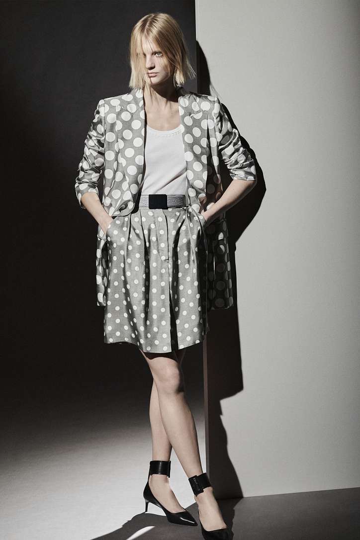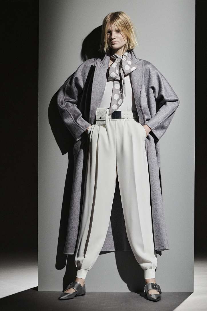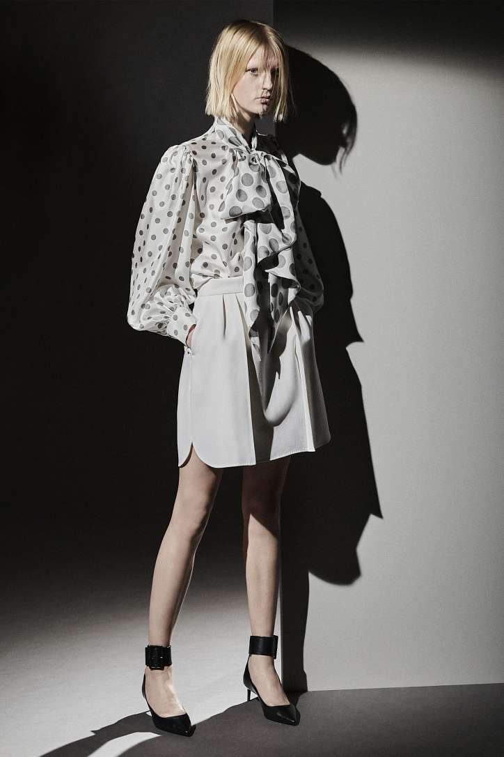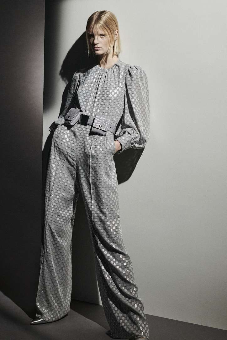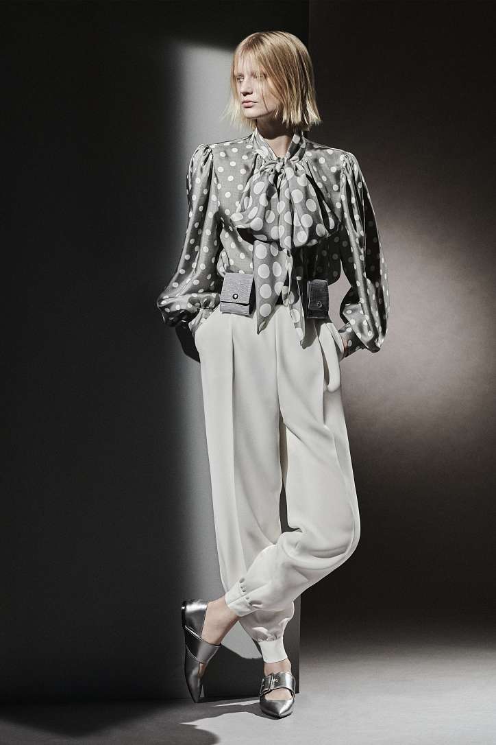 В небольшом лукбуке соседствуют романтические блузы с бантами и платья в горох (любимый принт Элизабет), широкие брюки с накладными карманами и юбки длиной до колена, объёмные пальто и плащи.