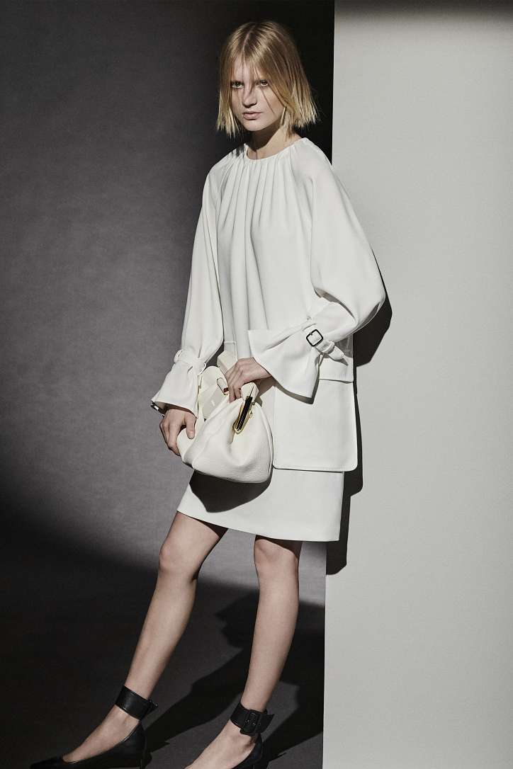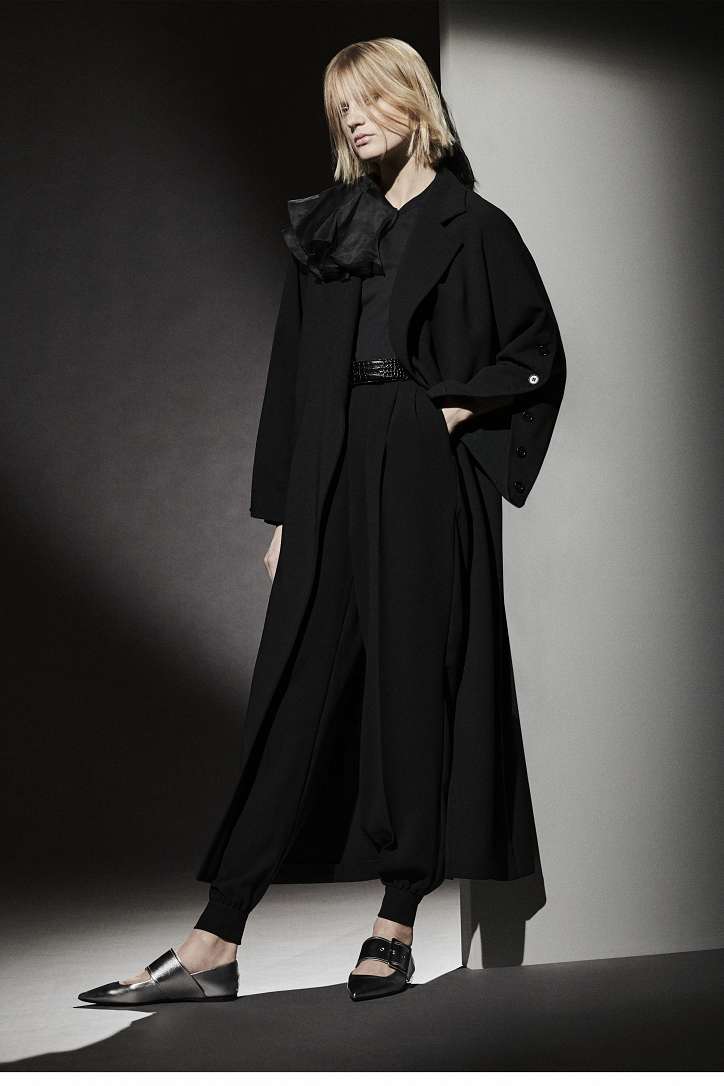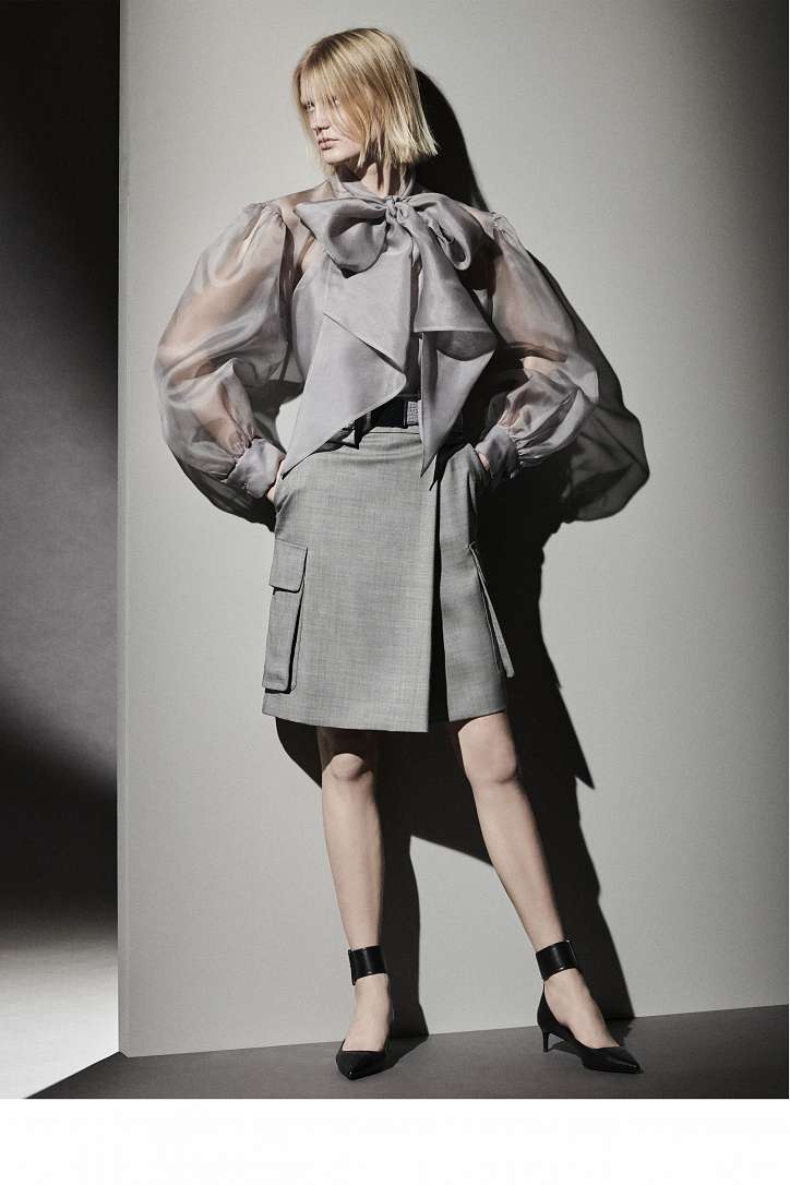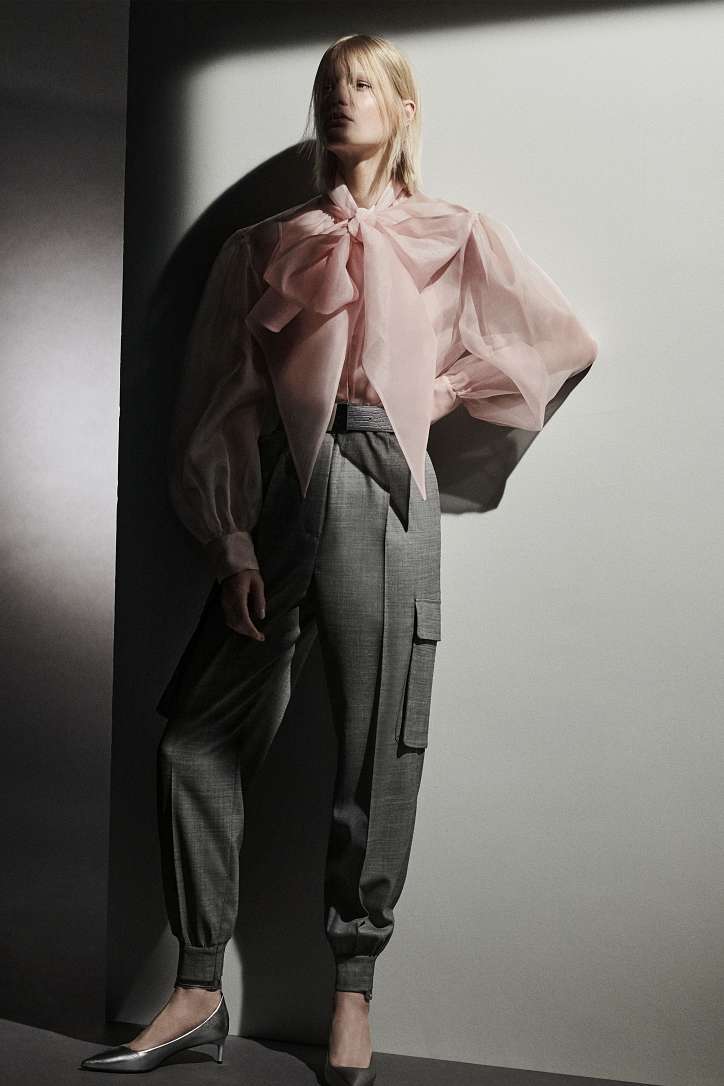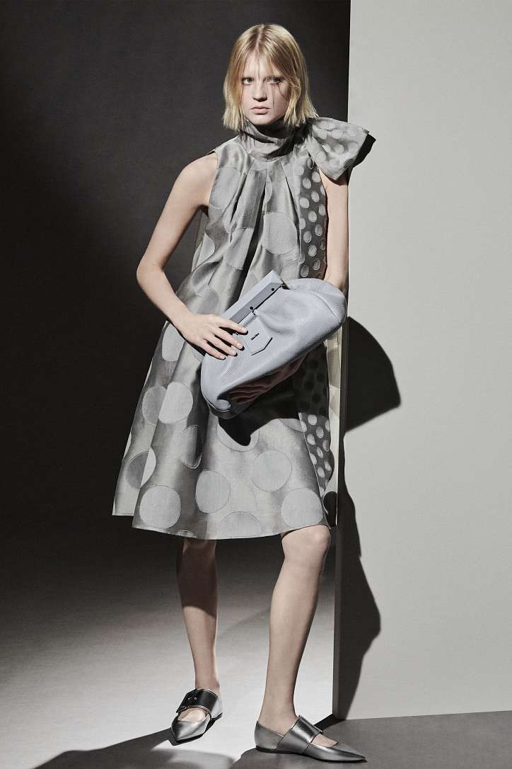 В небольшом лукбуке соседствуют романтические блузы с бантами и платья в горох (любимый принт Элизабет), широкие брюки с накладными карманами и юбки длиной до колена, объёмные пальто и плащи.