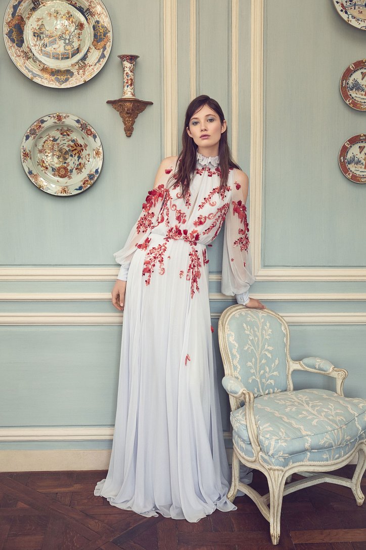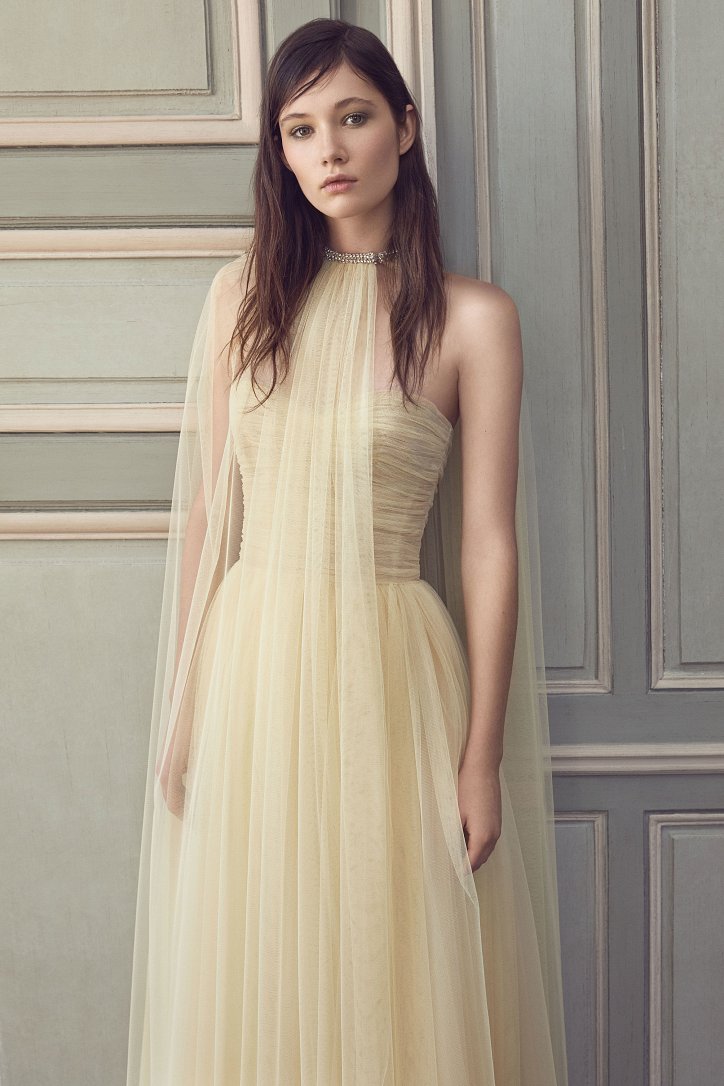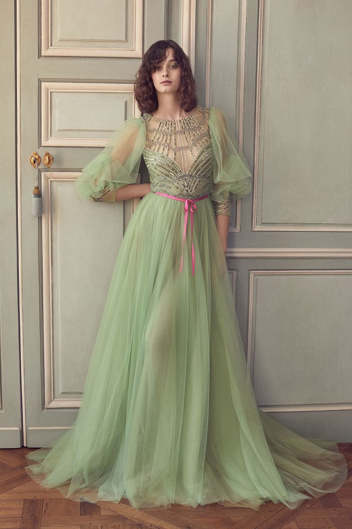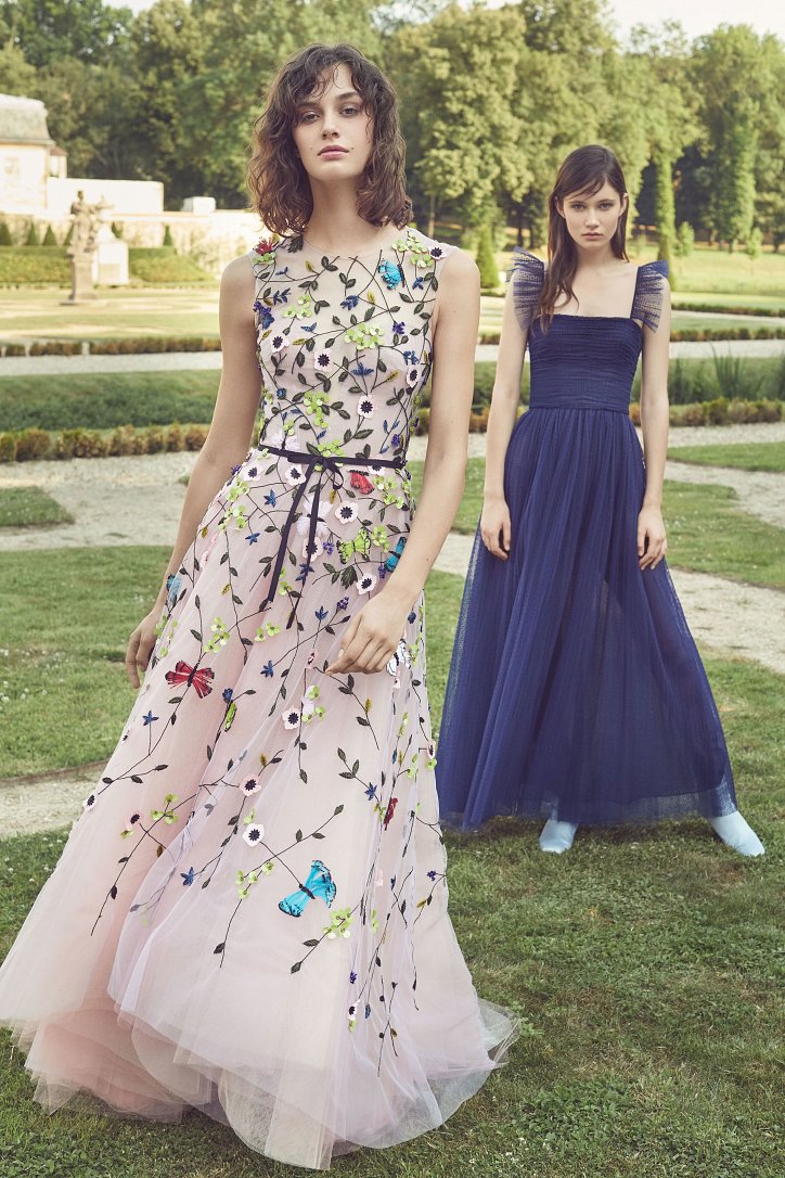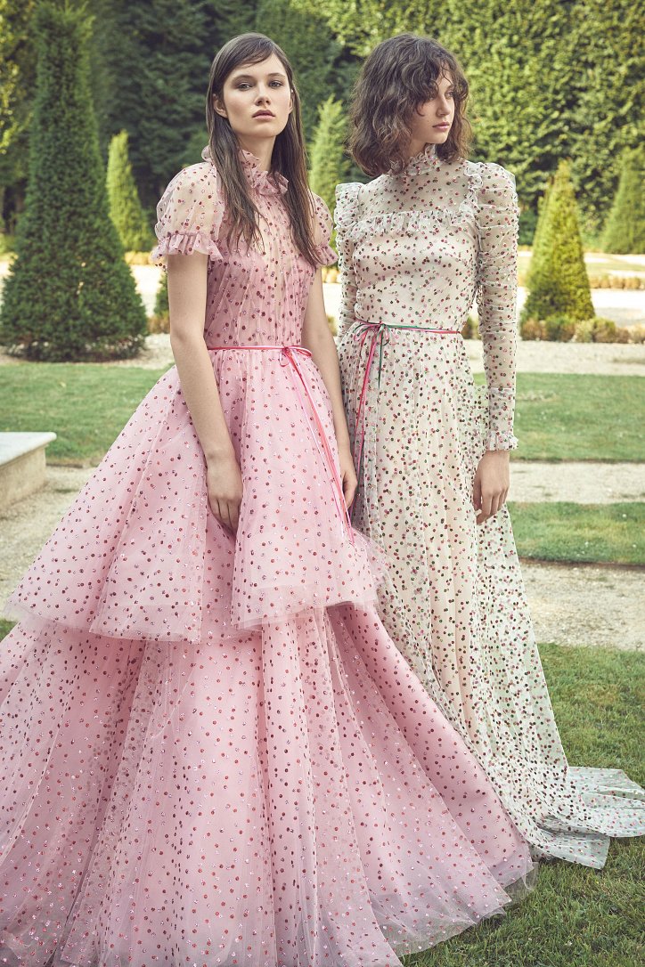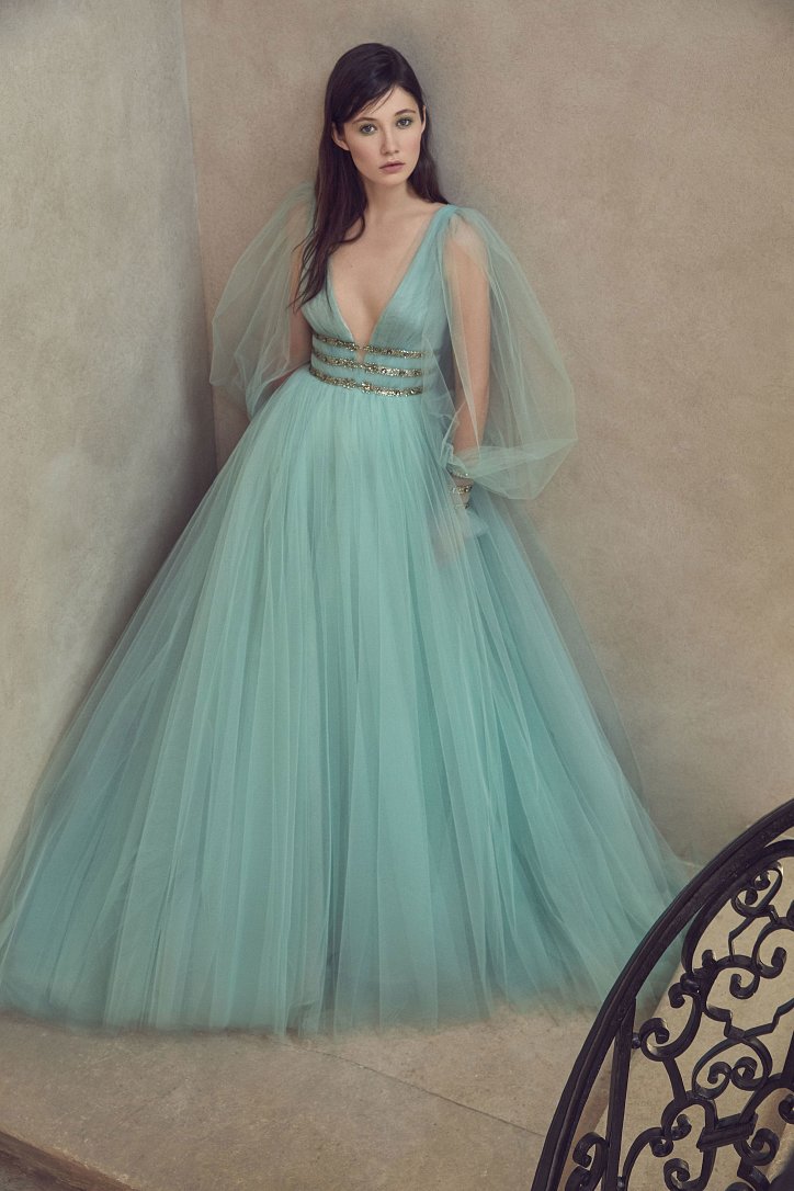 Классические вечерние модели – пышные бальные платья, «принцессы» и А-силуэт – соседствовали с платьями чайной длины, а нежная пастель и нюдовая палитра – с яркими и насыщенными оттенками бирюзы, свеклы и темно-синего цвета.