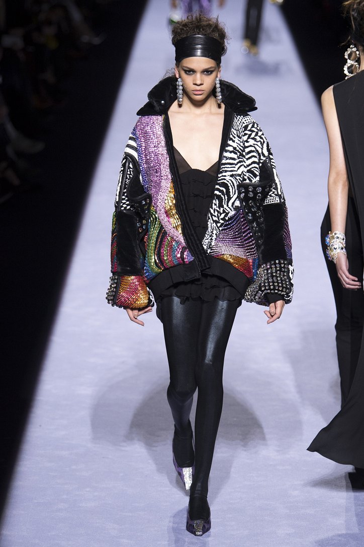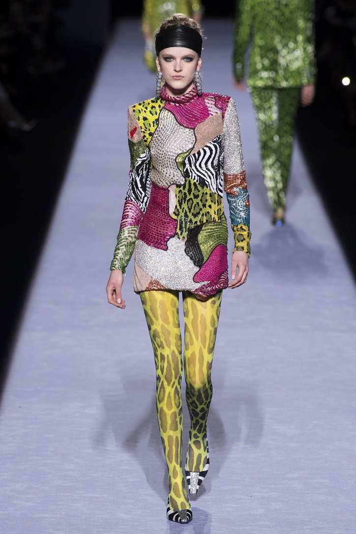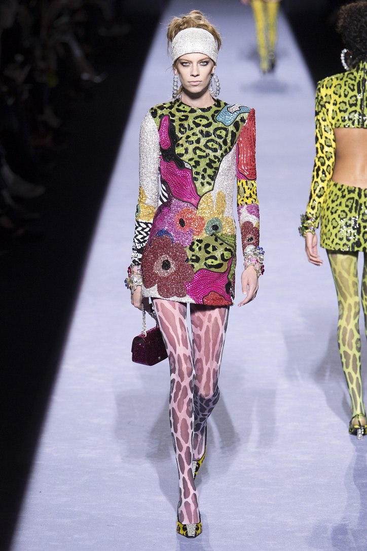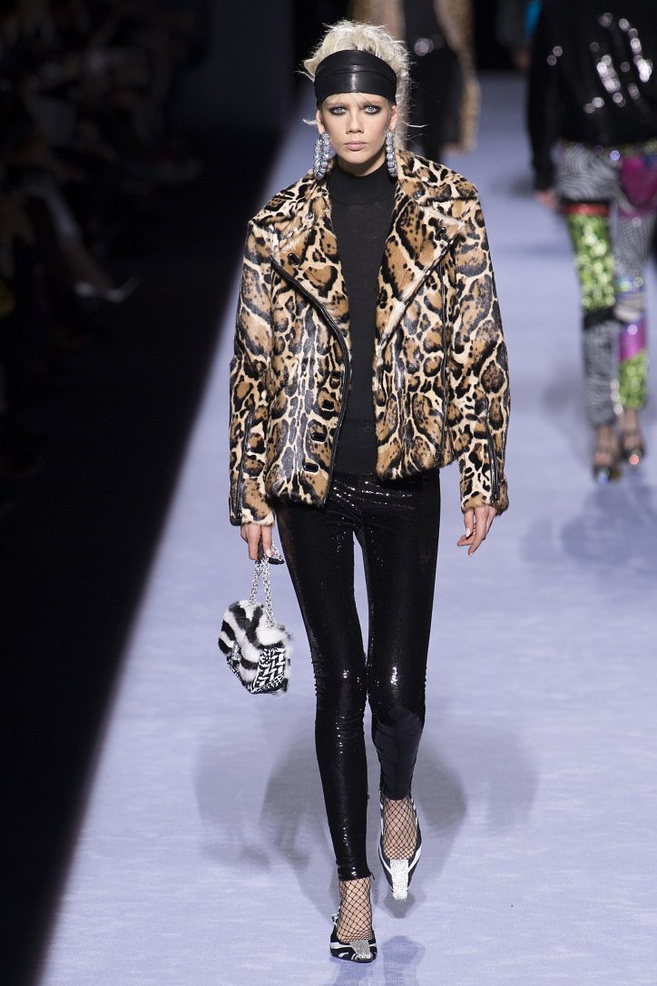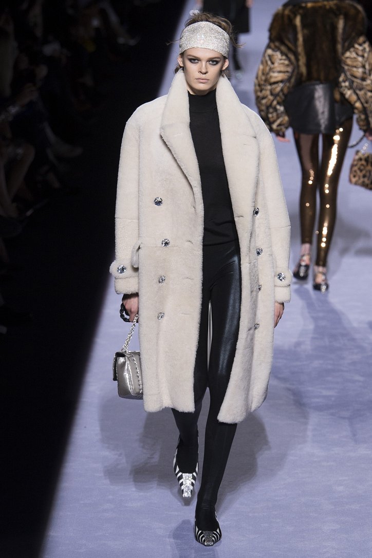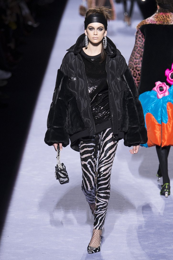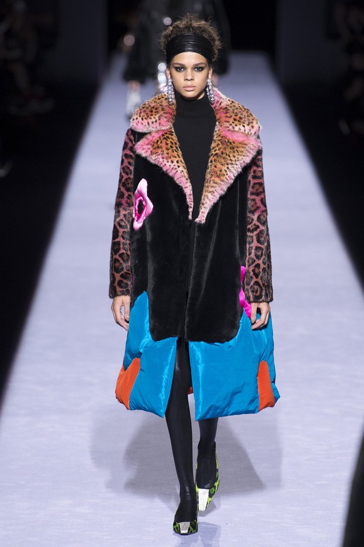 Скрестить шубу с пуховиком Тому Форду оказалось недостаточным. Даже если шуба была черная, а пуховик – ярко-голубой с оранжевыми вставками. Рукава и воротник дизайнер решил сделать «хищными» (причем хищники явно были разными), затем слегка затонировал мех розовым и добавил для полноты картины яркие цветы. Подобным образом выглядела и вся остальная коллекция Tom Ford осень-зима 2018-2019. Блестящие «золотые» леггинсы в ней сочетались с леопардовыми шубами, мех – с плащевкой, анималистические принты соседствовали с графикой по принципу колорблокинга, строгий черный двубортный жакет полагалось носить с серебристыми лосинами и поясом с блестящей пряжкой, а шифоновые мини-платья с красочными принтом «под леопарда» - с такими же «хищными» колготками – настоящее торжество 80-ых! Ярко, блестяще, хищно и смело!