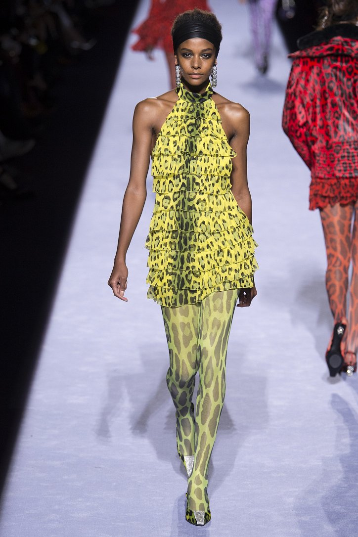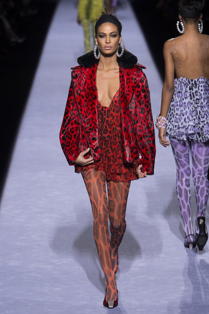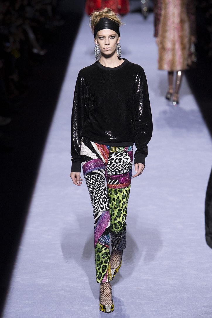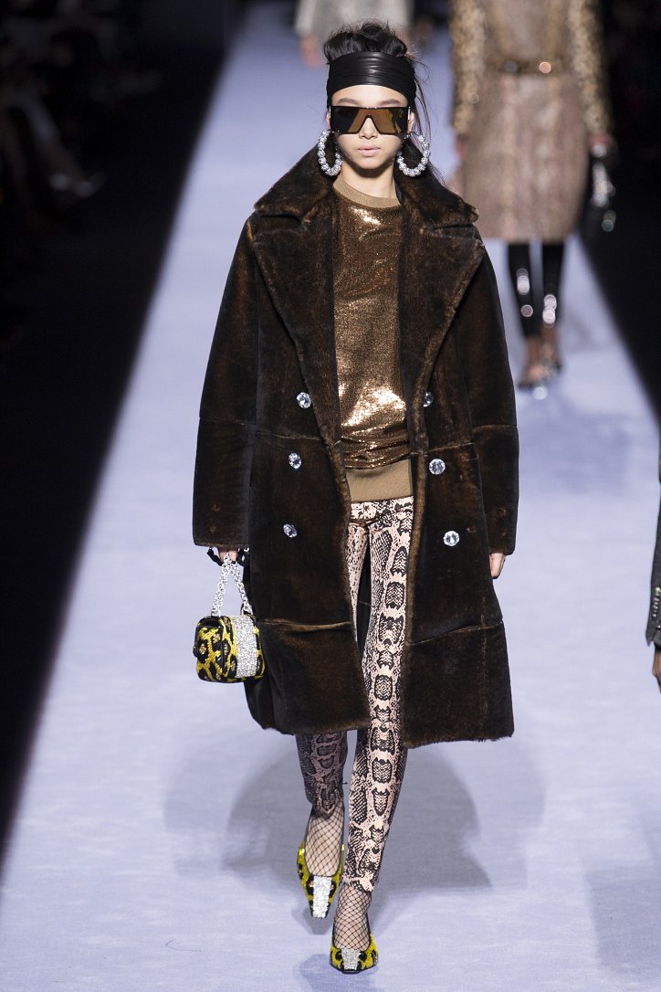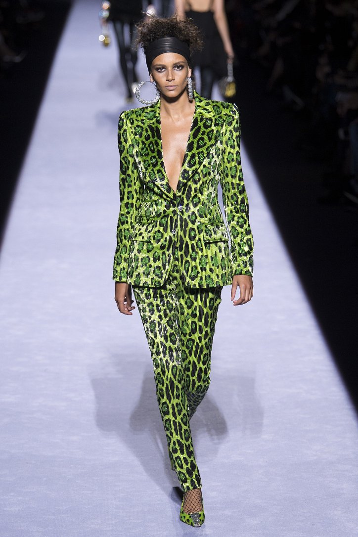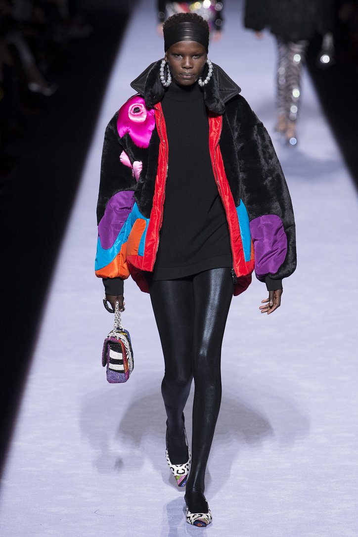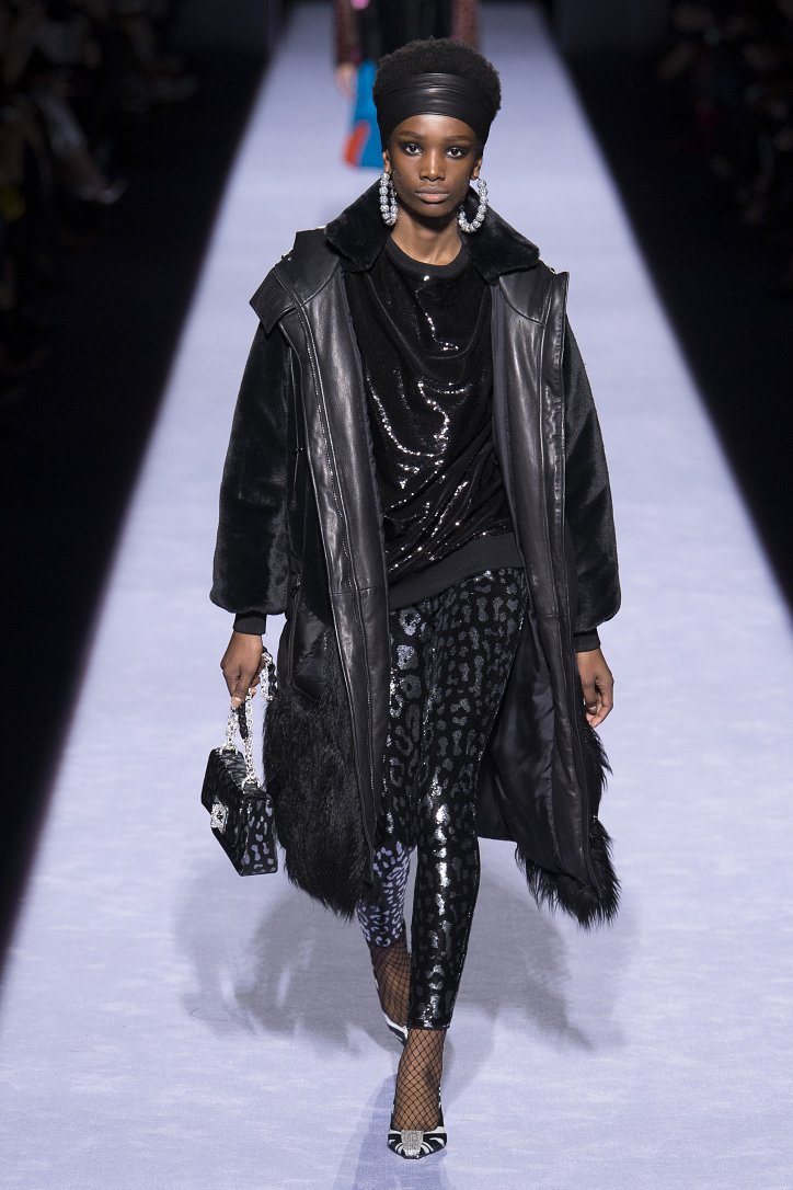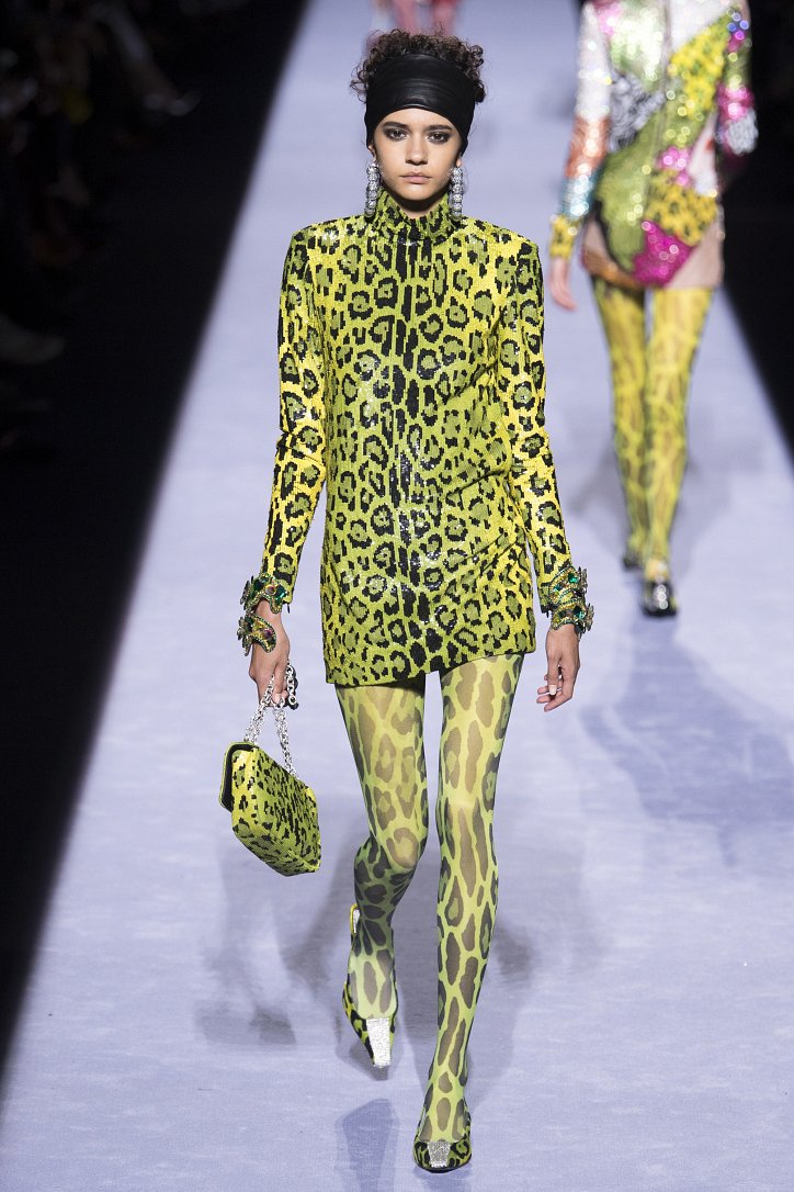 Скрестить шубу с пуховиком Тому Форду оказалось недостаточным. Даже если шуба была черная, а пуховик – ярко-голубой с оранжевыми вставками. Рукава и воротник дизайнер решил сделать «хищными» (причем хищники явно были разными), затем слегка затонировал мех розовым и добавил для полноты картины яркие цветы. Подобным образом выглядела и вся остальная коллекция Tom Ford осень-зима 2018-2019. Блестящие «золотые» леггинсы в ней сочетались с леопардовыми шубами, мех – с плащевкой, анималистические принты соседствовали с графикой по принципу колорблокинга, строгий черный двубортный жакет полагалось носить с серебристыми лосинами и поясом с блестящей пряжкой, а шифоновые мини-платья с красочными принтом «под леопарда» - с такими же «хищными» колготками – настоящее торжество 80-ых! Ярко, блестяще, хищно и смело!